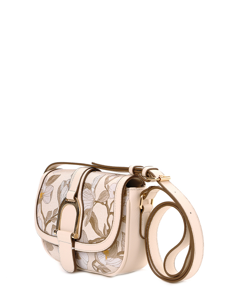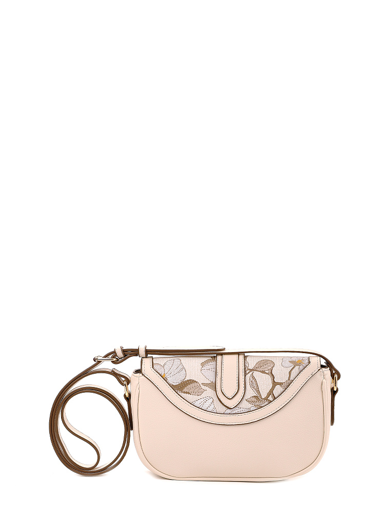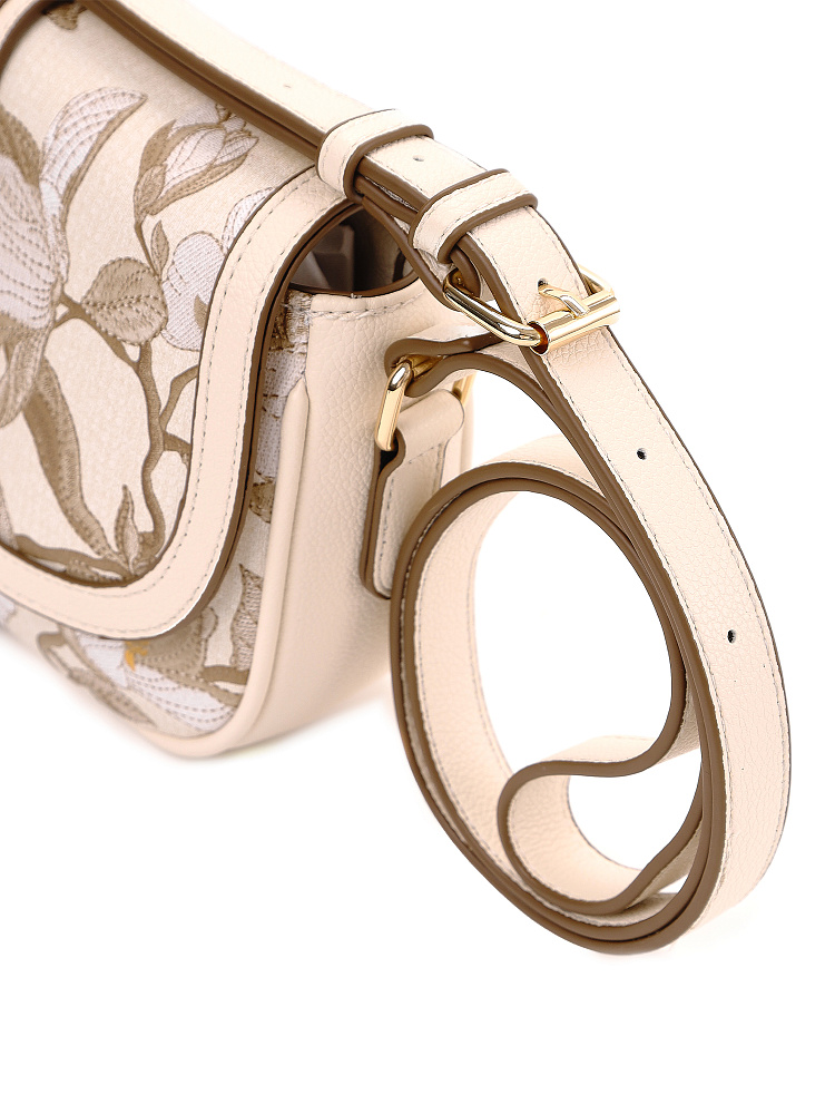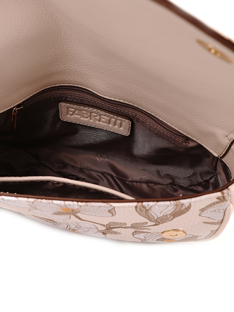 Небольшая женская сумка кросс-боди из коллекции итальянского бренда FABRETTI идеально подойдет для романтичного образа на теплый сезон. Округлая сумочка с клапаном на двух магнитах выполнена из мелкозернистой экокожи светло-бежевого оттенка и украшена роскошным рисунком цветущих магнолий. Края оформлены коричневым кантом; на клапане декоративный ремень с крупной металлической пряжкой.У сумки одно отделение с открытым карманом и карманом на молнии. Узкий плечевой ремень регулируется по длине при помощи пряжки.Длина ремня ок. 125 см. Цвет фурнитуры – золото.