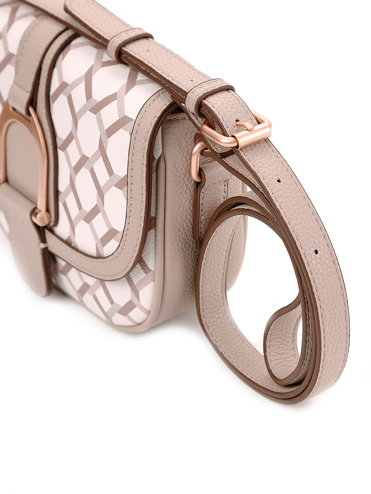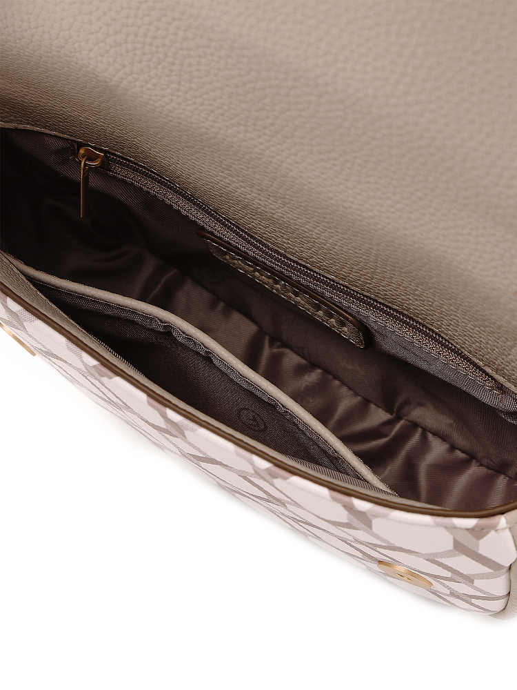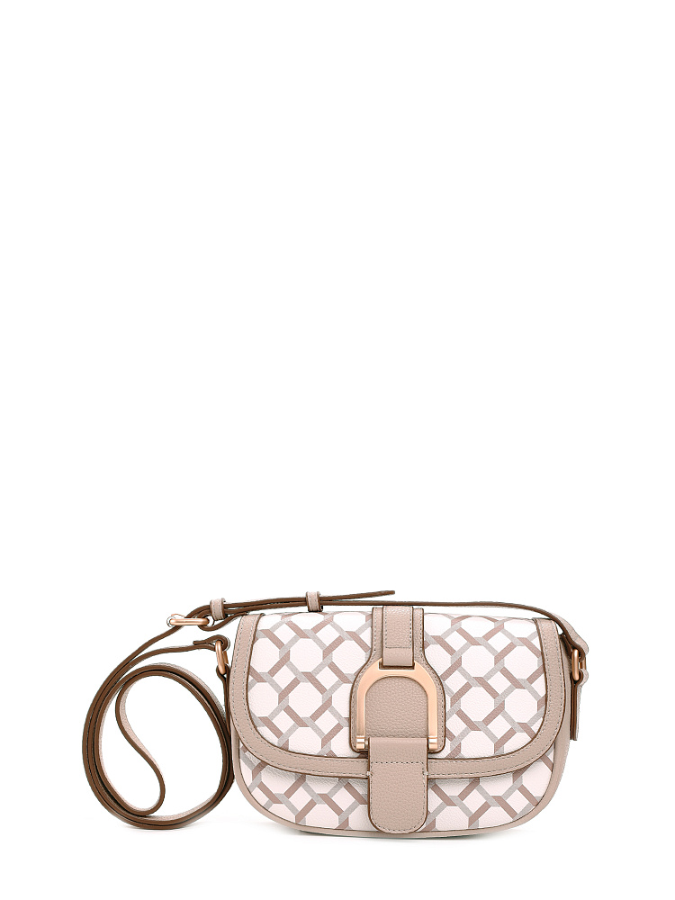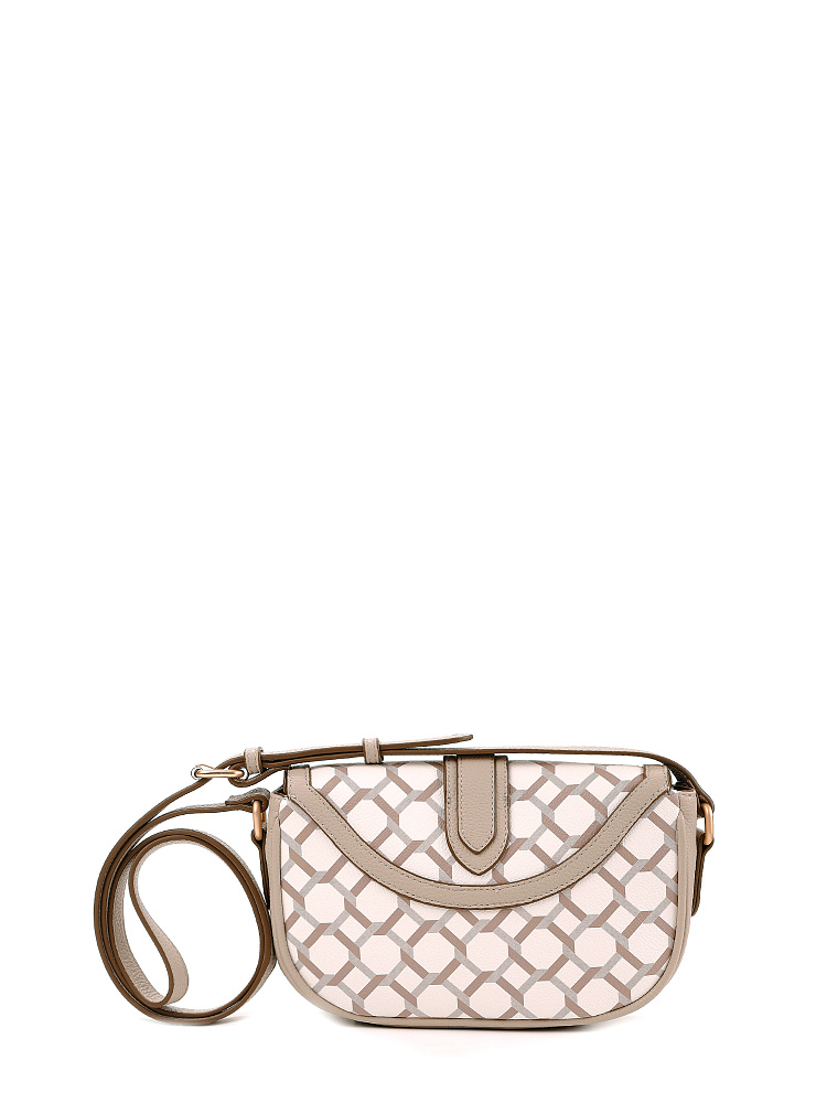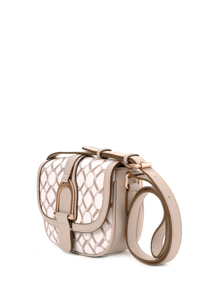 Небольшая женская сумка кросс-боди из коллекции итальянского бренда FABRETTI идеально подойдет для повседневного образа на теплый сезон. Округлая сумочка с клапаном на двух магнитах выполнена из мелкозернистой экокожи светло-бежевого оттенка и украшена лаконичным геометрическим узором. Края оформлены коричневым кантом; на клапане декоративный ремень с крупной металлической пряжкой.Сумка с со строгим узором делает образ более сложным, но одновременно структурирует его. Этот аксессуар привлекает внимание и может стать эффектным акцентом с однотонным костюмом.У сумки одно отделение с открытым карманом и карманом на молнии. Узкий плечевой ремень регулируется по длине при помощи пряжки.Длина ремня ок. 125 см. Цвет фурнитуры – матовое золото.