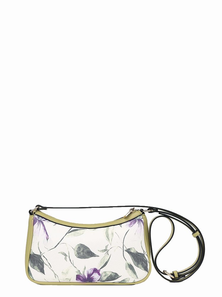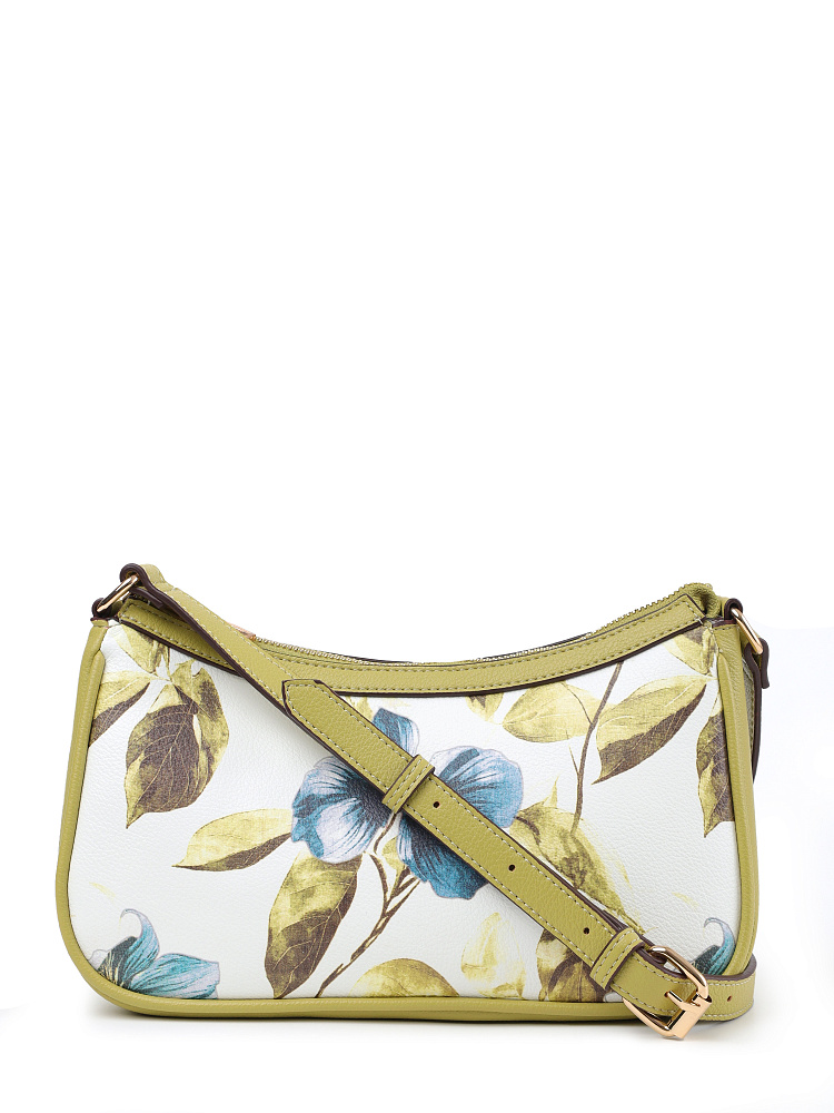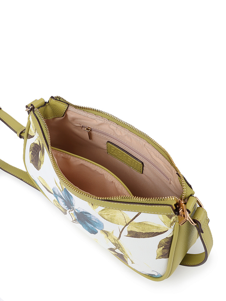 Небольшая женская сумка кросс-боди итальянского бренда FABRETTI из высококачественной экокожи белого цвета с зернистой фактурой и растительными принтами. Прекрасно подходит для летнего гардероба, одежды светлых, зеленых, природных тонов.У сумки одно отделение на молнии, внутри открытый карман и на молнии. Модель украшена узором из пастельных голубых цветов и листьев. Плечевой ремень регулируется по длине пряжкой.Цвет фурнитуры – золото.