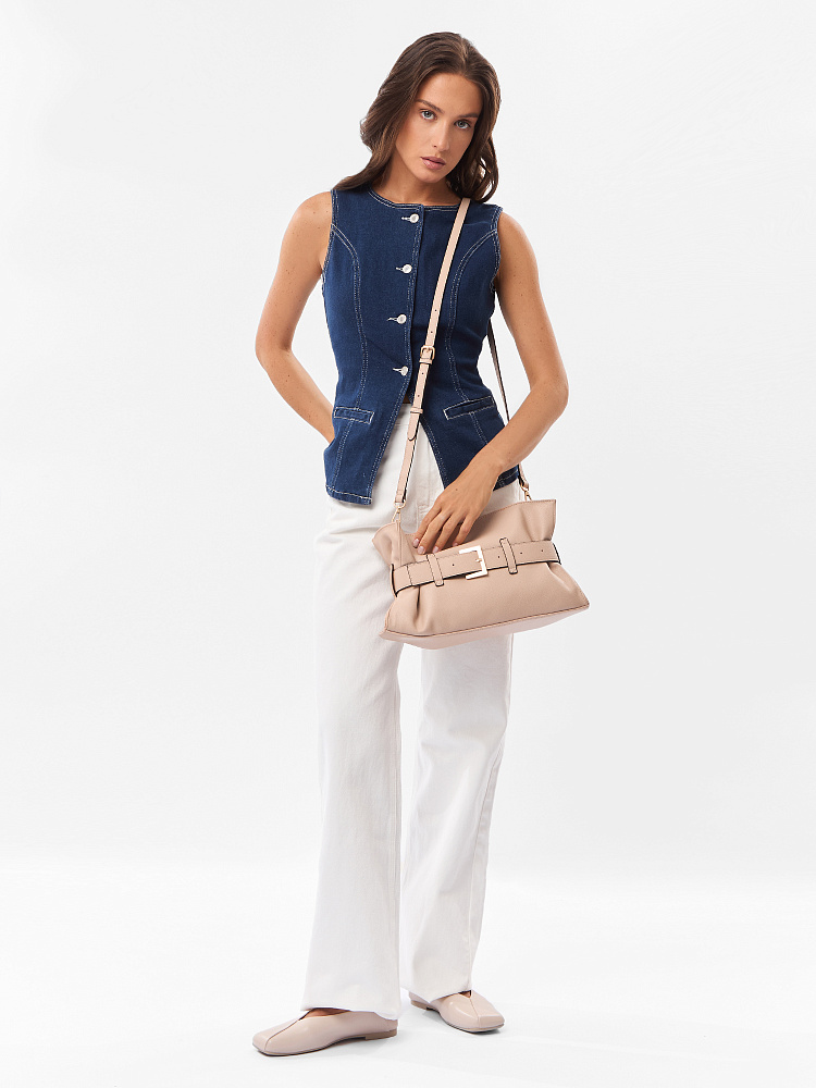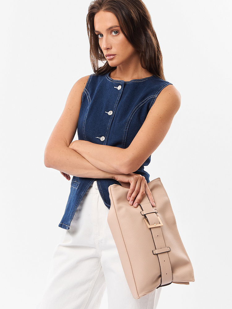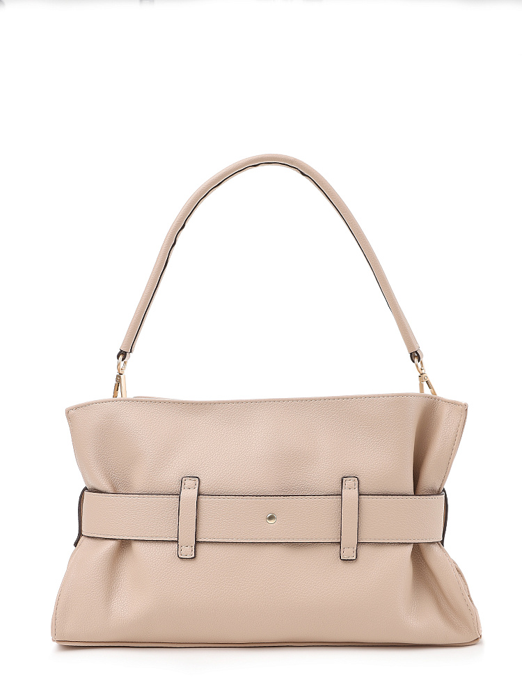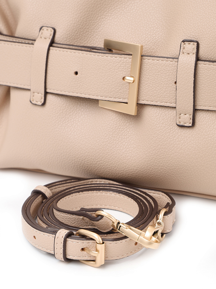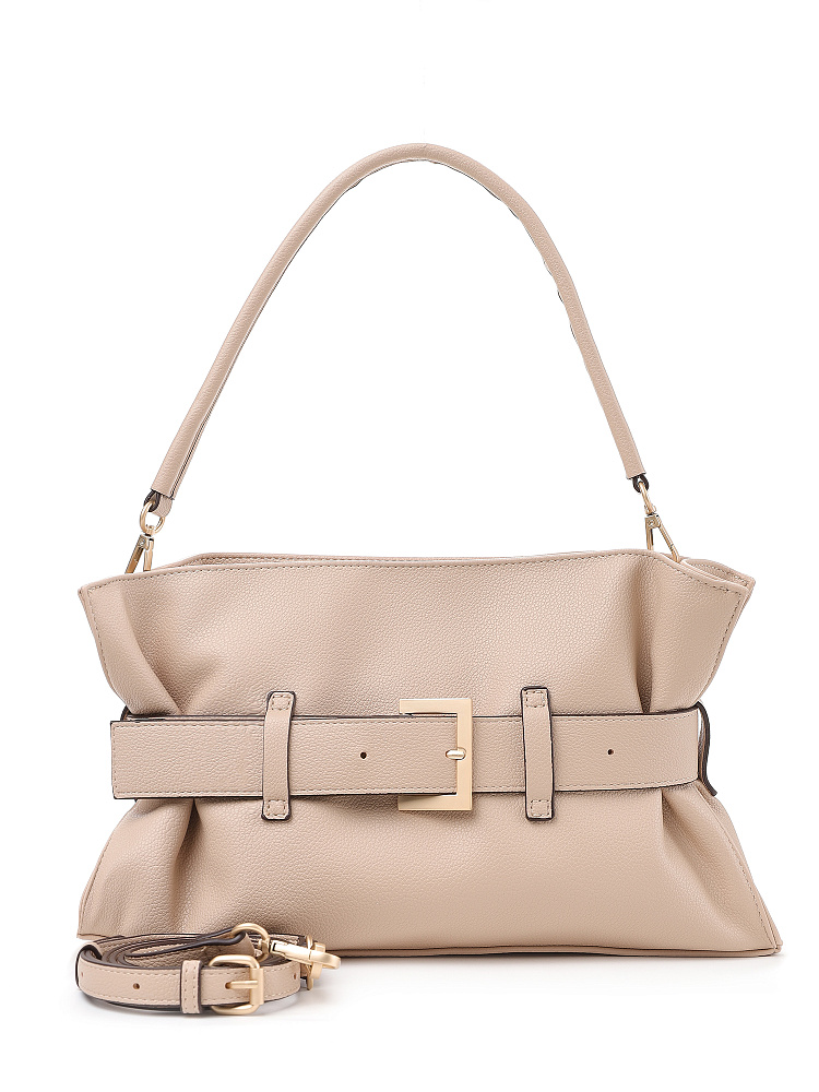 Необычная женская сумка кросс-боди итальянского бренда FABRETTI из мягкой экокожи розовато-бежевого, «нюдового» цвета с зернистой фактурой делает образ более оригинальным благодаря своей нестандартной форме. Декоративный ремень, проходящий по центру сумки, создает классическую форму сумки-кисета. Объем сумки легко регулируется пряжкой цвета матовое золото.Основное отделение закрывается на молнию, имеет два внутренних кармана – открытый и на молнии. Модель дополнена двумя видами съемных ручек на карабинах – короткой ручкой для ношения в руках и длинным плечевым ремнем с пряжкой.Длина ремня ок. 130 см. Цвет фурнитуры – золото.