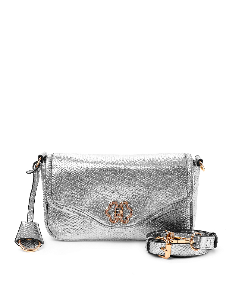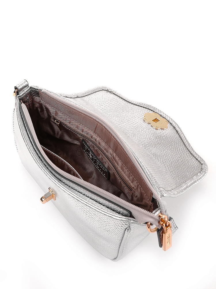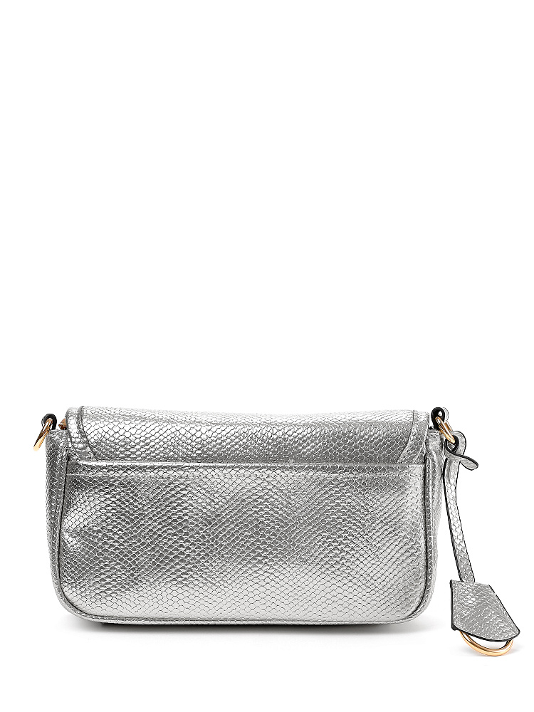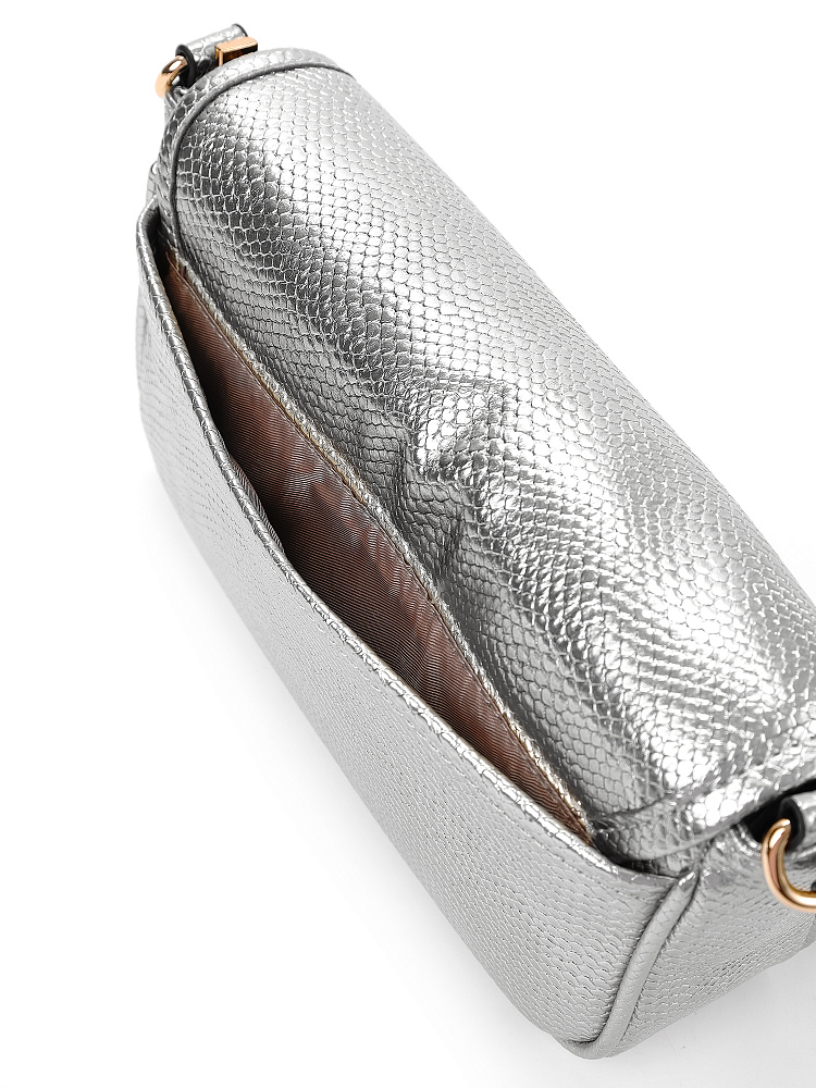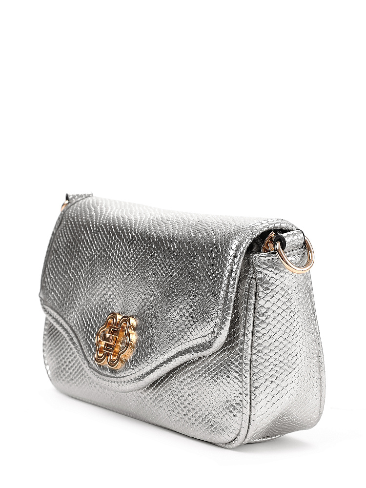 Эффектная серебристая женская сумка кросс-боди с клапаном итальянского бренда FABRETTI из экокожи с тиснением под шкуру рептилии. Великолепный вариант для дерзкого современного образа; отлично сочетается с однотонной одеждой классического стиля или позволяет создать трендовые неформальные образы, построенные на контрасте фактур материалов. Сумка может быть использована в качестве клатча.У модели мягкий прямоугольный силуэт, клапан дополнен поворотным замком с металлической пряжкой. Жесткий каркас четко держит форму. На тыльной стороне открытый карман быстрого доступа. Сумка дополнена съемным брелоком.Основное отделение закрывается молнией. Внутри небольшой карман на молнии и открытый карман.Узкий съемный плечевой ремень на карабинах регулируется по длине при помощи пряжки.Длина ремня ок. 125 см. Цвет фурнитуры – золото.