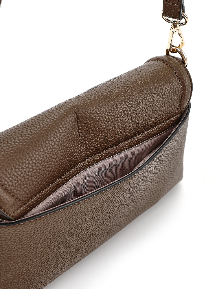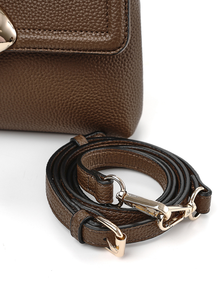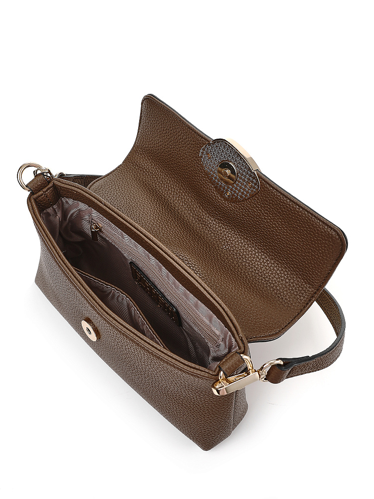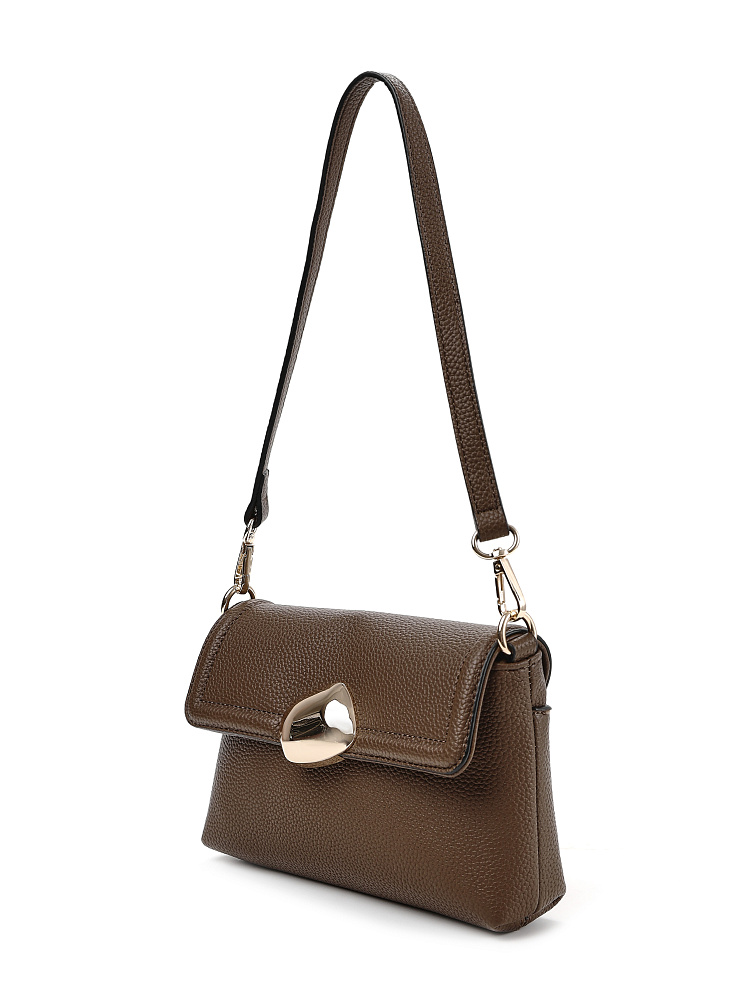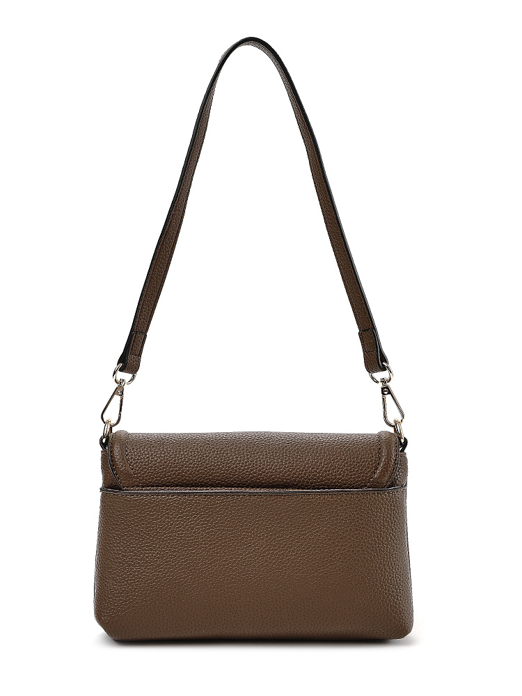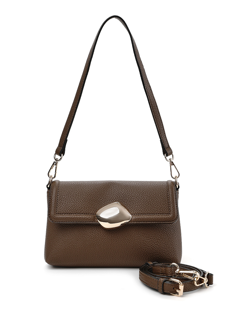 Лаконичная городская сумка кросс-боди итальянского бренда FABRETTI из высококачественной экокожи шоколадного оттенка с зернистой фактурой. Простой классический дизайн делает модель универсальным аксессуаром под любой образ, эффектным акцентом служит объемная металлическая вставка на клапане сумки.У сумки прямоугольный силуэт с черной отделкой краев. Внутри одно отделение с двумя карманами – на молнии и открытым. Один вместительный открытый карман расположен на тыльной стороне сумки.Модель дополнена двумя съемными ручками на карабинах – короткой для ношения в руках или на плече и узким ремешком с пряжкой.Длина ремня ок. 125см. Цвет фурнитуры – светлое золото.