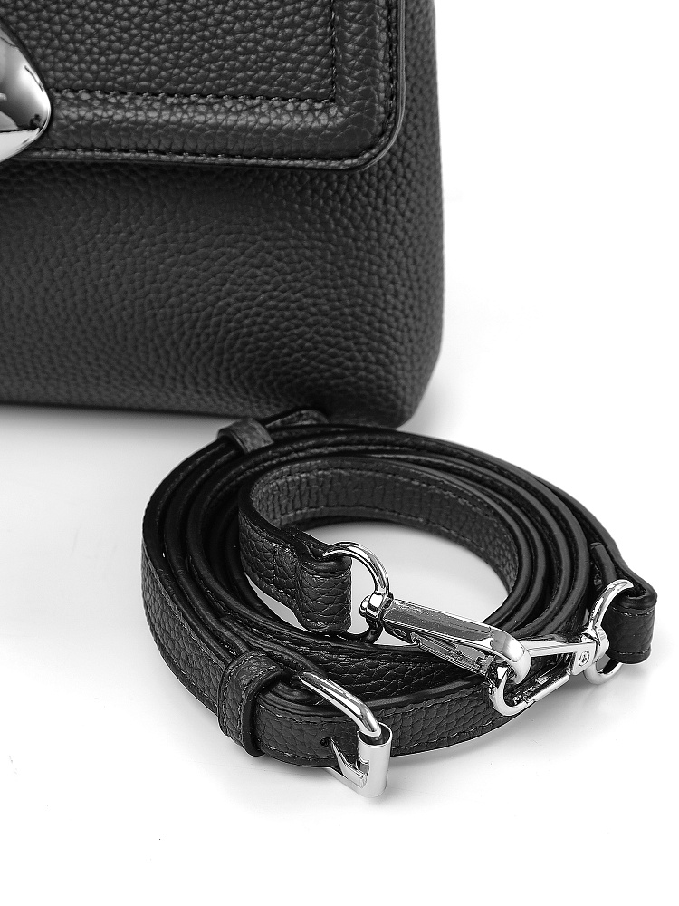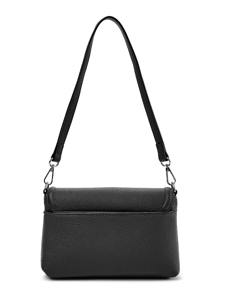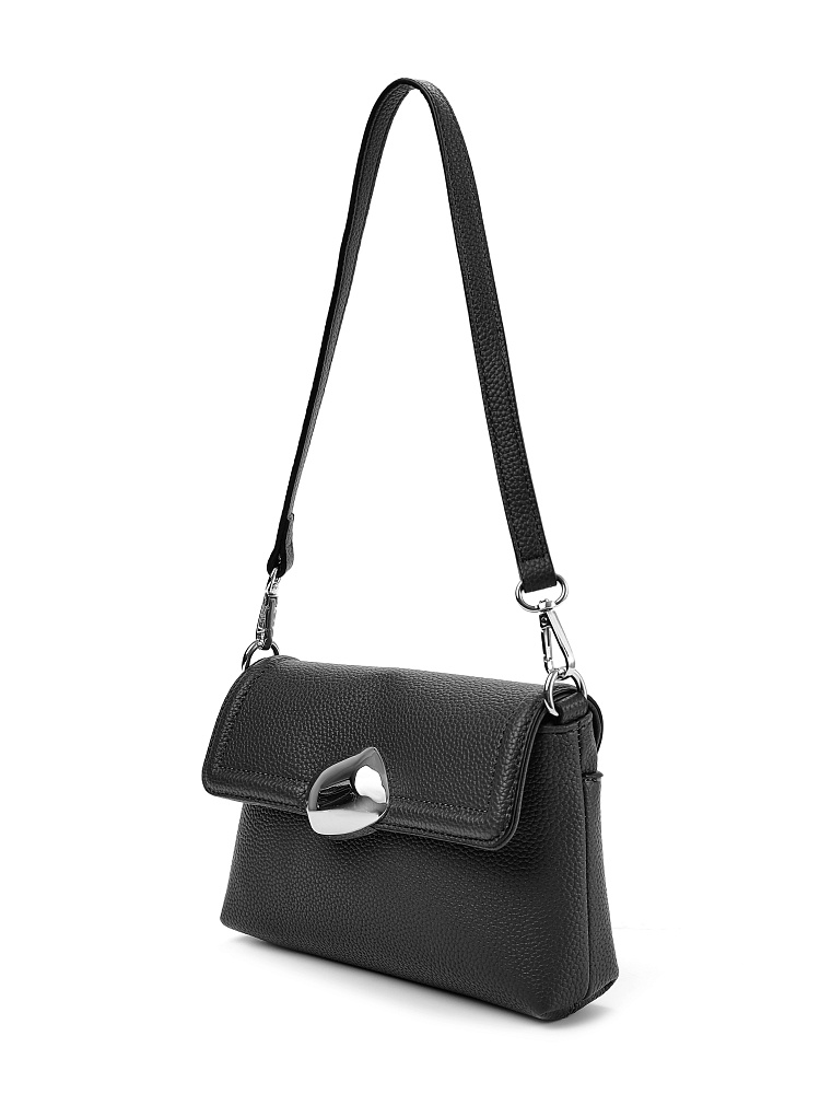 Лаконичная городская сумка кросс-боди итальянского бренда FABRETTI из высококачественной экокожи черного цвета с зернистой фактурой. Простой классический дизайн делает модель универсальным аксессуаром под любой образ, эффектным акцентом служит объемная металлическая вставка на клапане сумки.У сумки прямоугольный силуэт с черной отделкой краев. Внутри одно отделение с двумя карманами – на молнии и открытым. Один вместительный открытый карман расположен на тыльной стороне сумки.Модель дополнена двумя съемными ручками на карабинах – короткой для ношения в руках или на плече и узким ремешком с пряжкой.Длина ремня ок. 125см. Цвет фурнитуры – серебро.