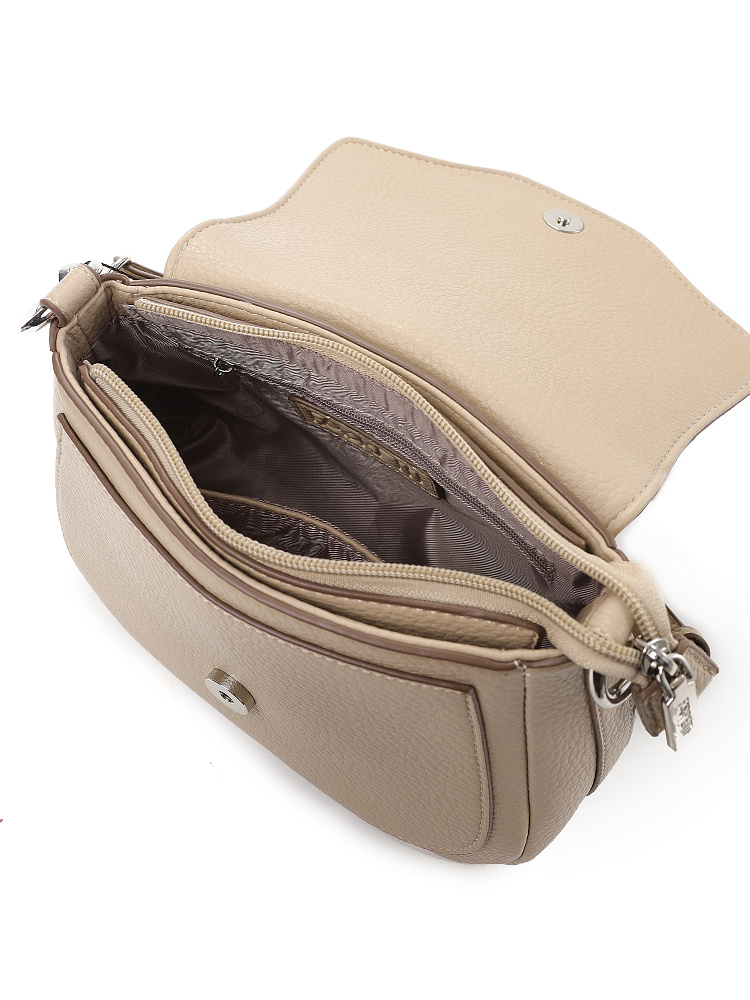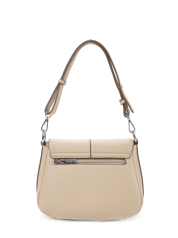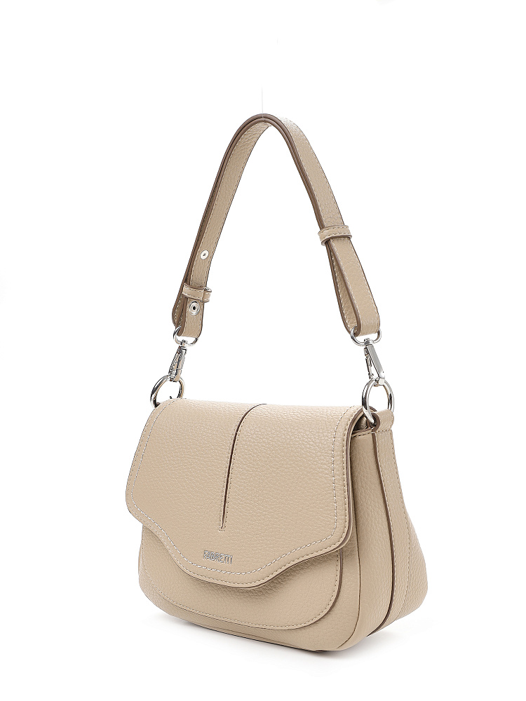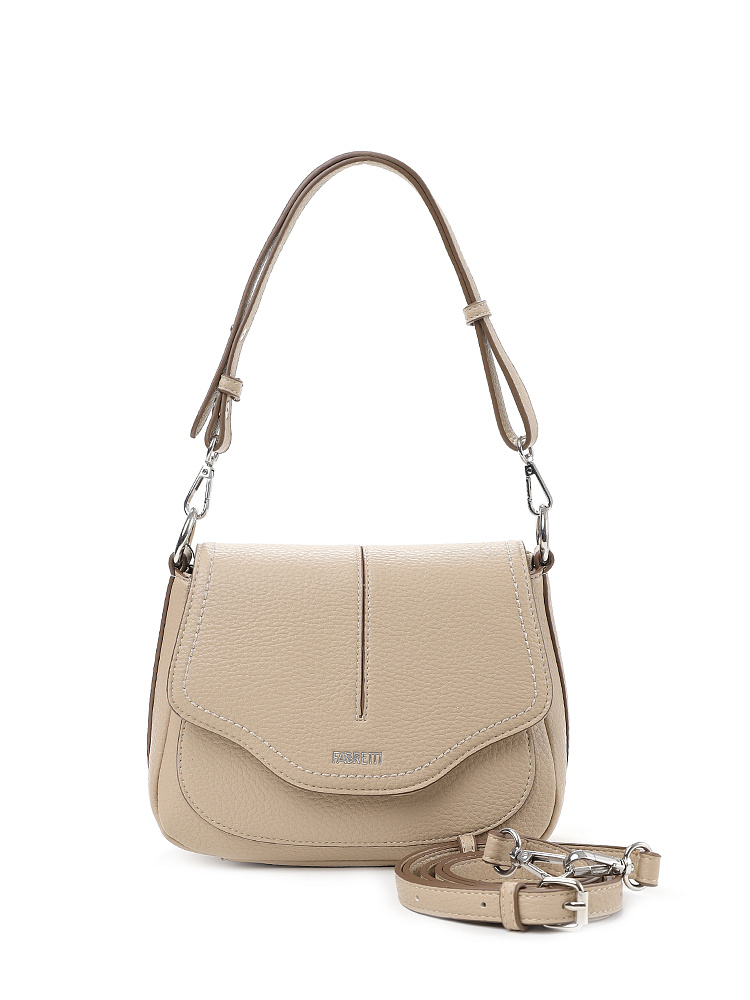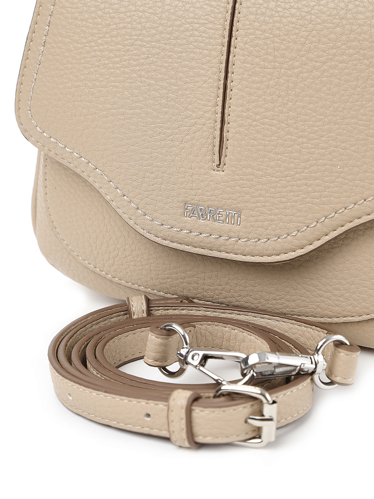 Необычная женская сумка кросс-боди с клапаном итальянского бренда FABRETTI из высококачественной зернистой экокожи песочно-бежевого оттенка.Сумка в форме трапеции с фигурным клапаном на магнитном замке отлично подойдет для летних образов, как в романтическом стиле или бохо, так и к повседневной городской одежде.Основное отделение на молнии, внутри открытый карман и на молнии. На тыльной стороне карман быстрого доступа на молнии. Клапан украшен декоративной отстрочкой и небольшим логотипом, под клапаном открытый накладной карман. Срезы оформлены светло-коричневым кантом.Модель дополнена съемными регулируемым узким ремнем с пряжкой и короткой регулируемой ручкой на карабинах.Длина ремня ок. 125 см. Цвет фурнитуры – серебро.