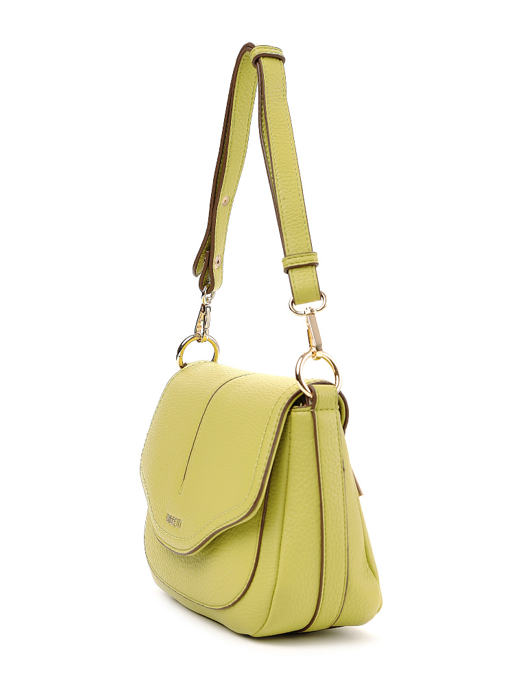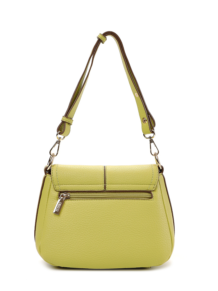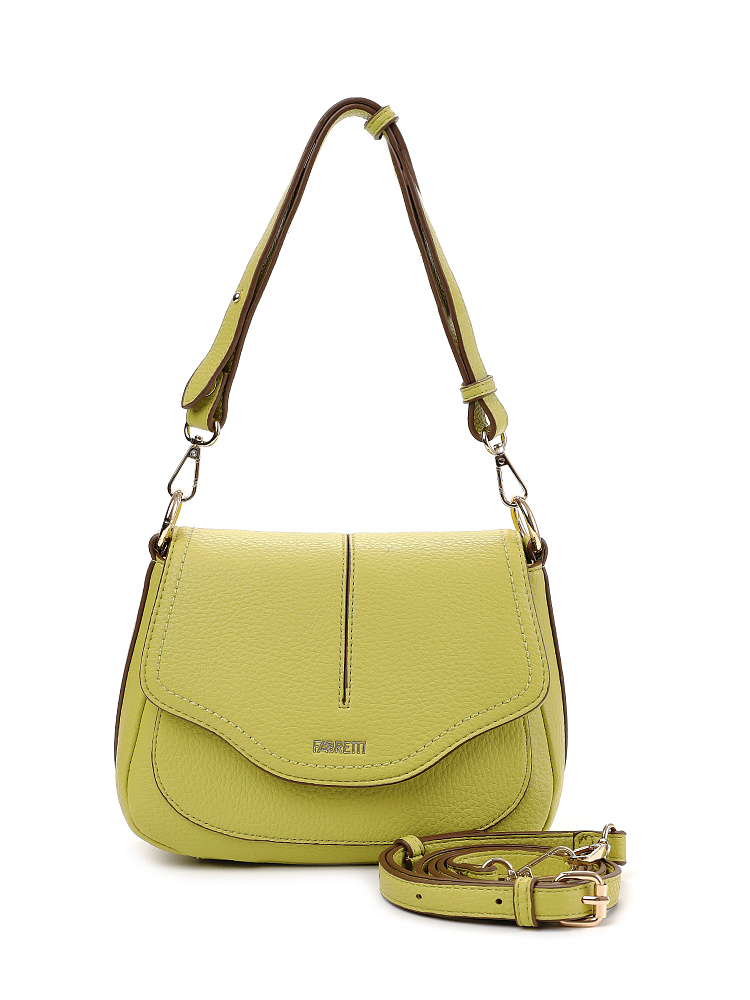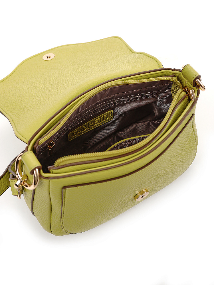 Необычная женская сумка кросс-боди с клапаном итальянского бренда FABRETTI из высококачественной зернистой экокожи нежного оттенка зеленого горошка.Сумка в форме трапеции с фигурным клапаном на магнитном замке отлично подойдет для летних образов, как в романтическом стиле или бохо, так и к повседневной городской одежде.Основное отделение на молнии, внутри открытый карман и на молнии. На тыльной стороне карман быстрого доступа на молнии. Клапан украшен декоративной отстрочкой и небольшим логотипом, под клапаном открытый накладной карман. Срезы оформлены коричневым кантом.Модель дополнена съемными регулируемым узким ремнем с пряжкой и короткой регулируемой ручкой на карабинах.Длина ремня ок. 125 см. Цвет фурнитуры – золото.