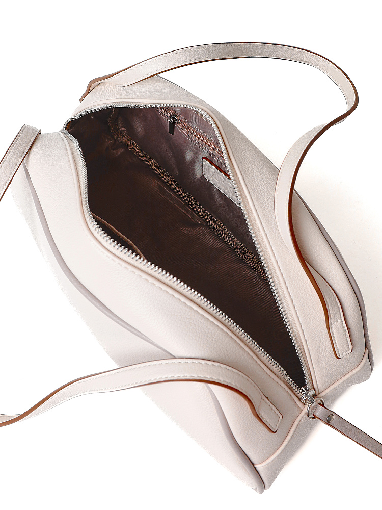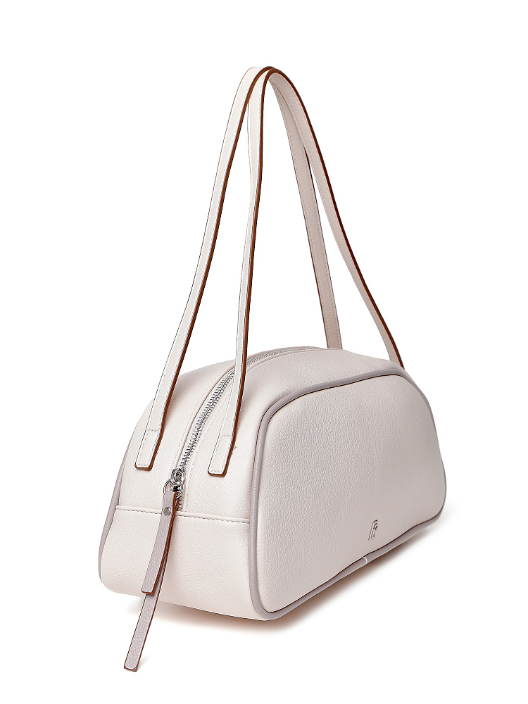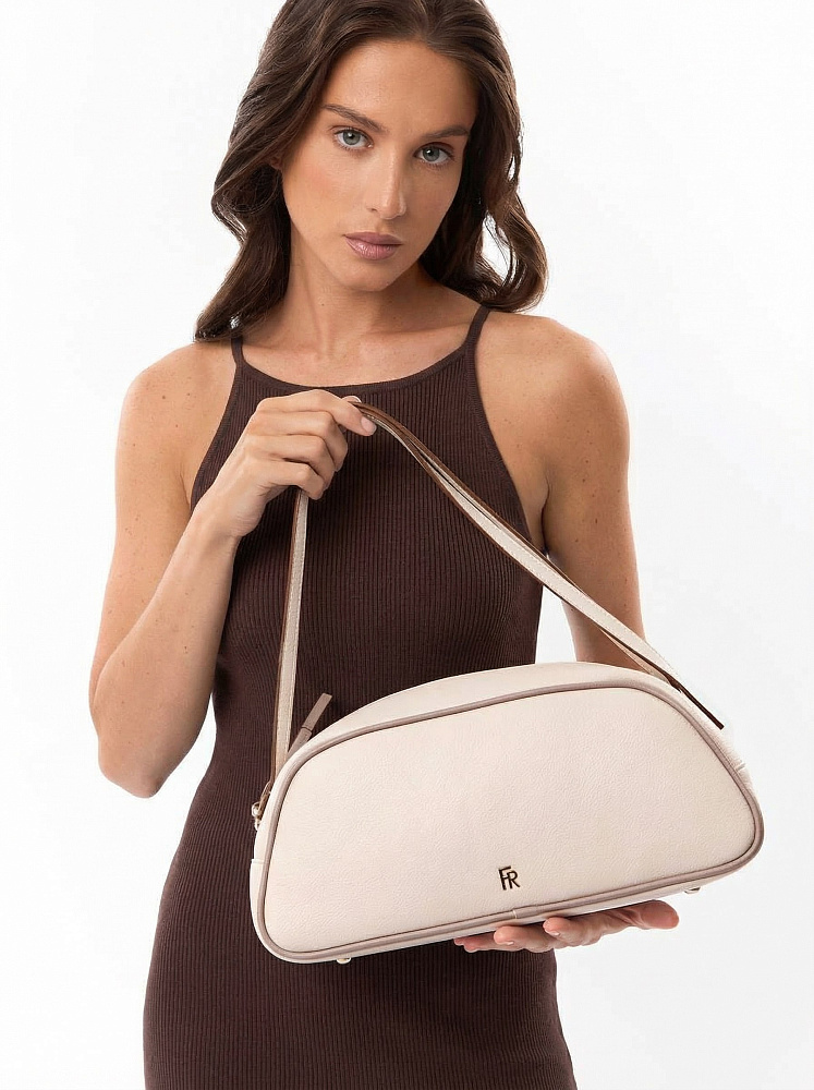 Удобная городская сумка багет итальянского бренда FABRETTI из очень светло-бежевой зернистой экокожи подойдет и для стиля кэжуал, и для динамичных спортивных образов. У модели форма вытянутой трапеции, одно отделение на молнии и узкие и короткие плечевые ручки.Внутри один открытый карман и один на молнии. На тыльной стороне карман быстрого доступа. На лицевой – металлический логотип. Края сумки отделаны светло-серым кантом, который помогает каркасу держать форму. На основной молнии длинный поводок из экокожи.Цвет фурнитуры – серебро.