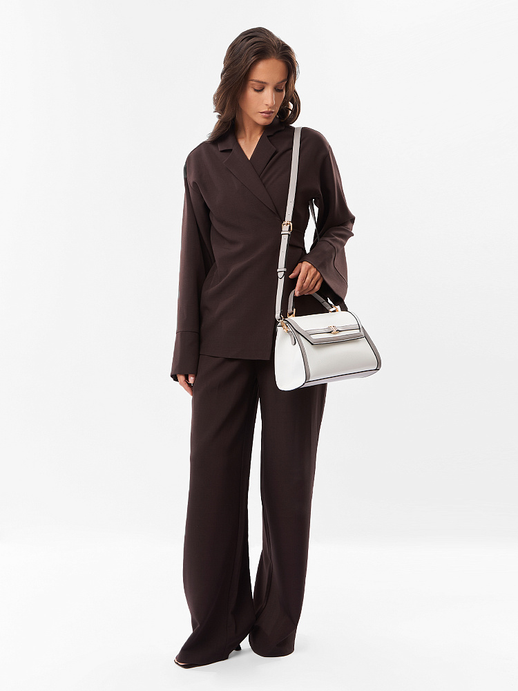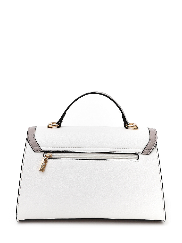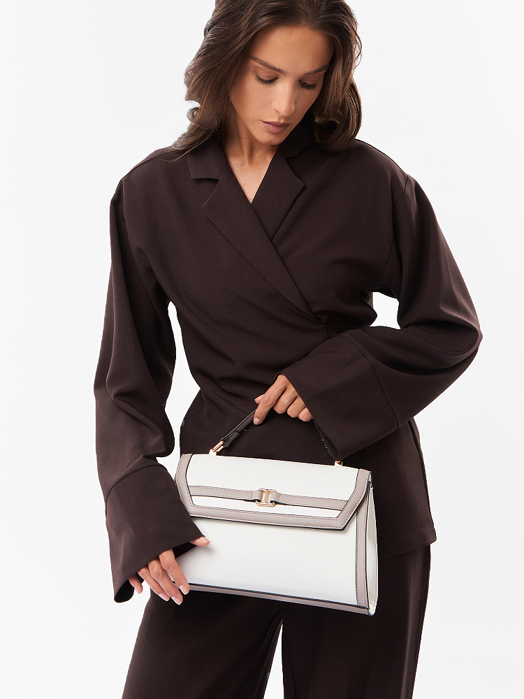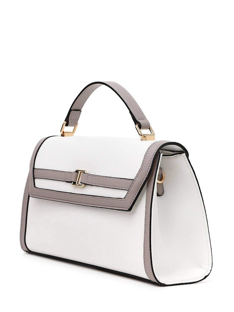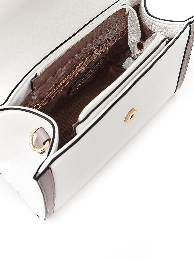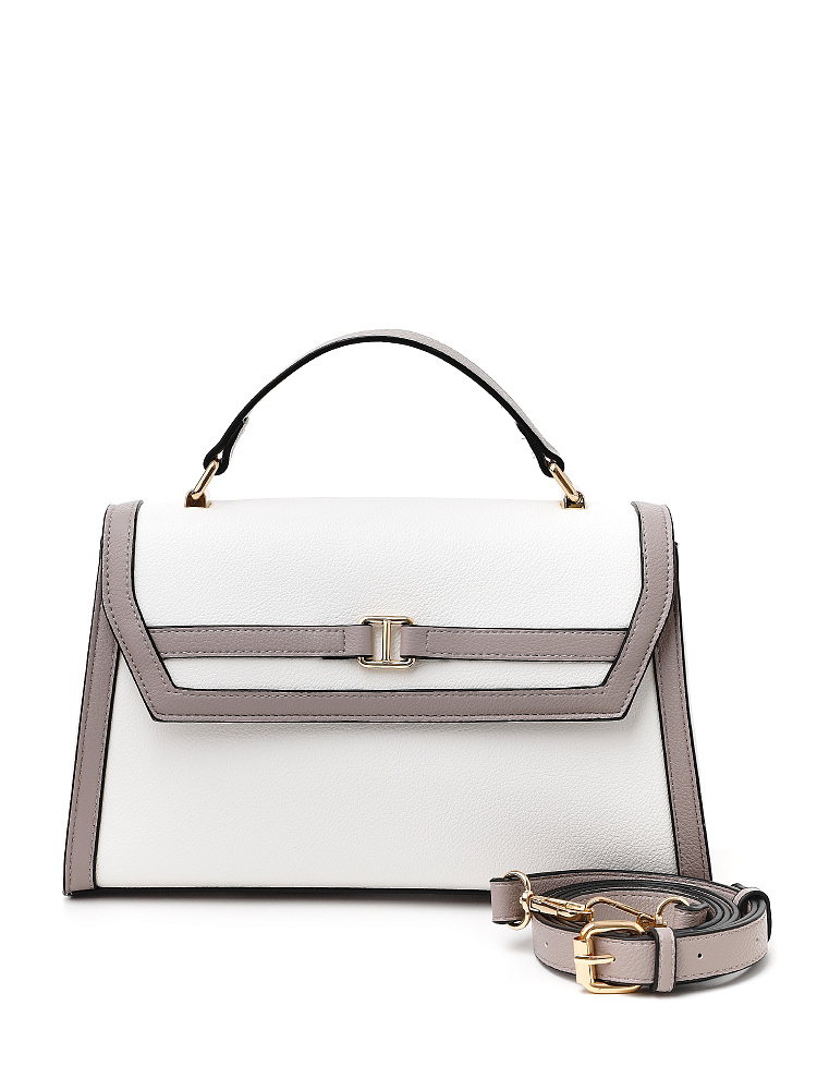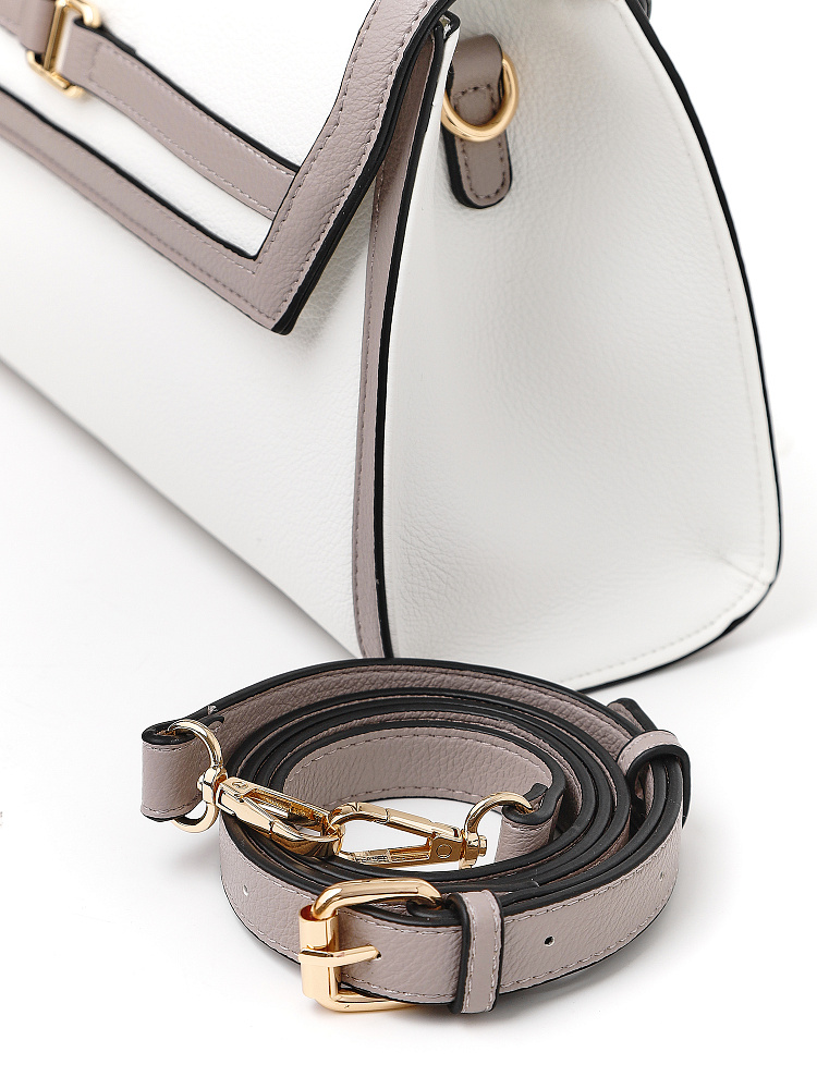 Лаконичная женская сумка кросс-боди среднего размера от итальянского бренда FABRETTI с жестким каркасом из зернистой белой экокожи с серо-бежевой отделкой.Основное отделение закрывается на клапан с магнитной кнопкой и молнию. Внутри один открытый карман и на молнии. На тыльной стороне карман быстрого доступа.Строгая модель играет на контрастах – белая база сочетается с более темной отделкой. Чтобы подчеркнуть геометрию сумки, края срезов отделаны черным. Клапан дополнен небольшой золотой пряжкой, короткая ручка имеет фурнитуру из золотистого гальванического сплава.Сумка дополнена съемным плечевым ремнем на карабинах, длина регулируется пряжкой.Длина ремня ок. 130 см. Цвет фурнитуры – золото.