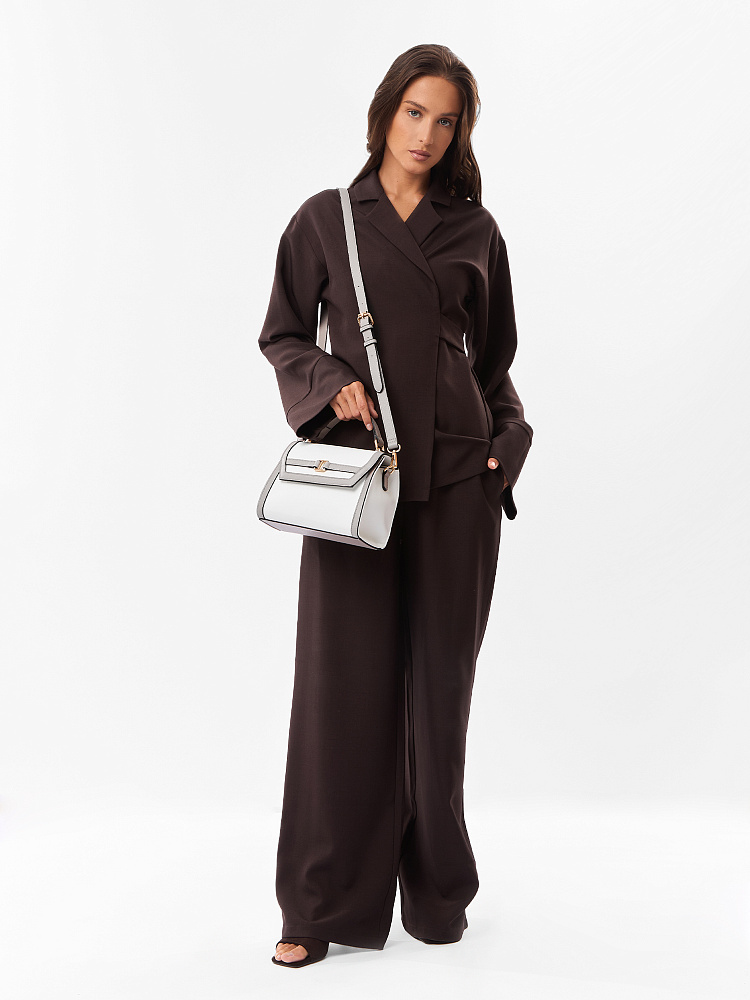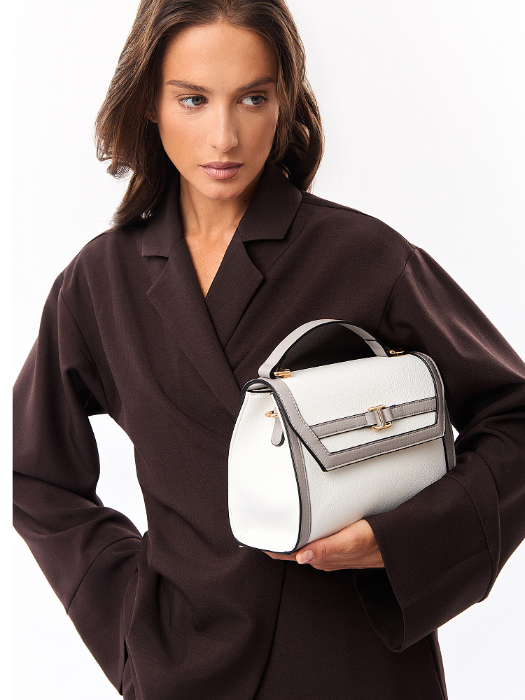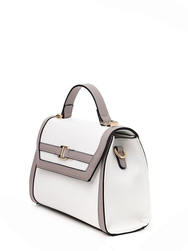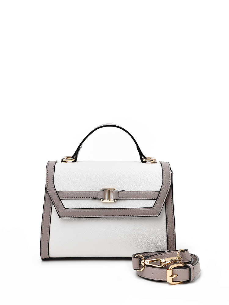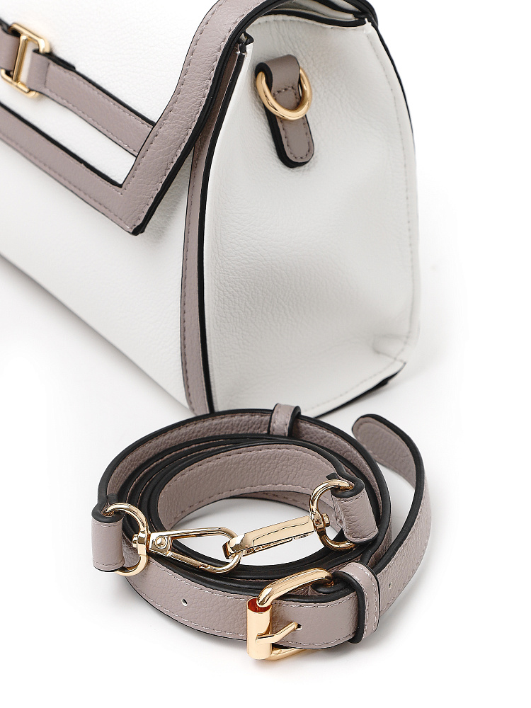 Лаконичная женская сумка кросс-боди итальянского бренда FABRETTI с жестким каркасом из зернистой белой экокожи с серо-бежевой отделкой.Основное отделение закрывается на клапан с магнитной кнопкой и молнию. Внутри один открытый карман и на молнии. На тыльной стороне карман быстрого доступа.Строгая модель играет на контрастах – белая база сочетается с более темной отделкой. Чтобы подчеркнуть геометрию сумки, края срезов отделаны черным. Клапан дополнен небольшой золотой пряжкой, короткая ручка имеет фурнитуру из золотистого гальванического сплава.Сумка дополнена съемным плечевым ремнем на карабинах, длина регулируется пряжкой.Длина ремня ок. 125 см. Цвет фурнитуры – золото.