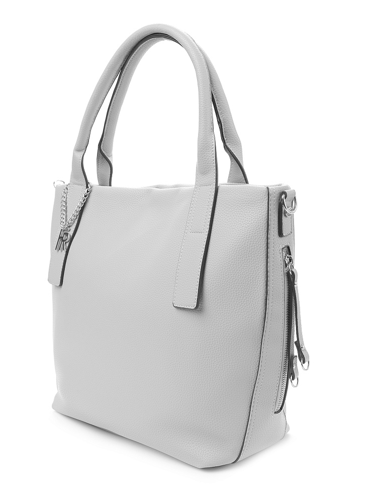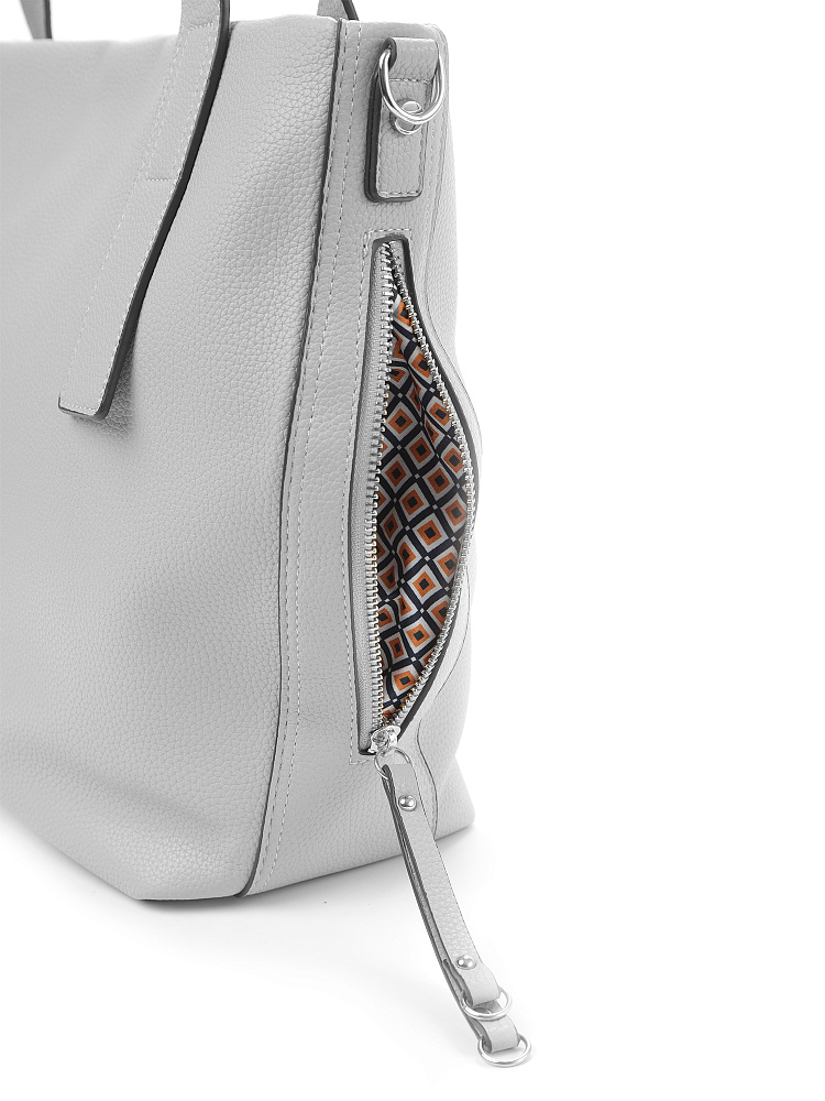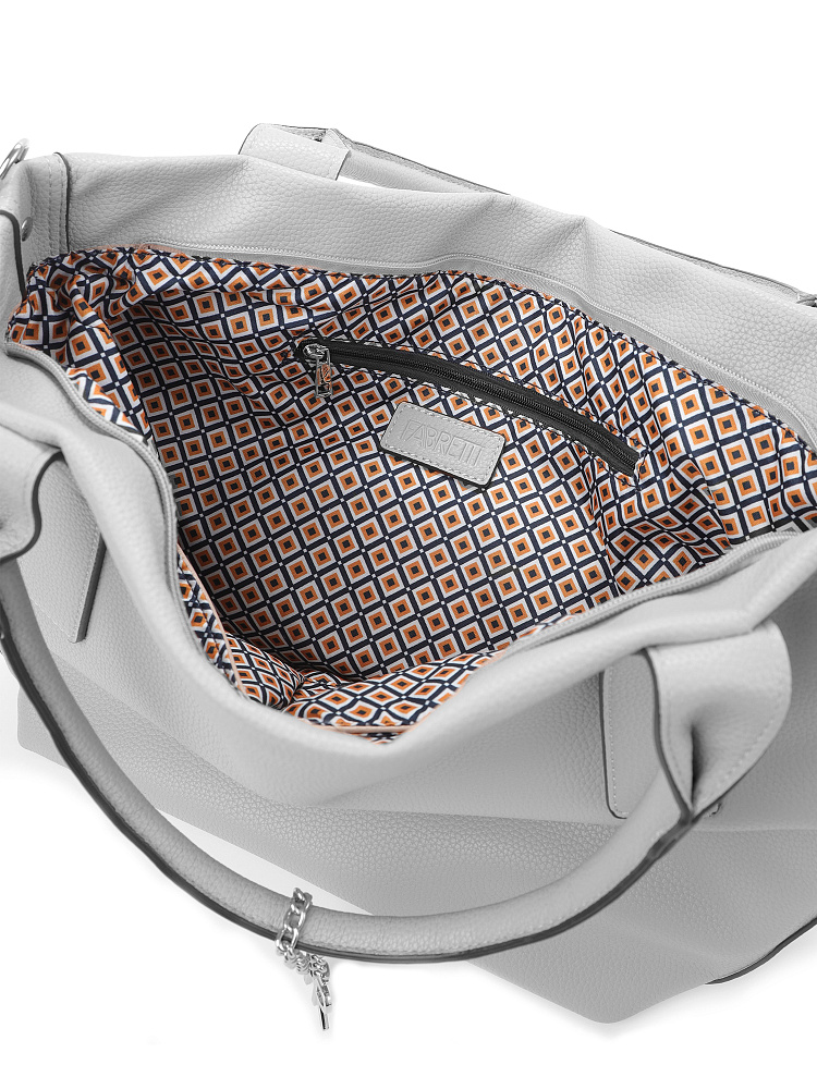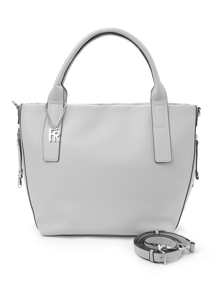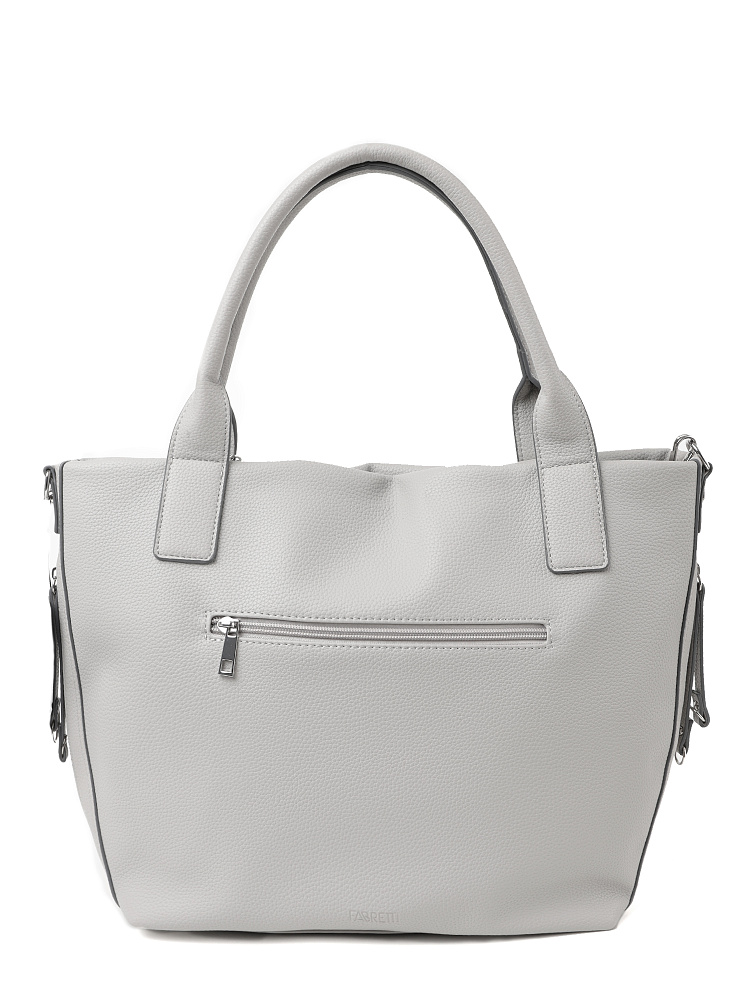 Объемная женская сумка тоут итальянского бренда FABRETTI из высококачественной зернистой экокожи светло-серого оттенка это база, которая идеально сочетается с любым городским гардеробом, будь то джинсы и футболка или классический костюм. У модели лаконичный дизайн – без лишних деталей, и продуманная внутренняя организация.Основное отделение закрывается на молнию, внутри два открытых кармана и один на молнии. На тыльной стороне находится карман быстрого доступа на молнии, два дополнительных вертикальных кармана на молнии расположены по бокам. Помимо классических ручек, сумка дополнена длинным съемным ремнем на карабинах. Боковые карманы украшены длинными поводками из экокожи, на ручке металлический брелок с монограммой.Длина ремня ок. 120 см. Цвет фурнитуры – серебро.