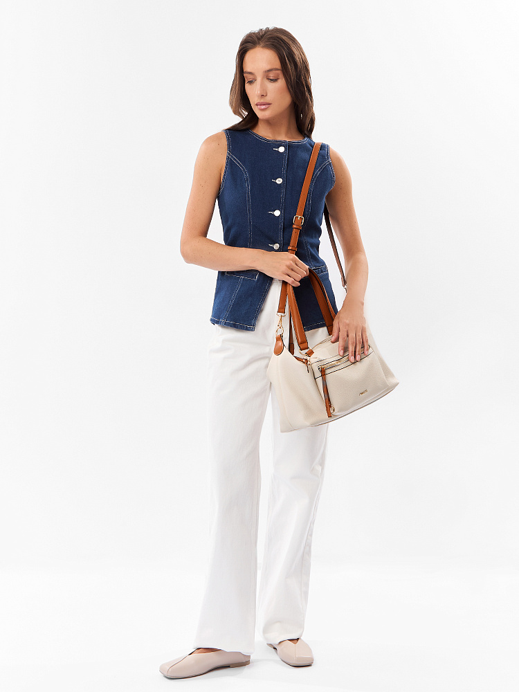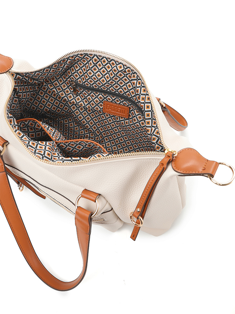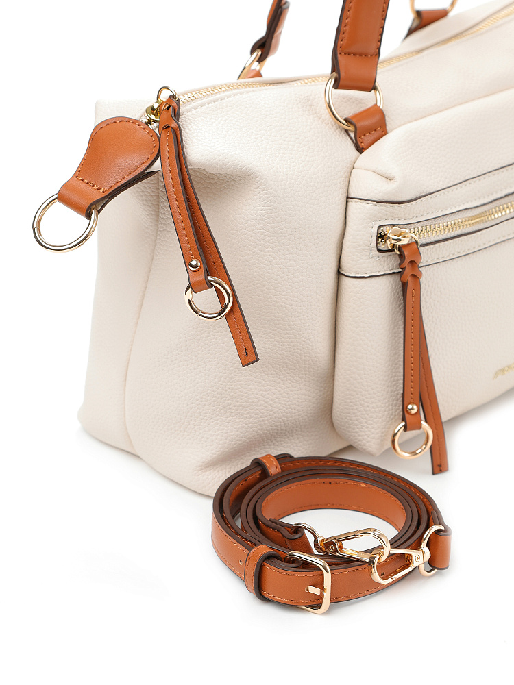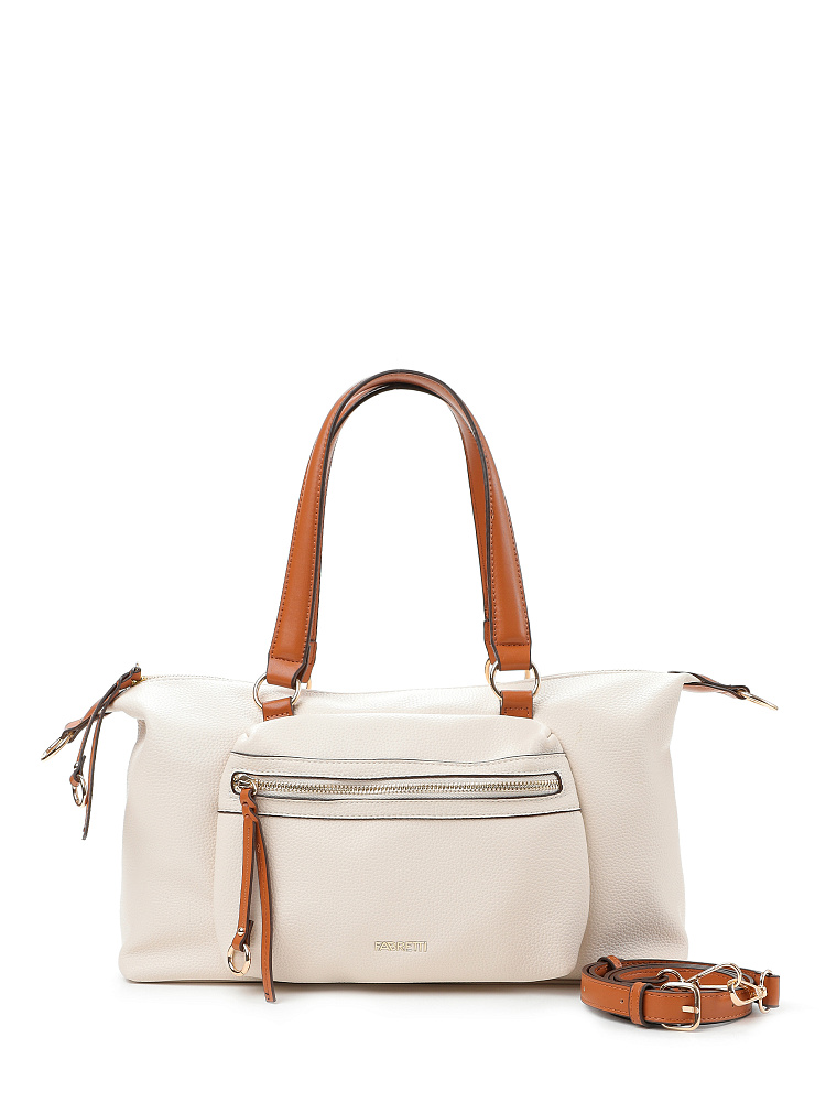 Практичная женская сумка итальянского бренда FABRETTI из мягкой зернистой экокожи молочного, светло-бежевого оттенка с отделкой из гладкой коричневой экокожи. Удобная повседневная модель, которая подходит и под джинсы, и под бизнес-стиль. Мягкая экокожа делает силуэт более плавным, а образ менее строгим, классическое сочетание бежевого и коричневого придает нотку респектабельности.У сумки прямоугольный силуэт, поддерживает геометрию накладной карман на молнии на лицевой стороне.Ручки из гладкой экокожи дополняет аналогичная отделка: на длинных поводках молний, верхних краях сумки.Основное отделение закрывается металлической молнией. Внутри два открытых кармана и один на молнии. На тыльной стороне карман быстрого доступа.Сумка дополнена узким съемным ремнем на карабинах. Длина регулируется пряжкой.Длина ремня ок. 115 см. Цвет фурнитуры – золото.