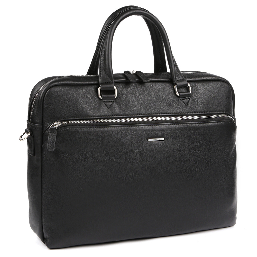 Стильная мужская сумка для документов FABRETTI выполнена из натуральной зернистой кожи черного цвета. Модель имеет две ручки и съемный плечевой ремень, длина которого регулируется, ширина - 4 см.На лицевой стороне расположен вместительный карман на молнии. На тыльной стороне также предусмотрен карман быстрого доступа на молнии. Основное отделение закрывается на полукруглую молнию с 2 бегунками. Внутри расположены органайзер для ручек, 3 кармана для мелочей: 2 открытых и на молнии, а также секция с мягкой стенкой для гаджетов. Сумка вмещает формат А4. Цвет фурнитуры - серебро.