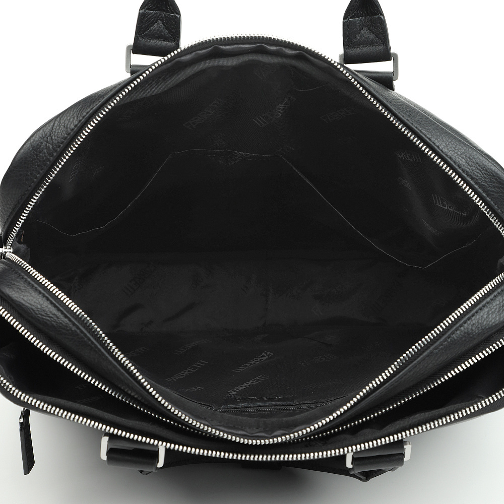 Стильная мужская сумка для документов итальянского бренда FABRETTI выполнена из натуральной зернистой кожи черного цвета. Модель имеет две ручки и съемный регулируемый плечевой ремень, ширина - 3,5 см. Ручки могут быть зафиксированы вместе съемным хлястиком с кнопкой.На лицевой стороне расположен вместительный карман на молнии. На тыльной стороне также предусмотрен карман быстрого доступа на молнии. Основные отделения закрываются на полукруглую молнию с 2 бегунками. Внутри расположены органайзер для ручек, 3 кармана для мелочей: 2 открытых и на молнии. Сумка вмещает формат А4. Цвет фурнитуры - серебро.