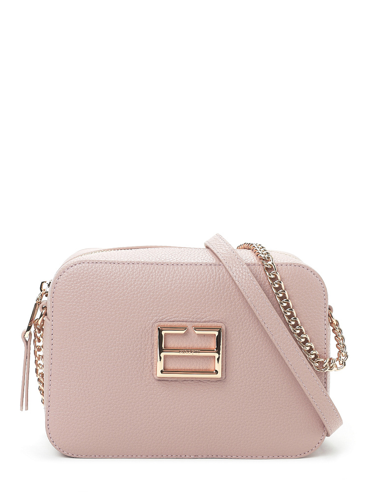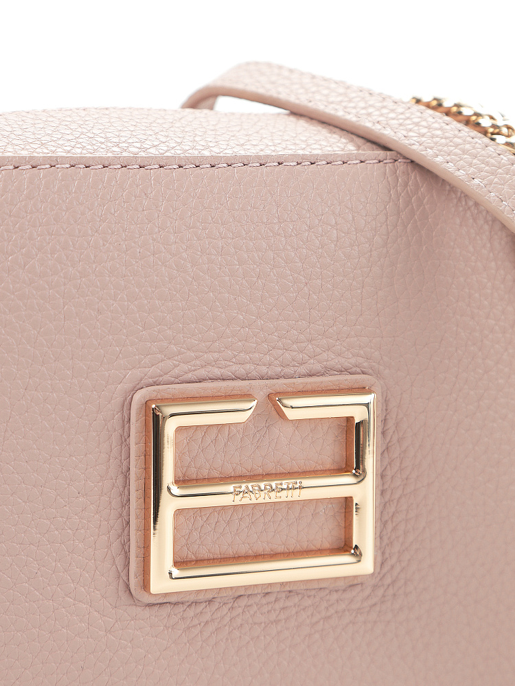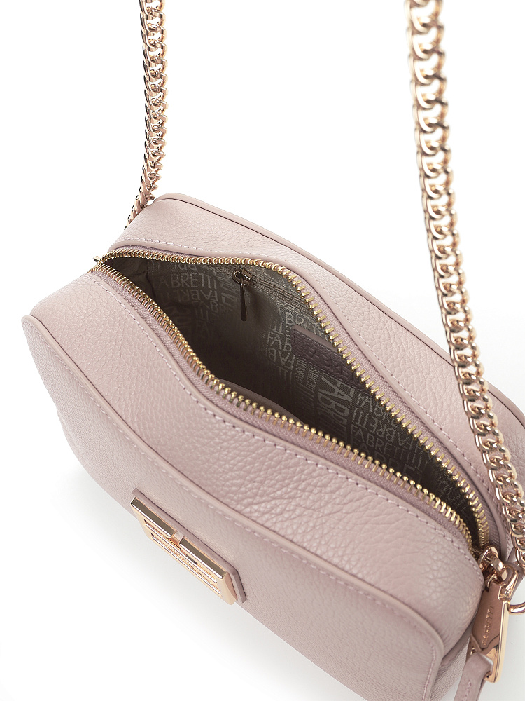 Городская женская сумка кросс-боди итальянского бренда FABRETTI из высококачественной натуральной кожи с зернистой фактурой в теплом светло-розовом цвете.У модели прямоугольная форма со скругленными углами, застежка на металлическую молнию, узкий гибридный плечевой ремень – из цепочек и кожи. На лицевой стороне крупный металлический логотип.Внутри сумки два кармана – открытый и на молнии, на тыльной стороне карман быстрого доступа на молнии. Замки молний дополнены кожаными поводками. Цвет фурнитуры – золото.