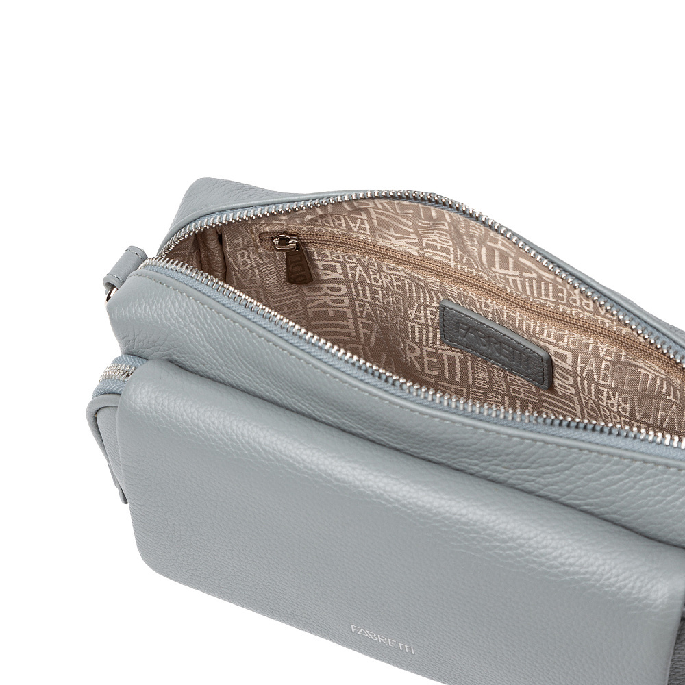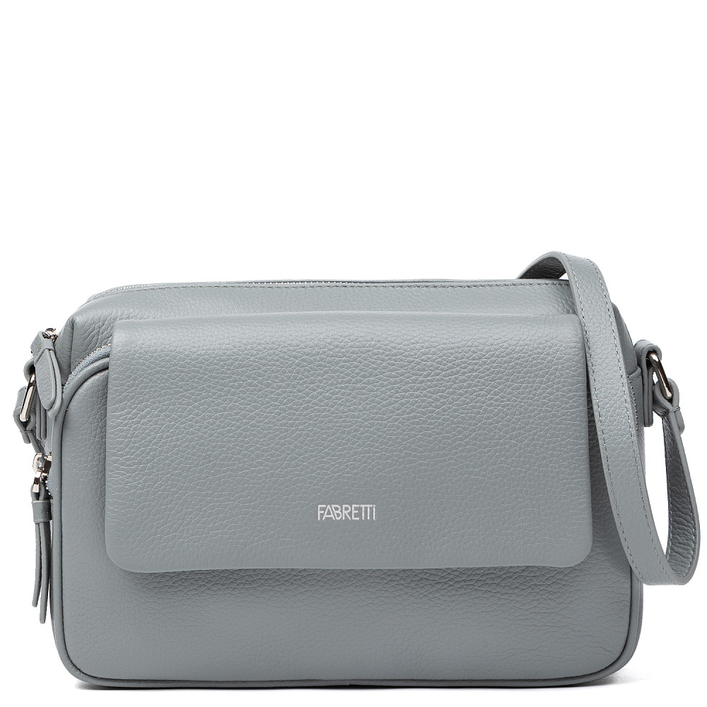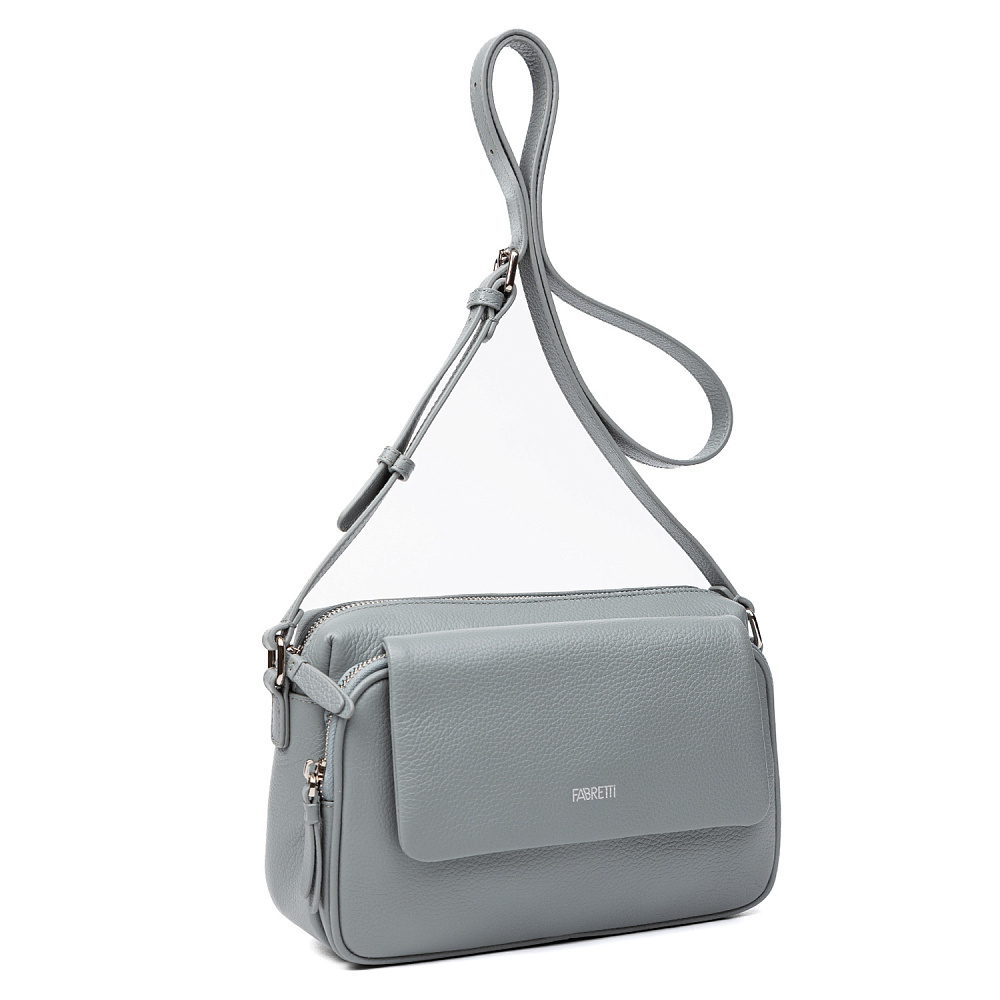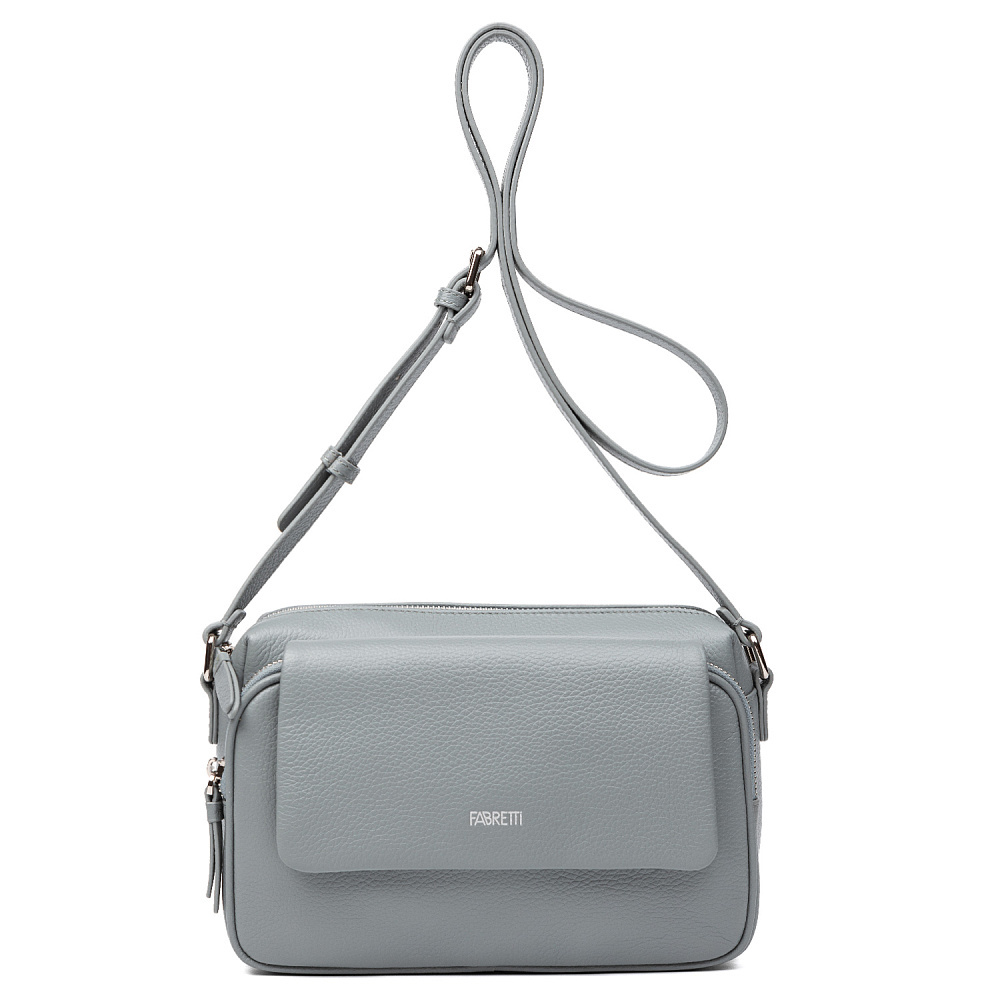 Удобная сумка крос-боди FABRETTI в серо-голубом оттенке выполнена из натуральной высококачественной зернистой кожи, приятной на ощупь. Основное отделение закрывается на полукруглую молнию с кожаным поводком. Внутри 2 кармана для мелочей: открытый и на молнии. На лицевой стороне расположен вместительный накладной карман на полукруглой молнии, скрытый под клапаном на магнитной кнопке, который обеспечивает надёжное закрытие. На тыльной стороне предусмотрен карман быстрого доступа на молнии. Плечевой ремень регулируется по длине, ширина - 1,5 см. Цвет фурнитуры - серебро.
