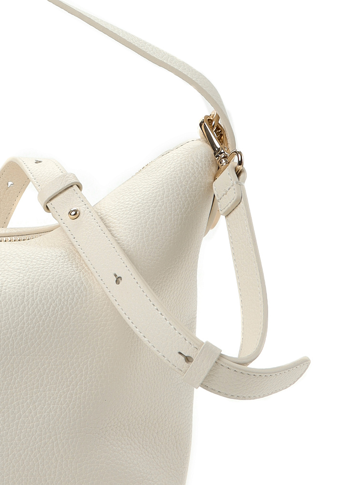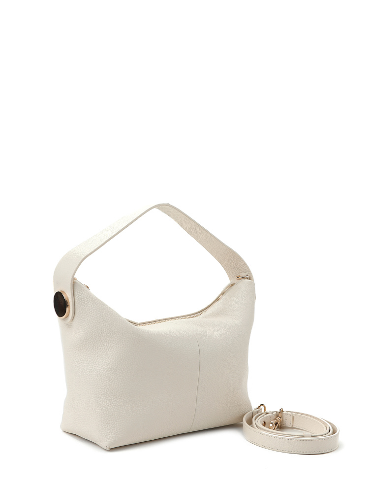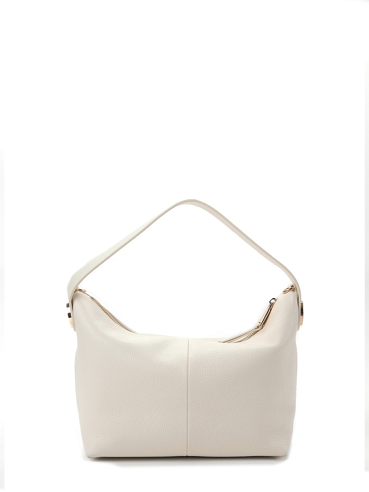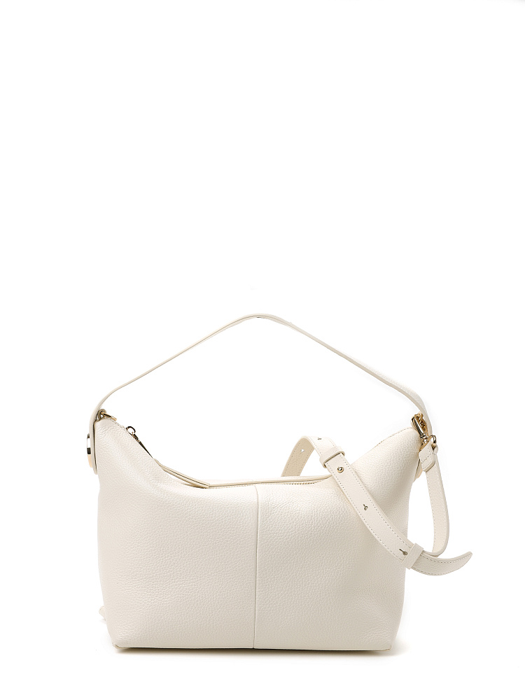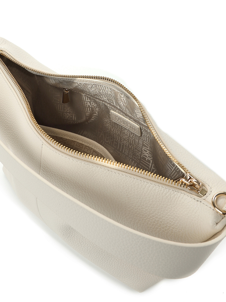 Небольшая вместительная сумка хобо из коллекции итальянского бренда FABRETTI это классика городского стиля. У нее лаконичный дизайн с минимальным декором, удобная мягкая форма, большое внутреннее отделение.Модель выполнена из натуральной кожи молочно-белого цвета с зернистой фактурой; закрывается на металлическую молнию с кожаным поводком. Внутри два кармана – открытый и на молнии.Модель дополнена короткой и широкой ручкой для ношения на плече и узким съемным ремнем на карабинах. Ручка подвижная благодаря креплению на крупную круглую фурнитуру.Цвет фурнитуры – золото. Длина ремня ок. 125 см.