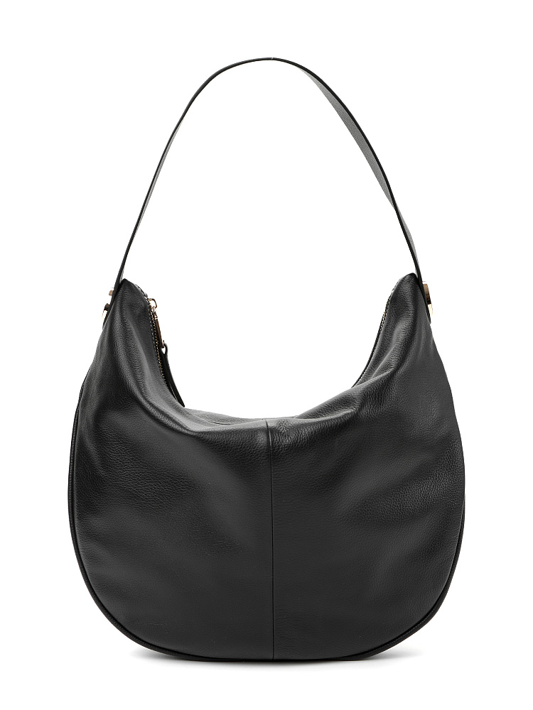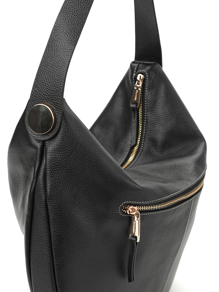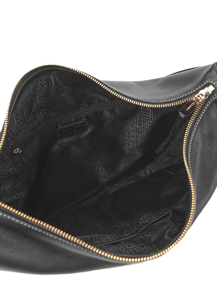 Большая и вместительная сумка хобо из коллекции итальянского бренда FABRETTI это классика городского стиля. У нее лаконичный дизайн с минимальным декором, удобная мягкая форма, большое внутреннее отделение.Модель выполнена из натуральной кожи черного цвета с зернистой фактурой; закрывается на металлическую молнию с кожаным поводком. Внутри два кармана – открытый и на молнии.Модель дополнена короткой и широкой ручкой для ношения на плече. Ручка подвижная благодаря креплению на крупную круглую фурнитуру.Цвет фурнитуры – золото.