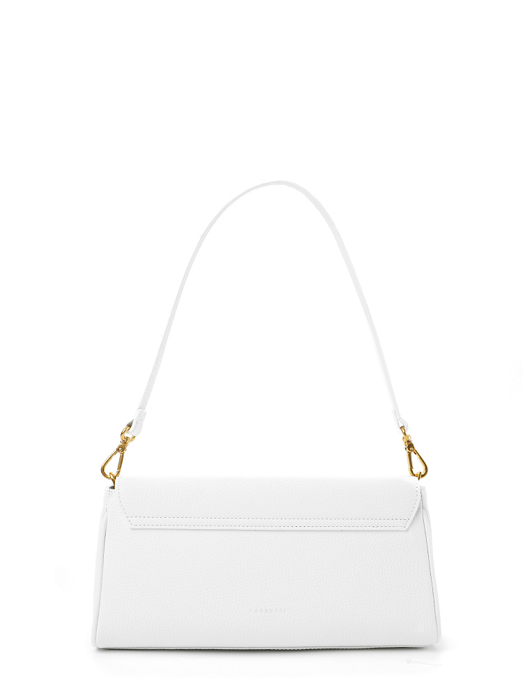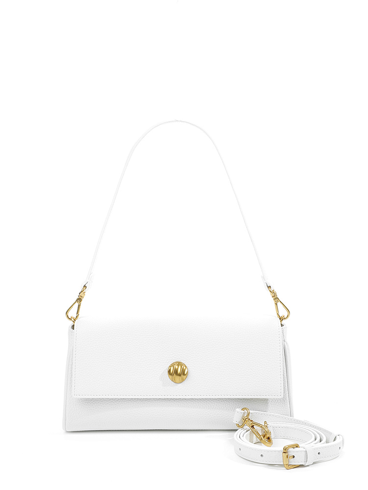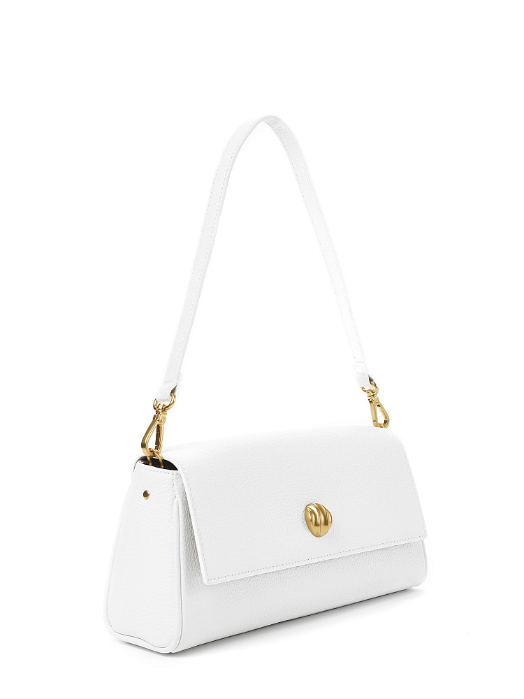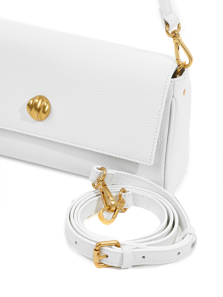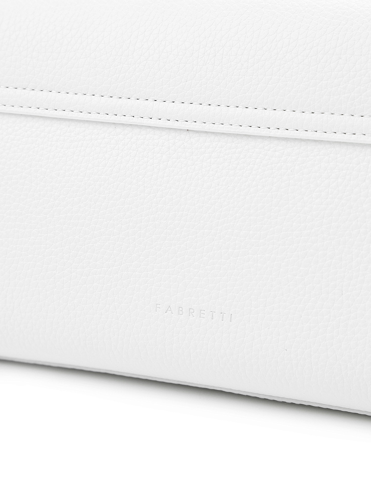 Стильная прямоугольная сумка багет итальянского бренда FABRETTI из натуральной кожи с зернистой фактурой в чистом белом цвете. Эта лаконичная модель закрывается клапаном с магнитным замком. Внутри одно отделение с небольшим открытым карманом.У сумки две съемных ручки на карабинах – короткая для плеча и длинный регулируемый ремешок.Прямоугольная сумка-багет это классика стиля, «парижский шик» и аксессуар, который формирует весь образ. Жесткий каркас отлично держит форму, натуральная кожа привлекает внимание своей живой фактурой, а металлическая фурнитура расставляет стилистические акценты.Длина ремня ок. 130 см. Цвет фурнитуры – матированное золото.