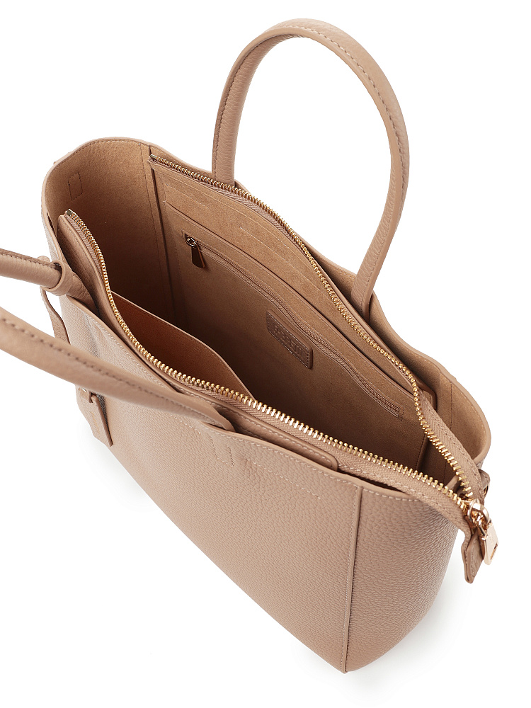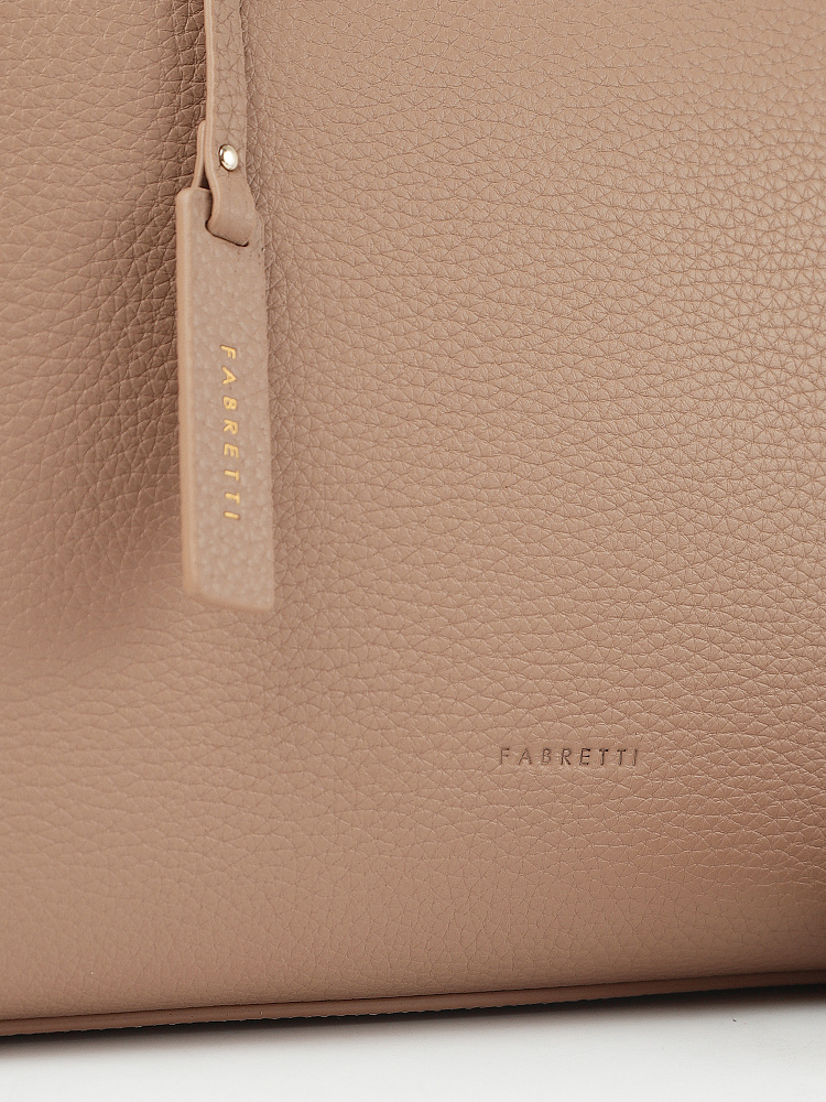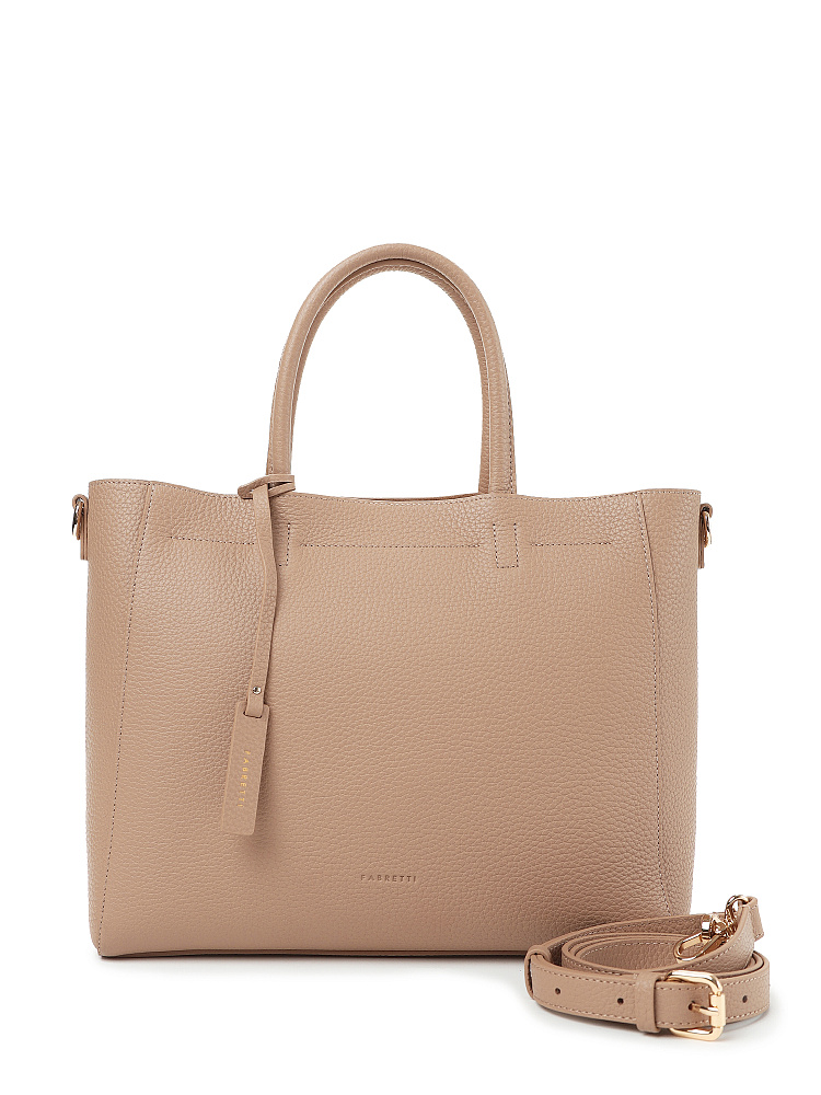 Стильная и вместительная женская сумка тоут итальянского бренда FABRETTI – одна из самых удобных моделей для повседневного городского гардероба. Прямоугольный силуэт отлично подходит к любому типу фигуры, сочетается как с прямым кроем, так и со свободным оверсайз.Модель выполнена из высококачественной плотной кожи с зернистой фактурой в нежном кофейно-бежевом цвете. В качестве декора использован съемный кожаный брелок с логотипом.Основное отделение закрывается на молнию, внутри два больших открытых кармана и один на молнии. У сумки короткие ручки и регулируемый съемный кожаный ремень на карабинах. Длина ремня ок. 120 см. Цвет фурнитуры – золото.