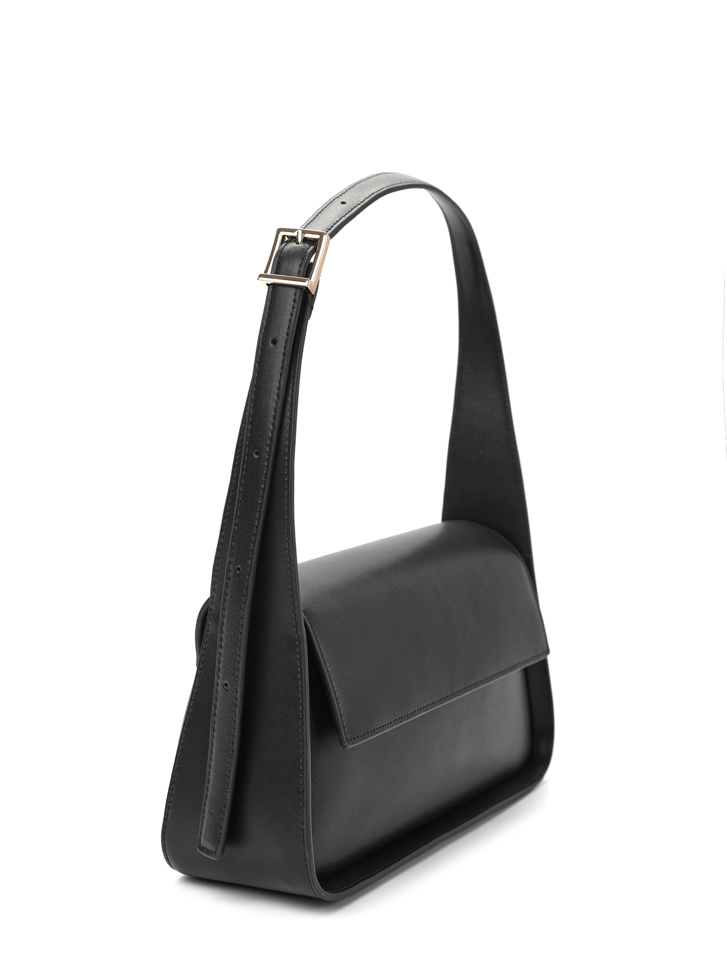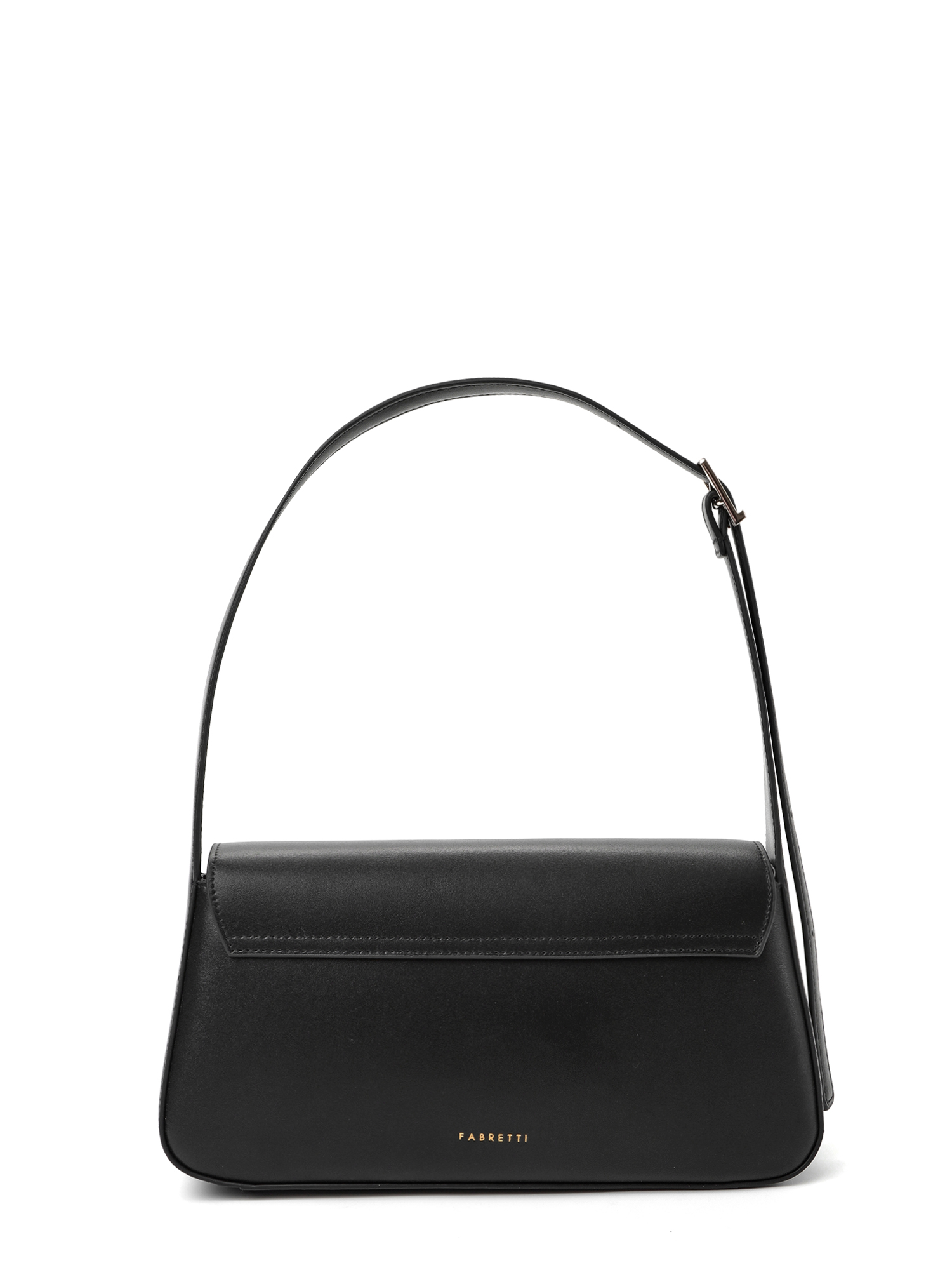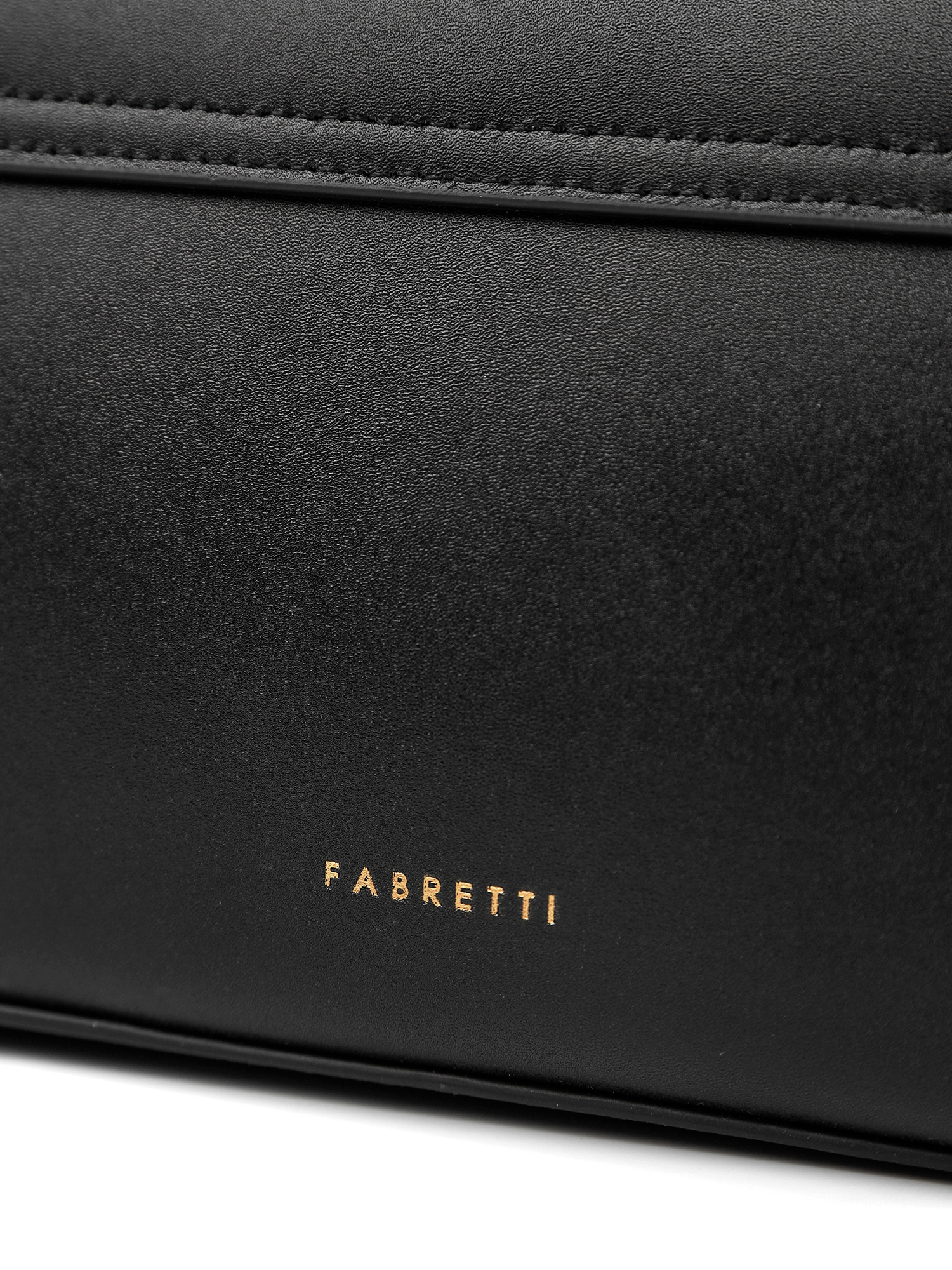 Небольшая прямоугольная женская сумка итальянского бренда FABRETTI в современном минималистичном дизайне с жестким каркасом из гладкой натуральной кожи кальф в классическом черном цвете. Модель закрывается на клапан с магнитной кнопкой, внутри два кармана: открытый и на молнии. Плечевой ремень регулируется по длине пряжкой.Интересная деталь – широкий жесткий кант по лицевой стороне и плавные формы, делающие аксессуар более женственным и «спокойным». Цвет фурнитуры – золото.