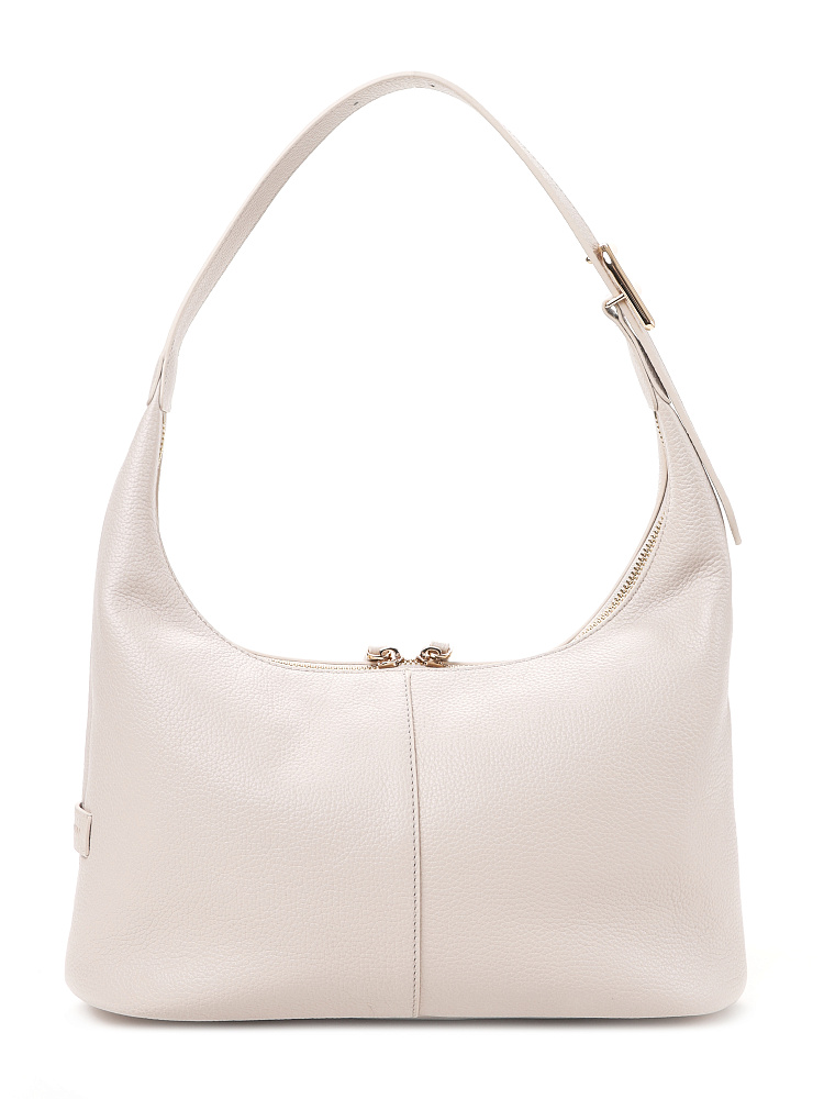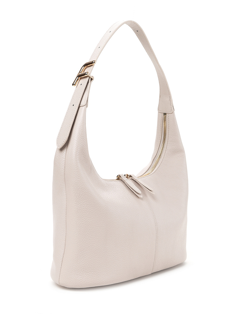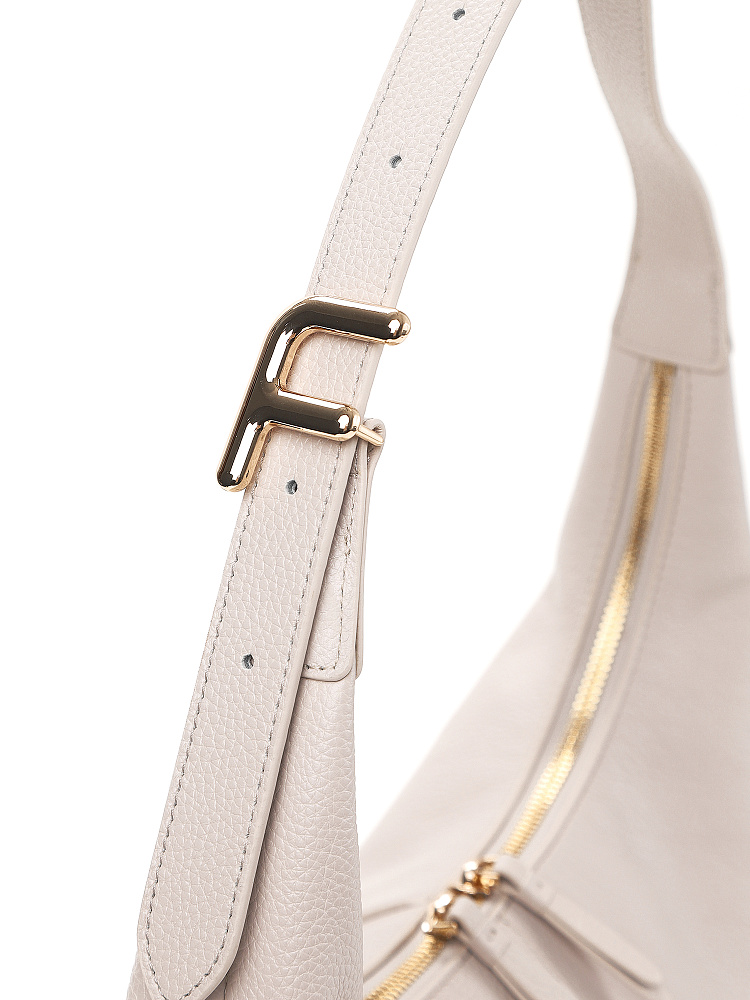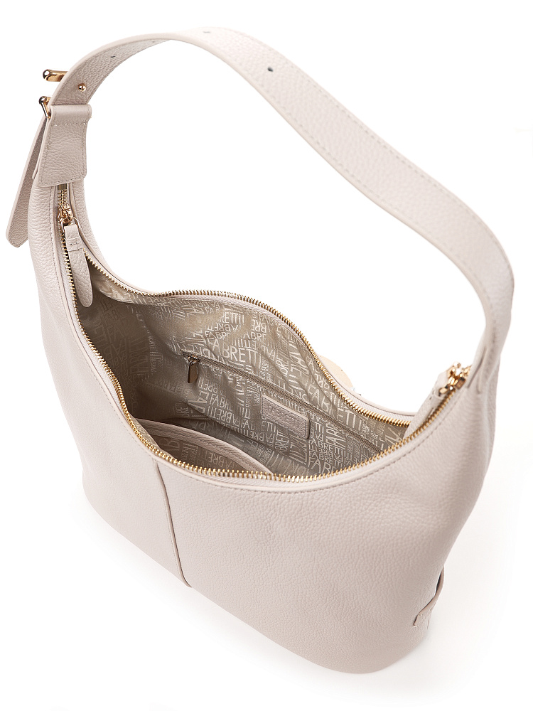 Удобная, стильная и практичная сумка хобо из коллекции итальянского бренда FABRETTI это классика стиля смарт кэжуал, она идеально сочетается с повседневной одеждой, но подходит и под смелые образы в стиле бохо или романтические образы.У этой модели мягкая свободная форма благодаря нежной натуральной коже с зернистой фактурой. Уютный светло-бежевый цвет хорошо сочетается с натуральными оттенками – базой для повседневной одежды.Основное отделение закрывается на металлическую молнию с двумя бегунками и кожаными поводками на них. Внутри открытый карман и на молнии. Широкая ручка регулируется по длине при помощи стильной пряжки с фирменным логотипом.Цвет фурнитуры – золото.