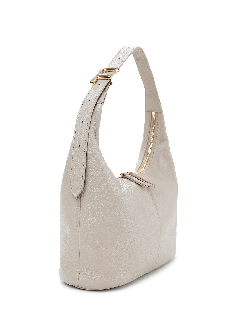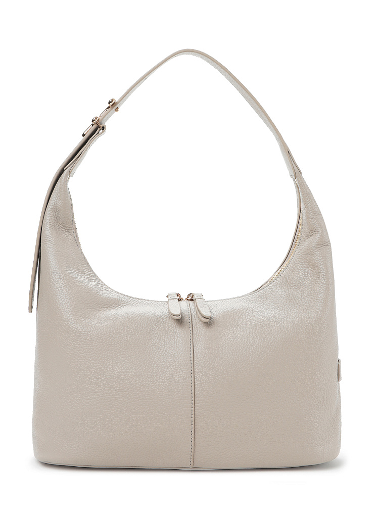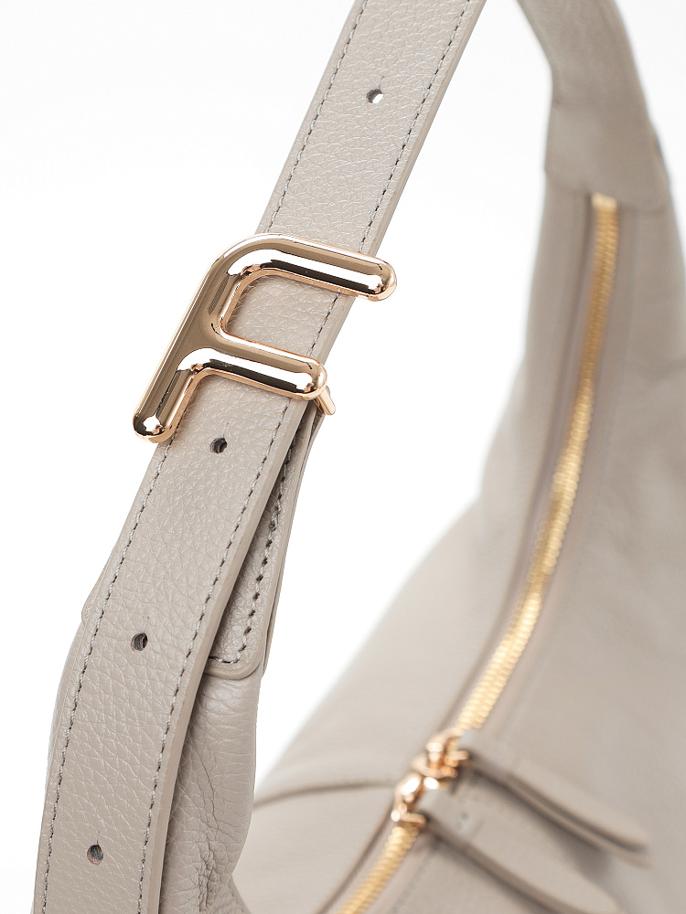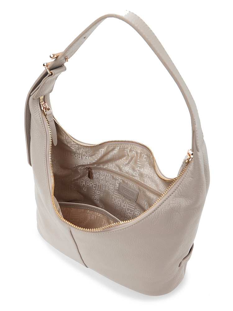 Удобная, стильная и практичная сумка хобо из коллекции итальянского бренда FABRETTI это классика стиля смарт кэжуал, она идеально сочетается с повседневной одеждой, но подходит и под смелые образы в стиле бохо или романтические образы.У этой модели мягкая свободная форма благодаря нежной натуральной коже с зернистой фактурой. Уютный серо-бежевый цвет хорошо сочетается с натуральными оттенками – базой для повседневной одежды.Основное отделение закрывается на металлическую молнию с двумя бегунками и кожаными поводками на них. Внутри открытый карман и на молнии. Широкая ручка регулируется по длине при помощи стильной пряжки с фирменным логотипом.Цвет фурнитуры – золото.