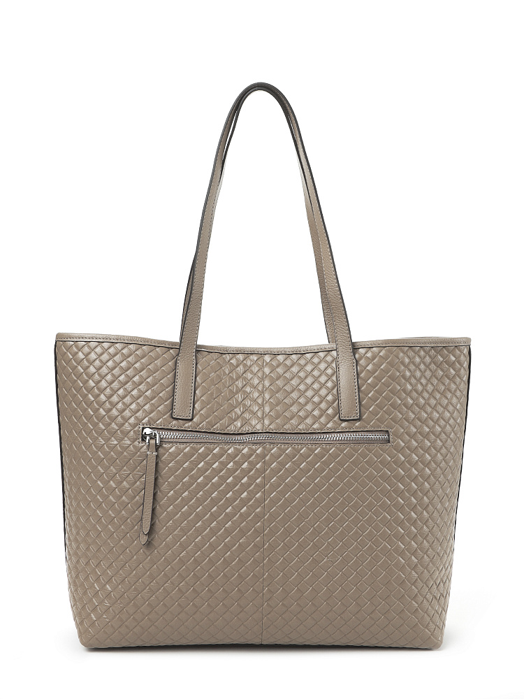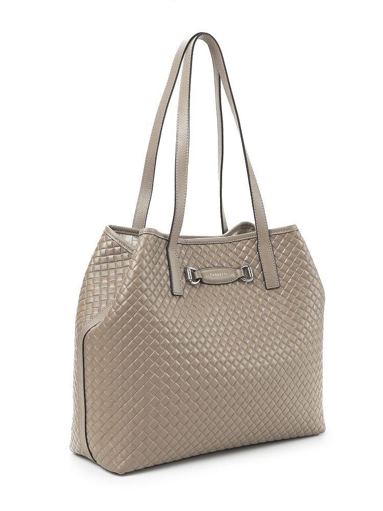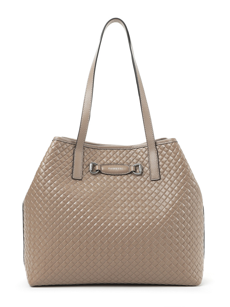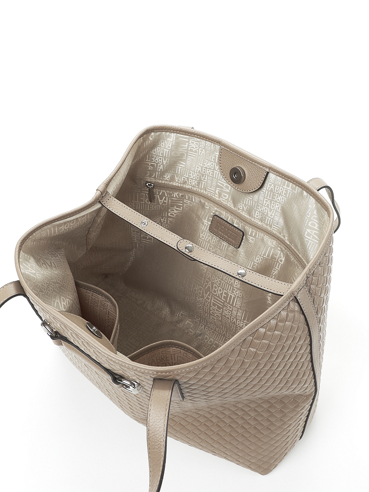Вместительная женская сумка тоут итальянского бренда FABRETTI – классика городского стиля. Она выполнена из высококачественной натуральной кожи с мелкозернистой фактурой и тиснением, имитирующим плетеный узор. Окрашена в теплый серо-бежевый оттенок.Основное отделение закрывается на магнитную кнопку, объем дополнительно регулируется хлястиком с двумя кнопками. Внутри сумки три кармана – два открытых и один на молнии. С тыльной стороны расположен карман быстрого доступа на молнии. Длинные ручки удобны для ношения сумки на плече.Цвет фурнитуры – серебро.«Плетеный» геометрический узор на поверхности делает сумку более сложной и фактурной, она удачно сочетается с одеждой с принтами и сложным кроем. На фоне однотонной свободной одежды аксессуар будет акцентным.