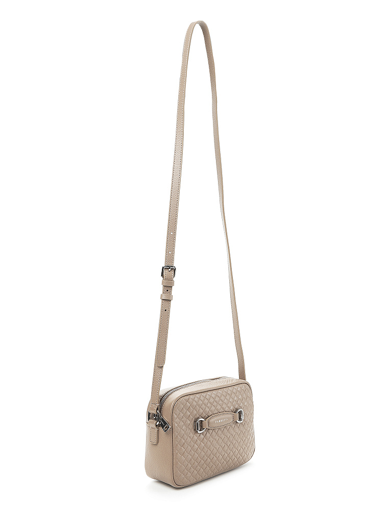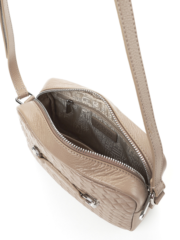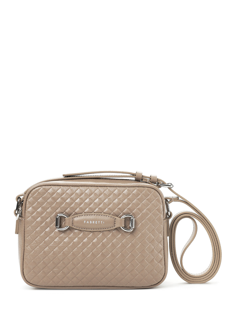 Небольшая прямоугольная женская сумка кросс-боди итальянского бренда FABRETTI из высококачественной натуральной кожи с мелкозернистой фактурой и тиснением, имитирующим плетеный узор. Окрашена в теплый серо-бежевый оттенок.У этой модели прямоугольный силуэт с округлыми краями, на лицевой стороне декоративная пряжка с логотипом. Основное отделение закрывается на металлическую молнию.Внутри открытый карман и карман на молнии, на тыльной стороне сумки карман быстрого доступа на молнии. Плечевой ремень регулируется по длине пряжкой. Длина ок.135 см. Цвет фурнитуры – серебро.«Плетеный» геометрический узор на поверхности делает сумку более сложной и фактурной, она удачно сочетается с одеждой с принтами и сложным кроем. На фоне однотонной свободной одежды аксессуар будет акцентным.