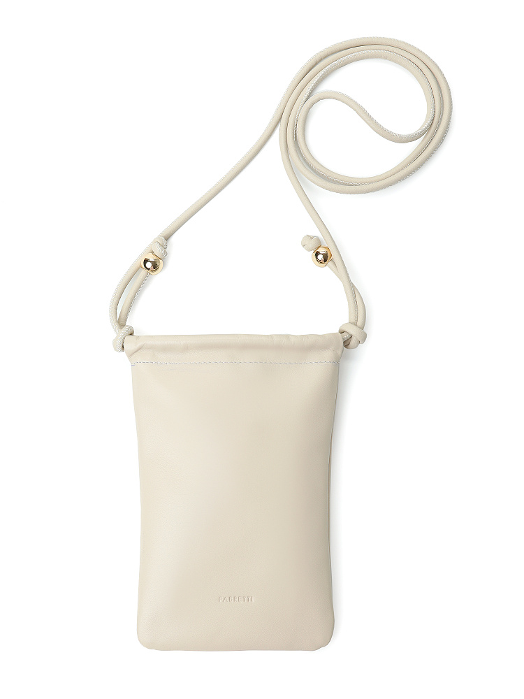 Лаконичная вертикальная женская сумка для телефона итальянского бренда FABRETTI выполнена из мягкой натуральной кожи. Основное отделение закрывается на кулиску.На лицевой стороне тиснение с логотипом. Плечевой ремень выполнен в виде объемного шнура с крупными металлическими бусинами на концах.Модель кажется максимально простой, но с ней вы можете создать эффектный образ, построенный на классических формах и натуральных тканях с минимумом декора. Отлично подходит для ношения мобильного телефона или иных устройств.Длина ремня - 125 см, ширина – ок. 1 см.