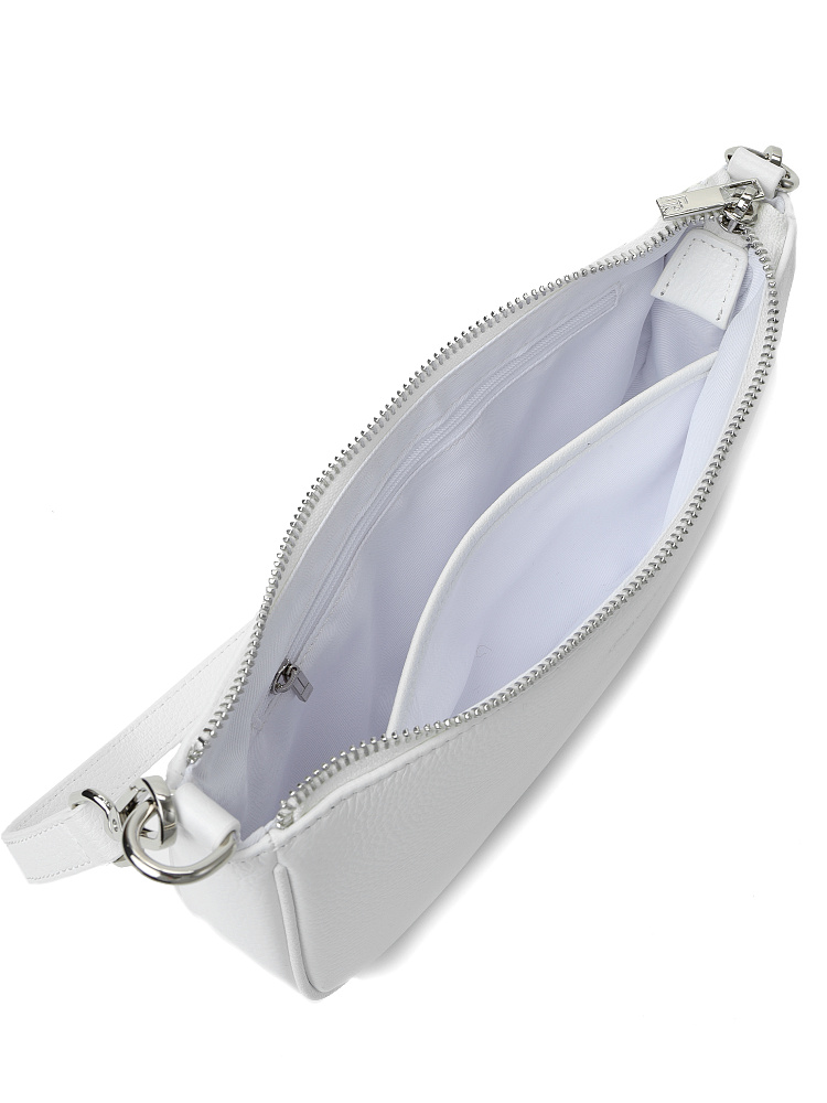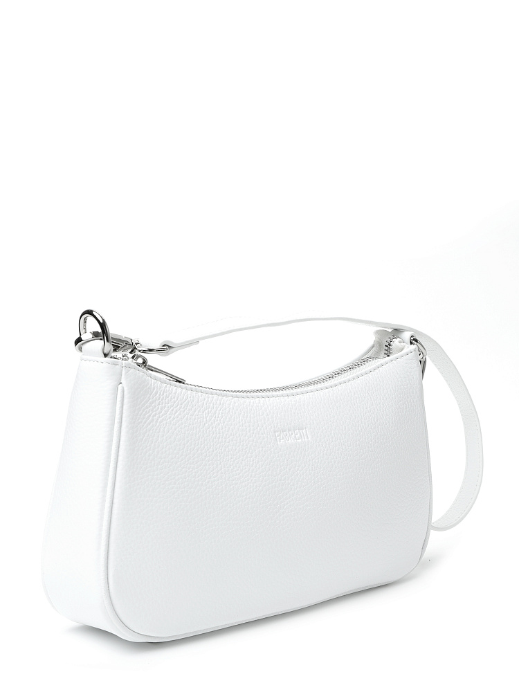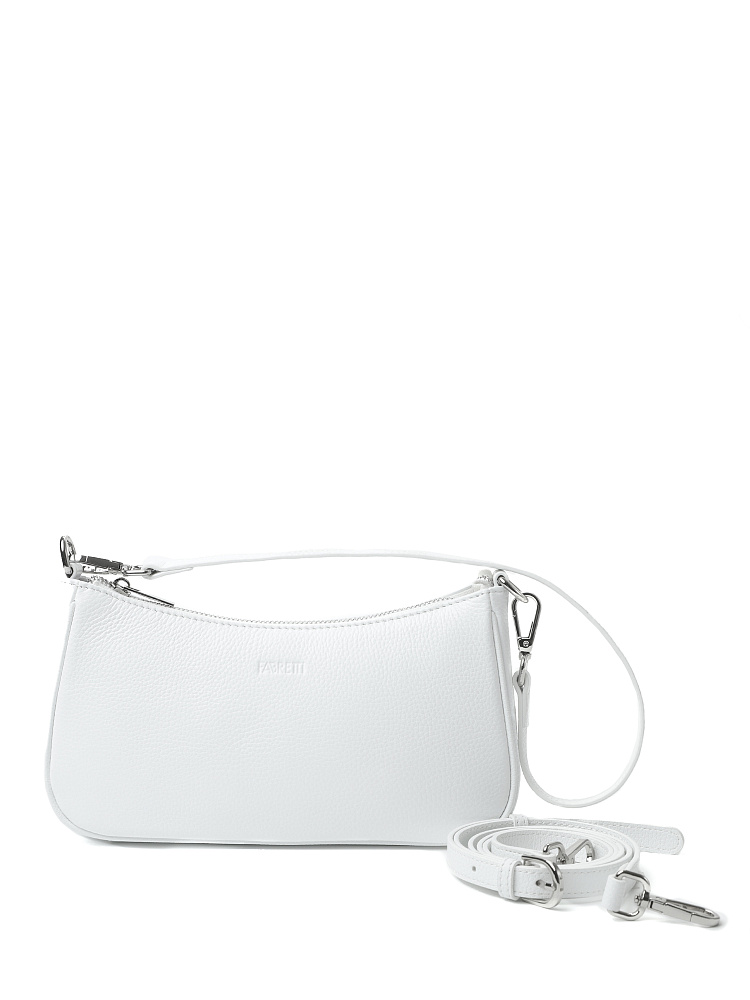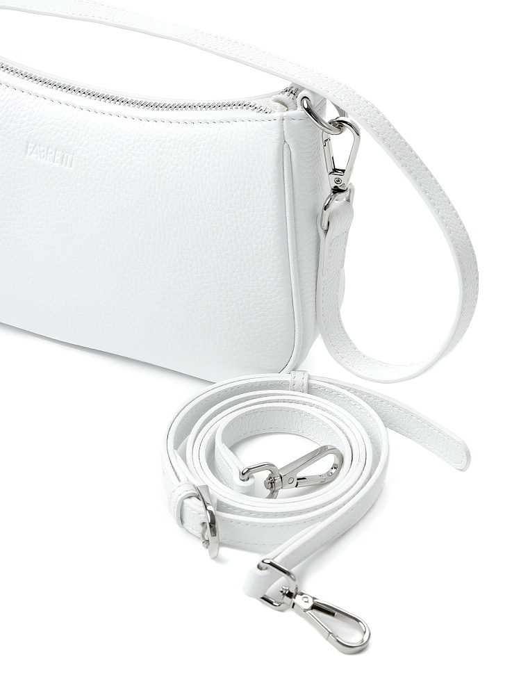 Небольшая женская сумка кросс-боди итальянского бренда FABRETTI из натуральной кожи с зернистой фактурой в холодном белом цвете.Модель имеет одно основное отделение на металлической молнии, внутри открытый карман и на молнии. На лицевой стороне тиснение в виде логотипа. Модель оснащена двумя съемными ручками на карабинах: короткой ручкой и длинным ремешком для ношения на плече или кросс-боди. Длина ремня ок.130 см, регулируется пряжкой. Цвет фурнитуры – серебро.Белая сумка – универсальный аксессуар для теплого сезона. Она отлично подходит и к деловому стилю, и всевозможным городским образам, от платьев до футболок и шорт.