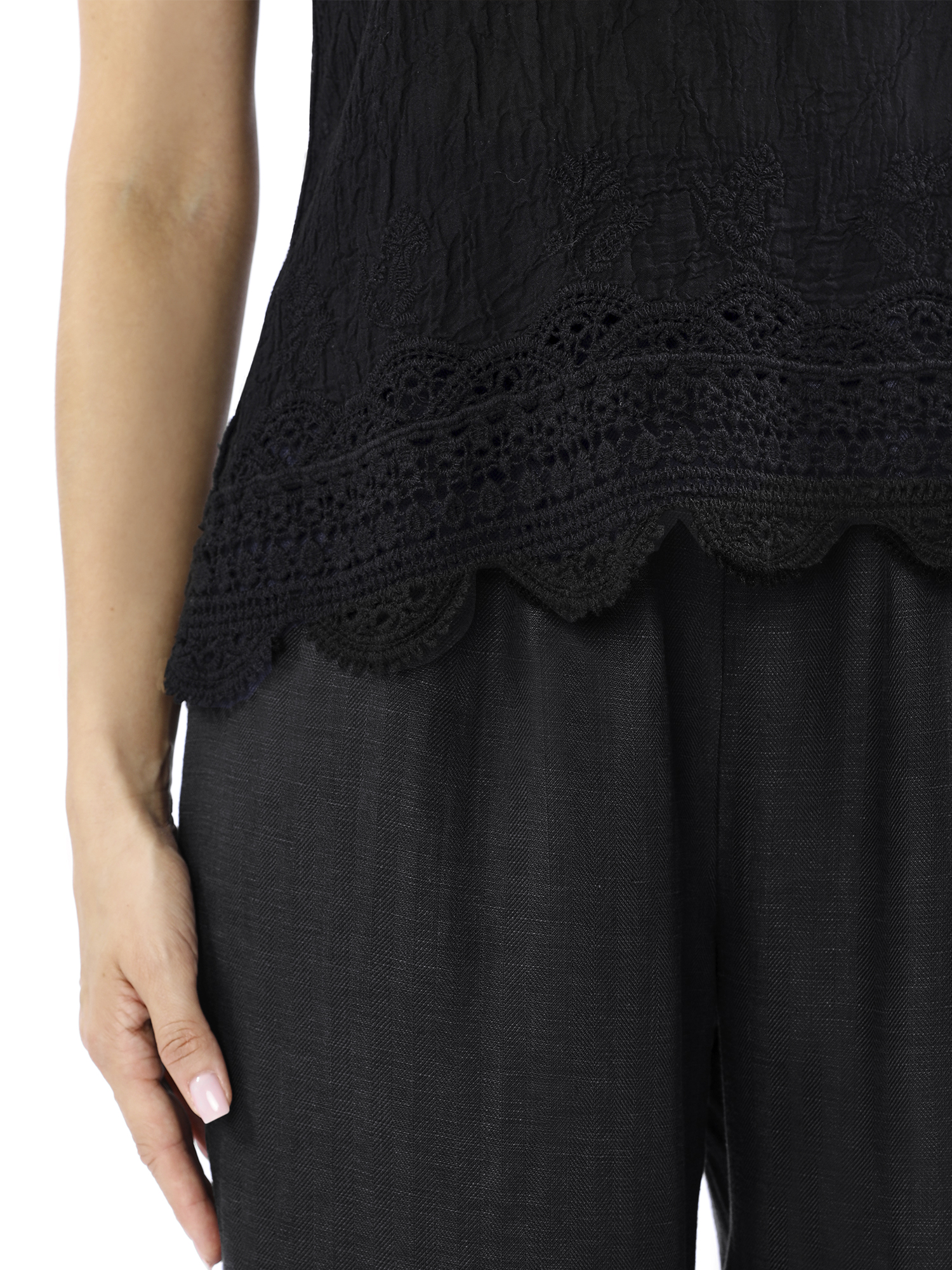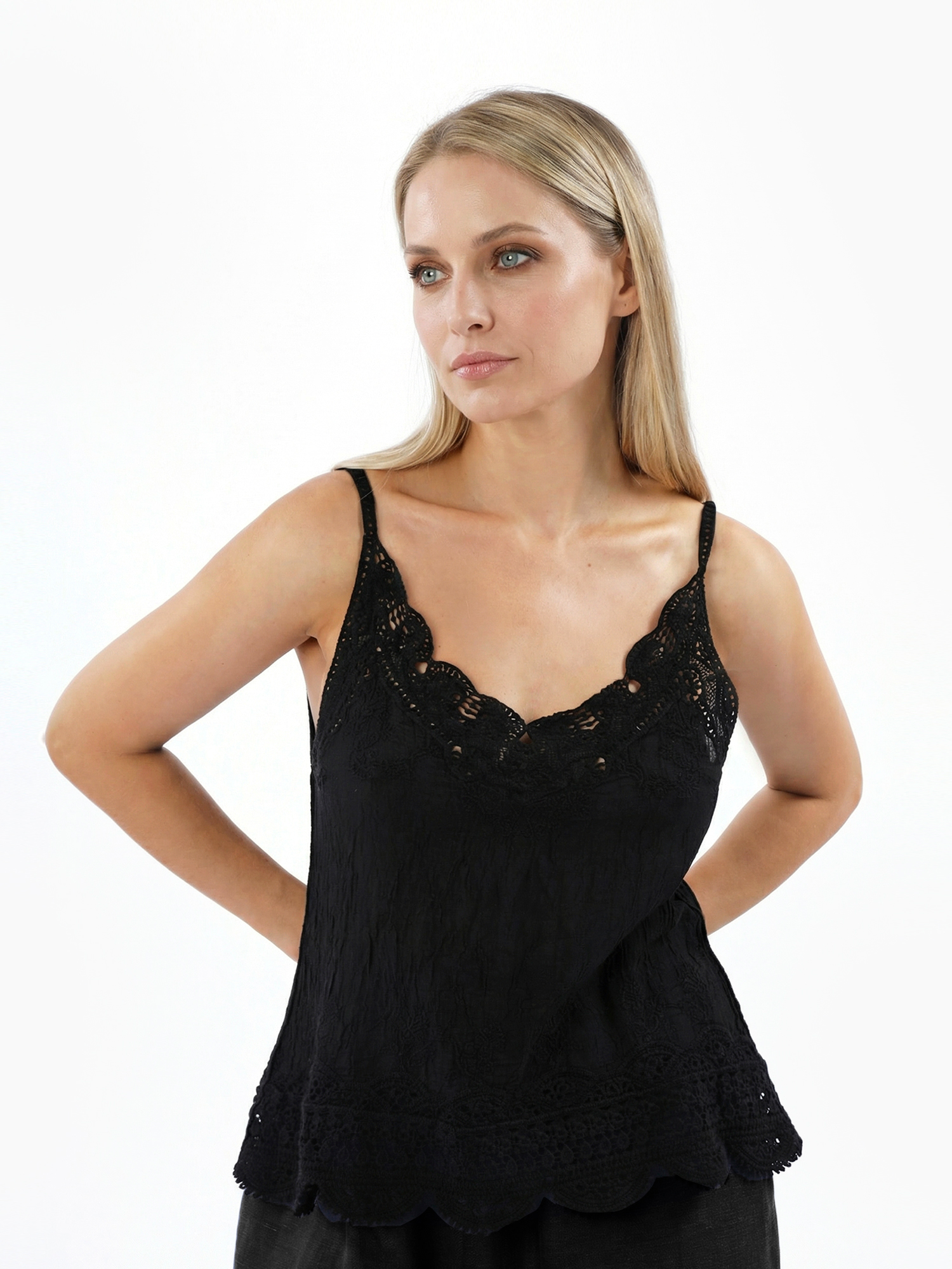 Изящный кружевной женский топ из коллекции итальянского бренда FABRETTI черного цвета – удивительно нежная и женственная модель. Она сочетает в себе воздушность кроя, изысканность ажурных материалов и искусность декора.У топа свободный А-силуэт и интересный декор: верх и низ выполнены из кружева, сочетающего разные узоры и дополнены растительной вышивкой. Тонкие бретели также кружевные.Топ выполнен из легчайшего полупрозрачного жатого хлопка с эффектом "крэш" - он не требует глажки или отпаривания.Ажурный топ остается ключевым трендом весенне-летних сезонов. Он сочетается как с классическими джинсами, так и с романтичными длинными юбками, шортами, подходит для многослойных образов, бохо и романтического стиля.