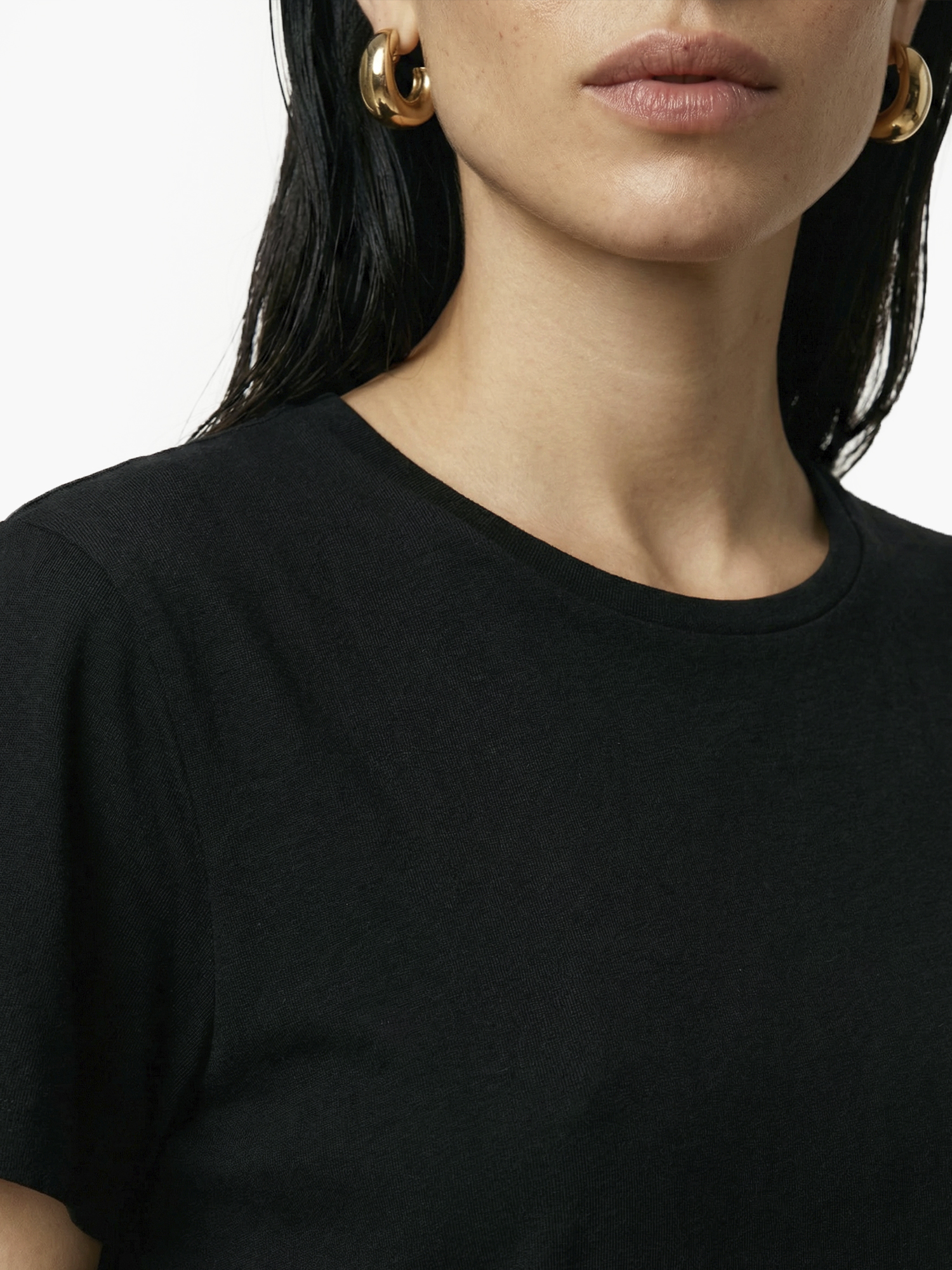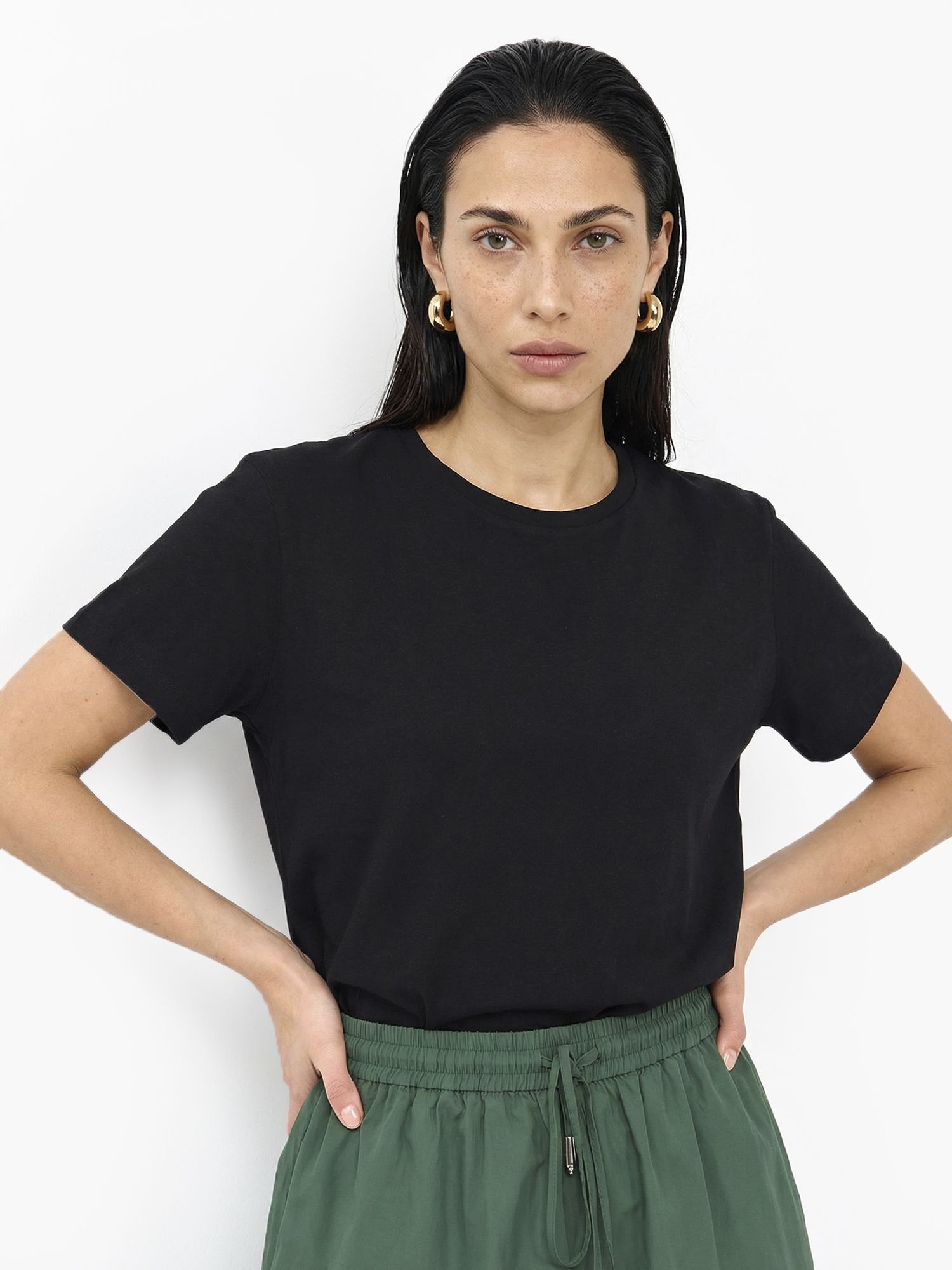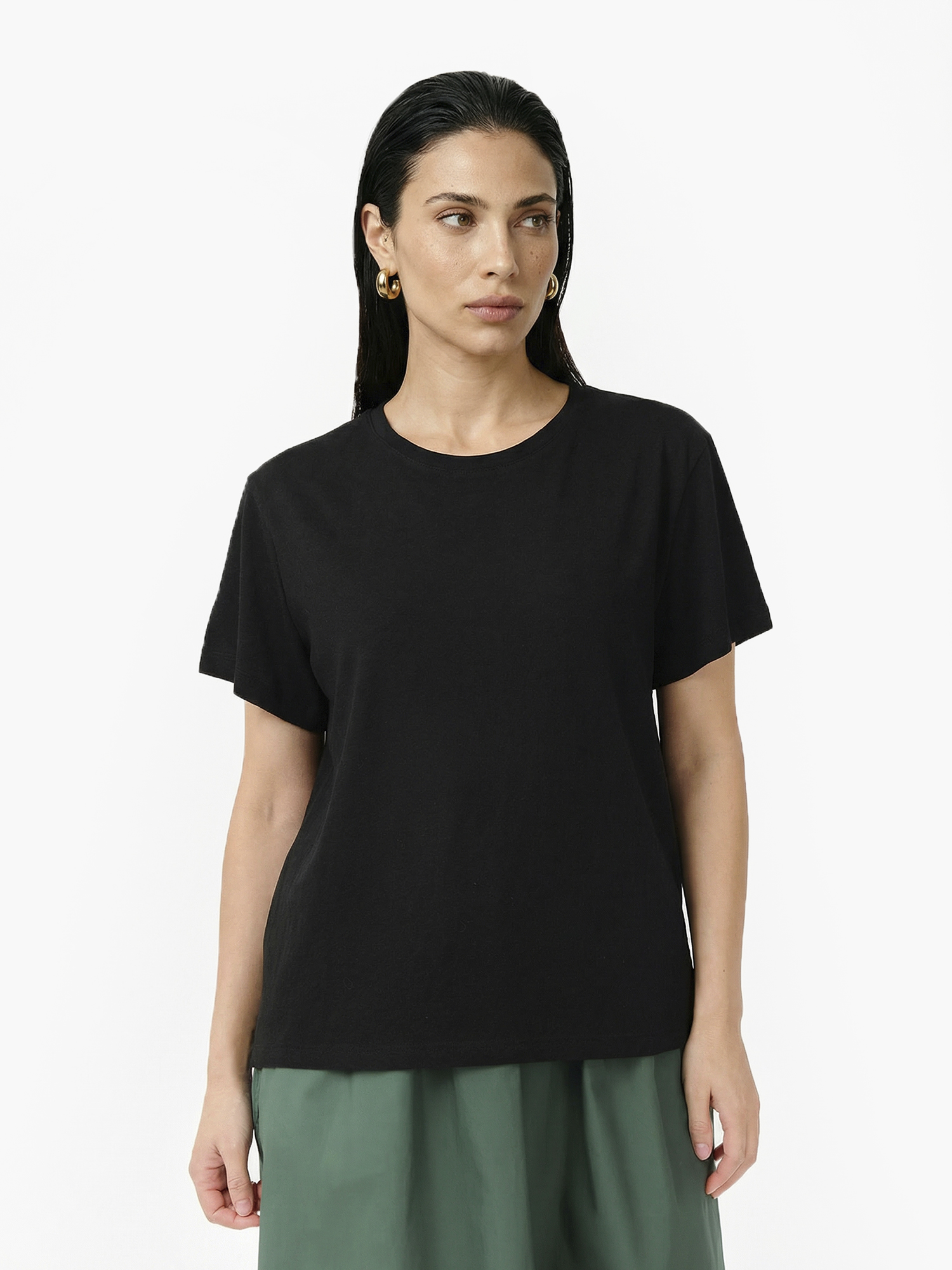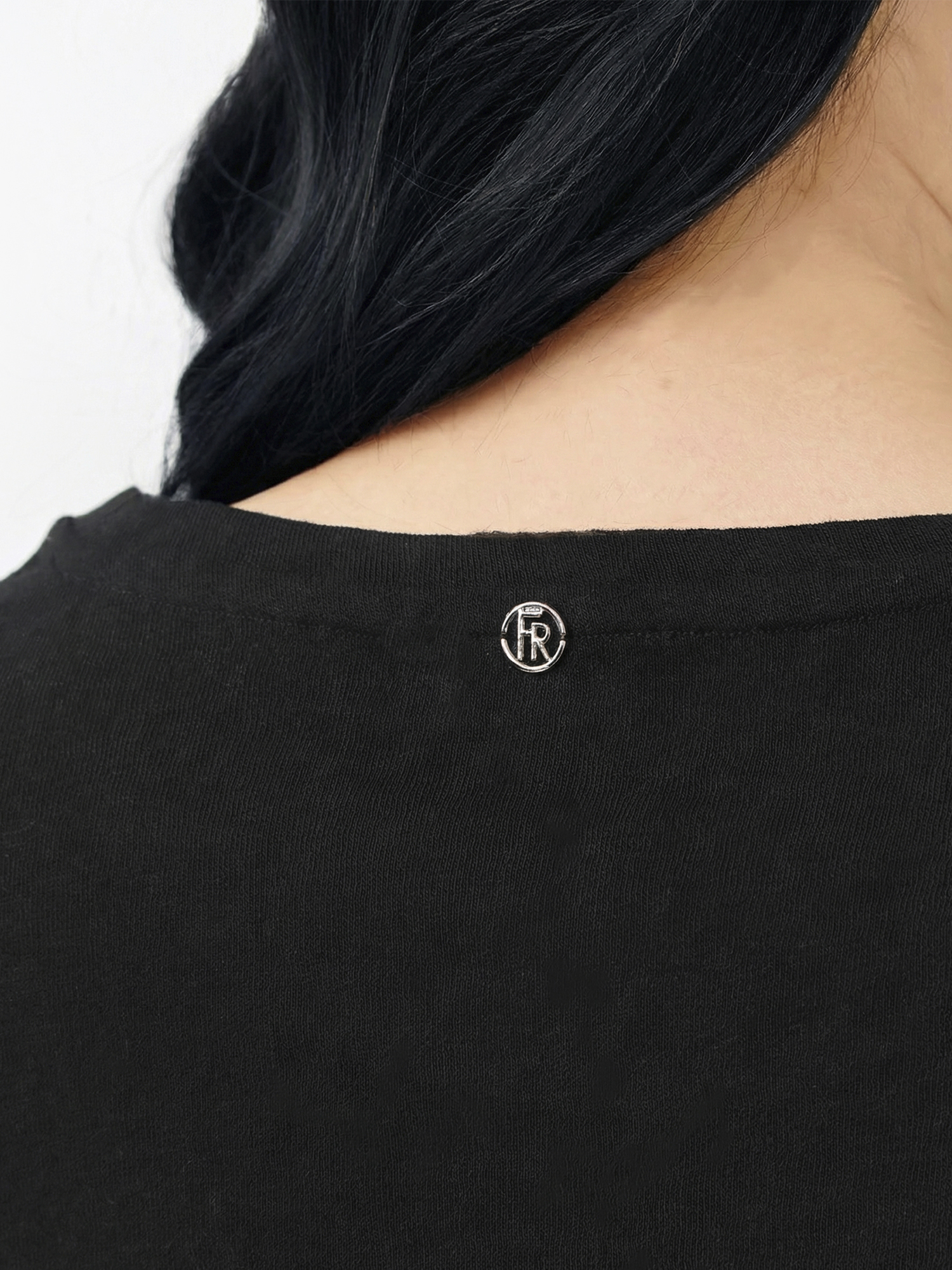 Легкая летняя женская футболка итальянского бренда FABRETTI черного цвета из тонкой и неплотной хлопковой ткани.У модели актуальный А-силуэт, короткие рукава, округлый вырез горловины с обтачкой. Легкий хлопок – идеальный материал для летнего сезона. Он отлично пропускает воздух, быстро отводит влагу от тела и также быстро сохнет.Однотонная футболка – универсальный базовый аксессуар, которым можно дополнить юбки различной длины, джинсы, брюки и шорты. Она хорошо сочетается с одежной с принтами, так как визуально «разгружает» образ, делая его более гармоничным и сбалансированным.