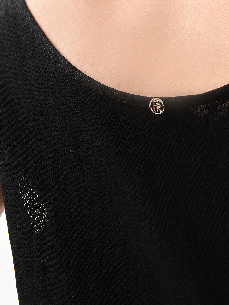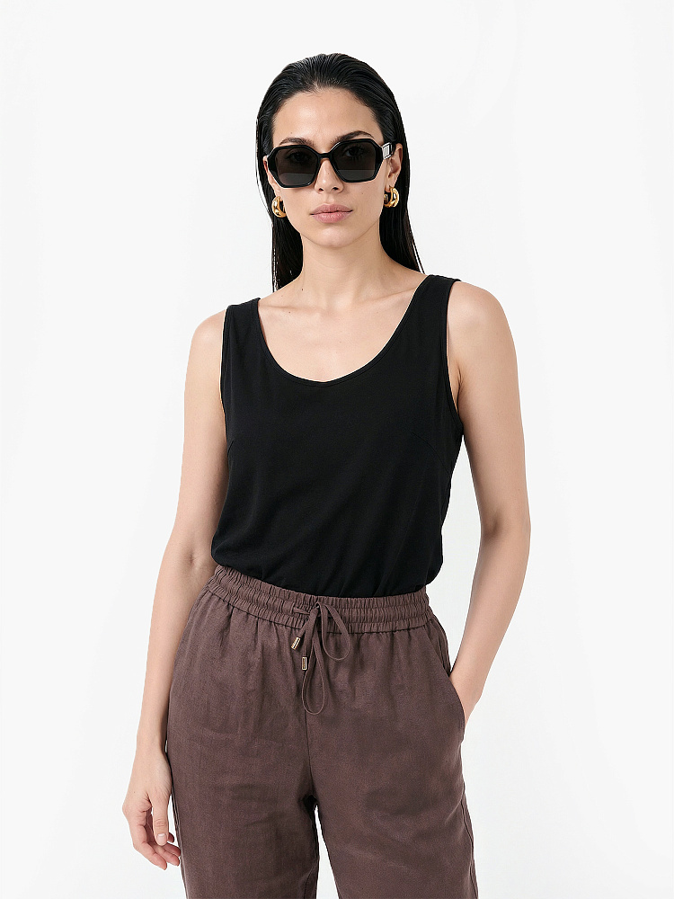 Легкий летний женский топ итальянского бренда FABRETTI черного цвета из тонкой и неплотной хлопковой ткани.У модели актуальный А-силуэт, глубокий округлый вырез горловины с обтачкой.Легкий хлопок с добавлением синтетических волокон – идеальный материал для летнего сезона. Он отлично пропускает воздух, быстро отводит влагу от тела и также быстро сохнет.Однотонный топ – универсальный базовый аксессуар, которым можно дополнить юбки различной длины, джинсы, брюки и шорты, а также пиджаки, блейзеры и блузы. Она хорошо сочетается с одеждой с принтами, так как визуально «разгружает» образ, делая его более гармоничным и сбалансированным.