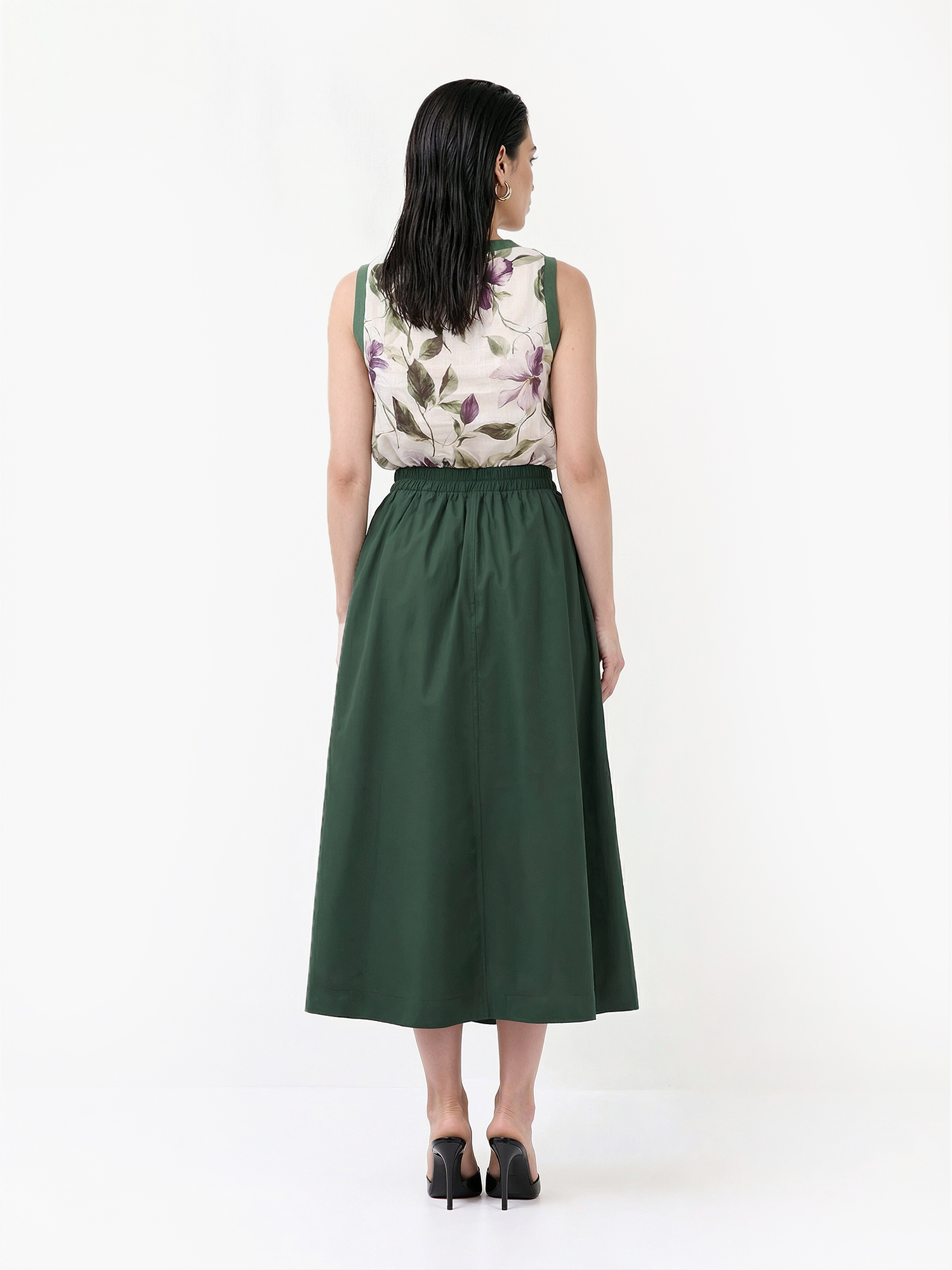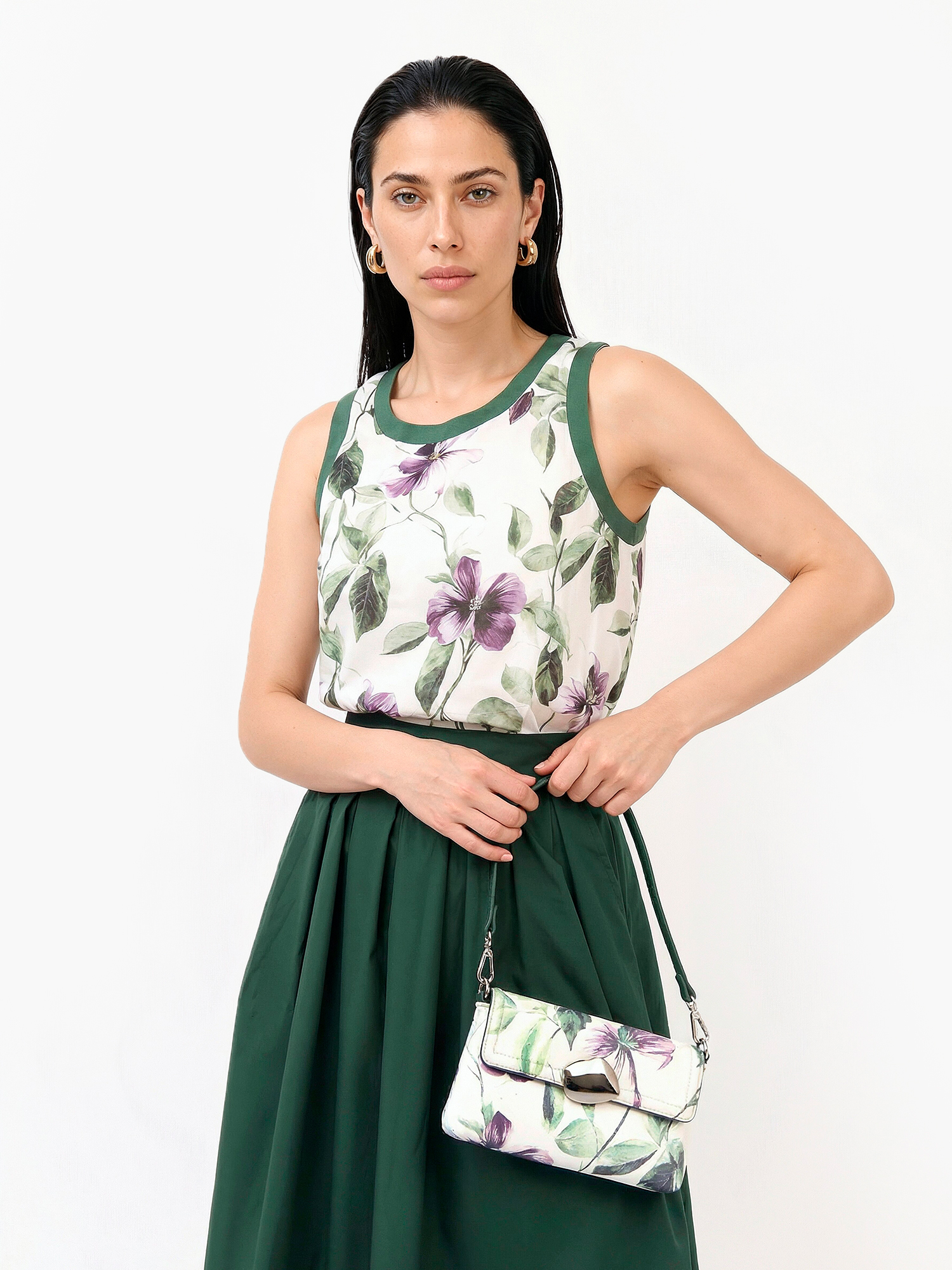 Легкий женский топ итальянского бренда FABRETTI создан для жаркого лета! Он выполнен из натурального дышащего материала рами с очень легкой, полупрозрачной фактурой. Лицевая часть дополнена тонкой подкладкой.У модели А-силуэт с вытачками на груди, округлый вырез горловина и пройма дополнены вставками из однотонного зеленого трикотажа в рубчик. Ткань украшена летним принтом с цветущими лозами, цветы дополнены сияющими стразами.Топ А-силуэта – хороший выбор для жаркой погоды. Он отлично сочетается с юбками любой длины, джинсами или шортами.