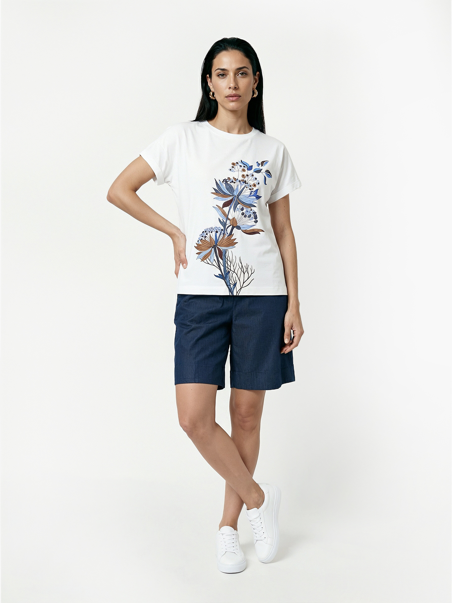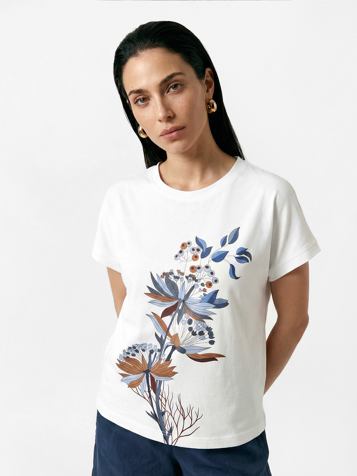 Летняя женская футболка итальянского бренда FABRETTI белого цвета с большим графичным принтом в виде полевых растений – базовая, но элегантная модель для повседневного летнего гардероба.У футболки легкий А-силуэт, укороченные рукава и округлый вырез горловины с обтачкой. По бокам небольшие разрезы. Ягоды на принте украшены сияющими красными стразами.Ткань модели – натуральный дышащий хлопок с добавлением эластана. Она хорошо держит форму без деформации, пропускает воздух и приятен к телу.Эта футболка – база, вокруг которой можно собрать разные образы – с однотонными или разноцветными брюками, юбками или шортами.