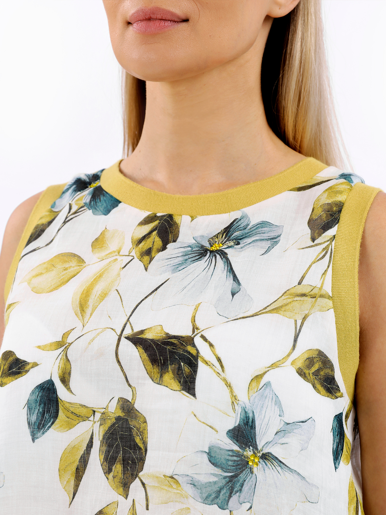 Легкий женский топ итальянского бренда FABRETTI создан для жаркого лета! Он выполнен из натурального дышащего материала рами с очень легкой, полупрозрачной фактурой. Лицевая часть дополнена тонкой подкладкой.У модели А-силуэт с вытачками на груди, округлый вырез горловина и пройма дополнены вставками из однотонного желто-зеленого трикотажа в рубчик. Ткань украшена летним принтом с цветущими лозами, цветы дополнены сияющими стразами.Топ А-силуэта – хороший выбор для жаркой погоды. Он отлично сочетается с юбками любой длины, джинсами или шортами.