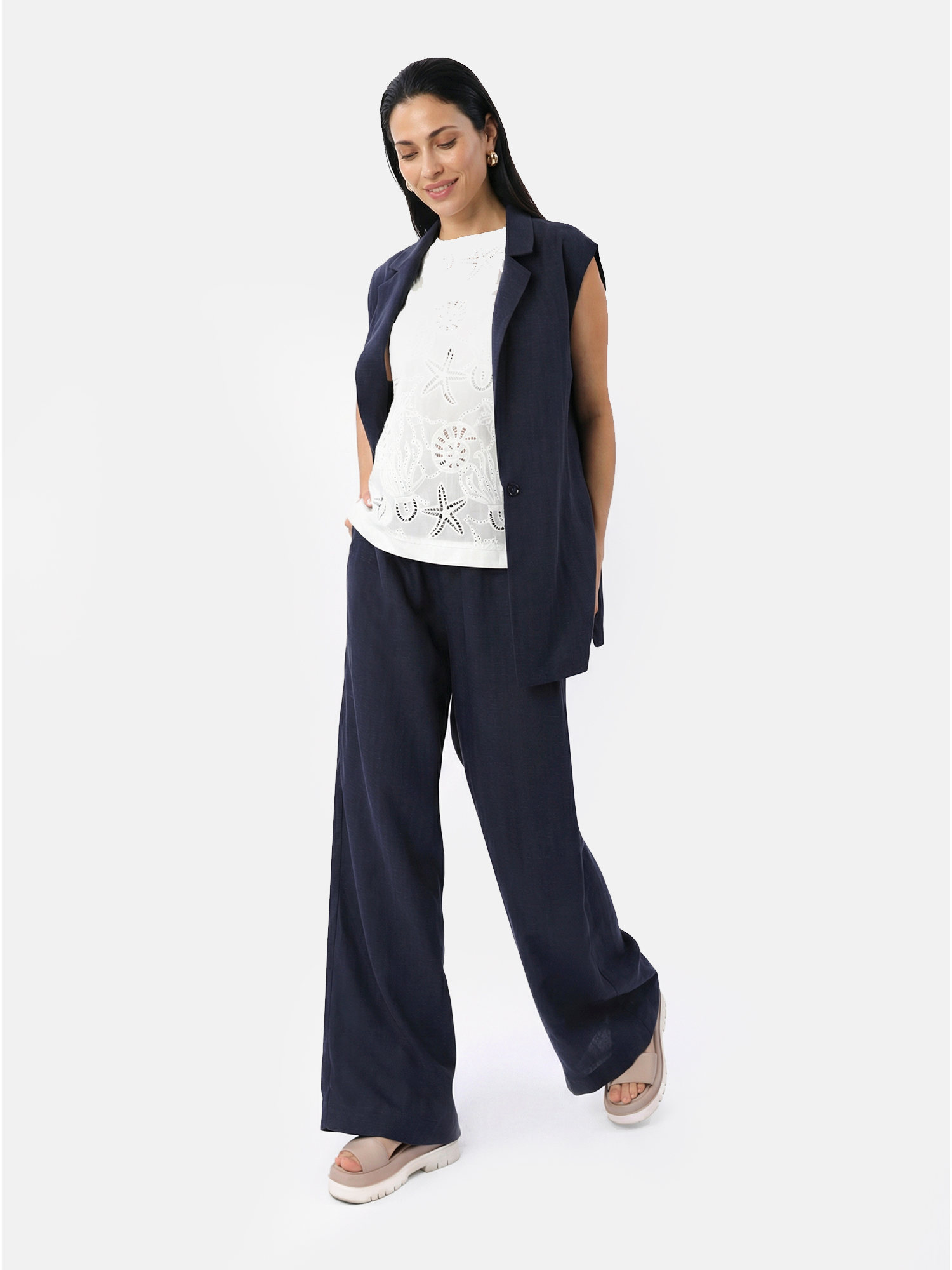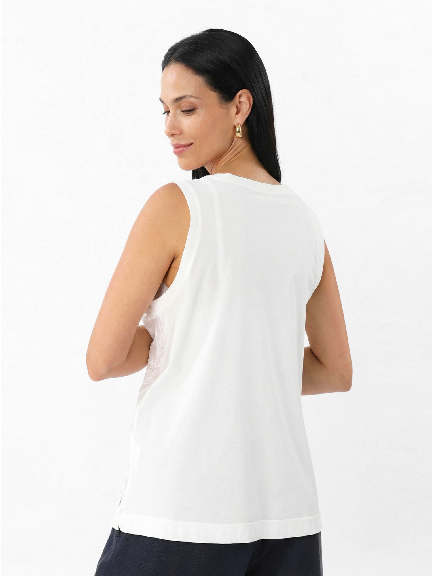 Легкий женский топ из коллекции итальянского бренда FABRETTI белого цвета с вышитыми морскими узорами.У топа свободный А-силуэт, округлый вырез горловины и слегка заниженная пройма с окантовкой. По бокам небольшие разрезы.Лицевая часть украшена интересными вышитыми узорами в виде обитателей моря – морских звезд, ракушек, медуз. Вышивка эксклюзивно разработана для FABRETTI. Спинка однотонная, без узора.Этот топ поможет создать запоминающийся образ в морском или круизном стиле, если дополнить его одеждой синего цвета, тонкой полоской и ярко-красным акцентным аксессуаром. Также хорошо подойдут аксессуары из соломки.