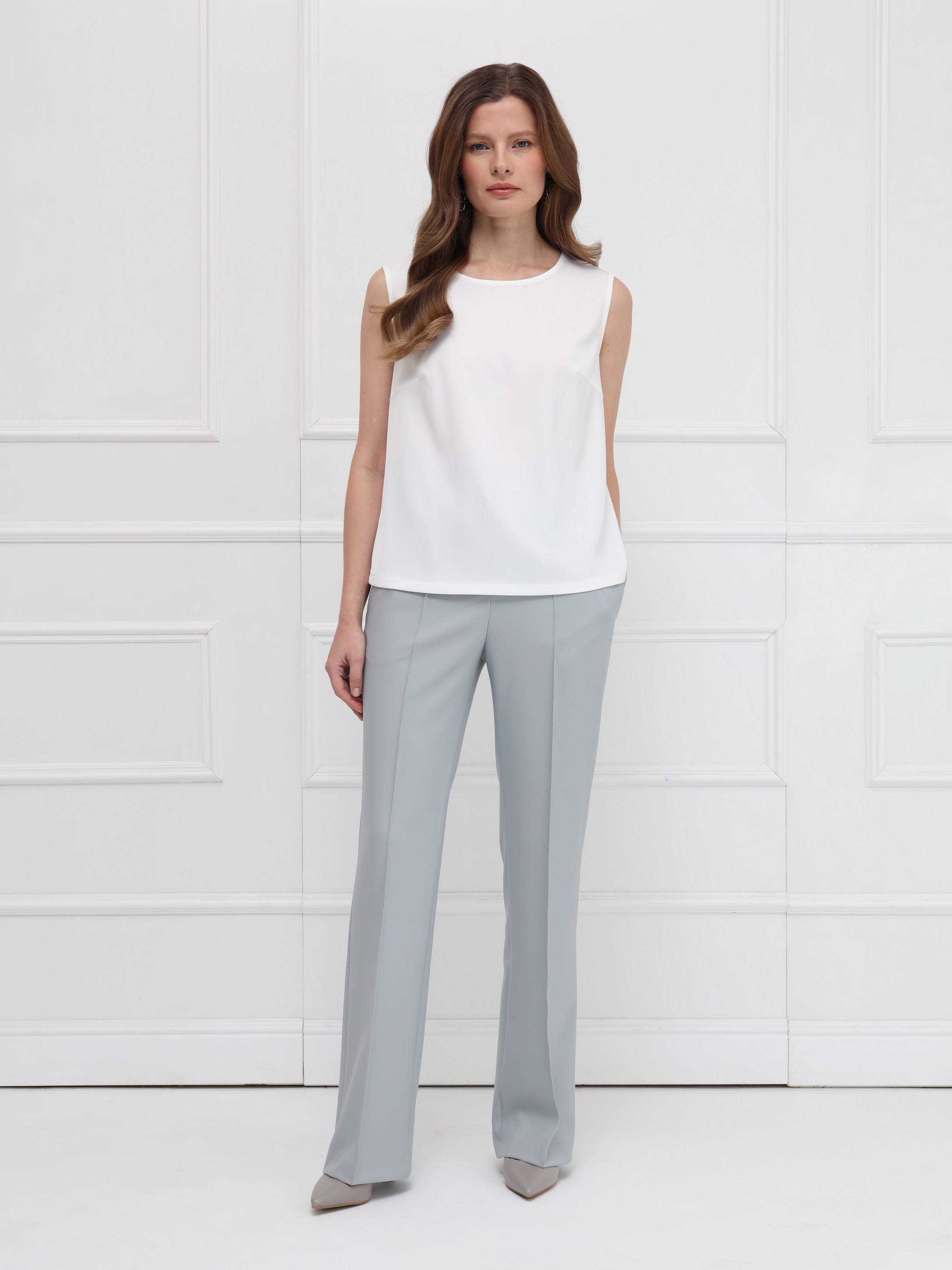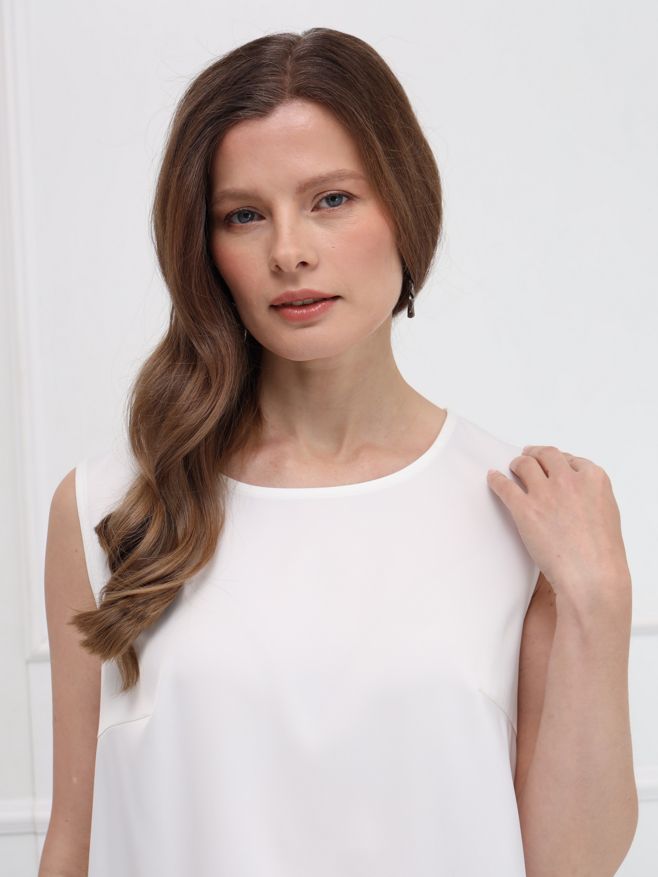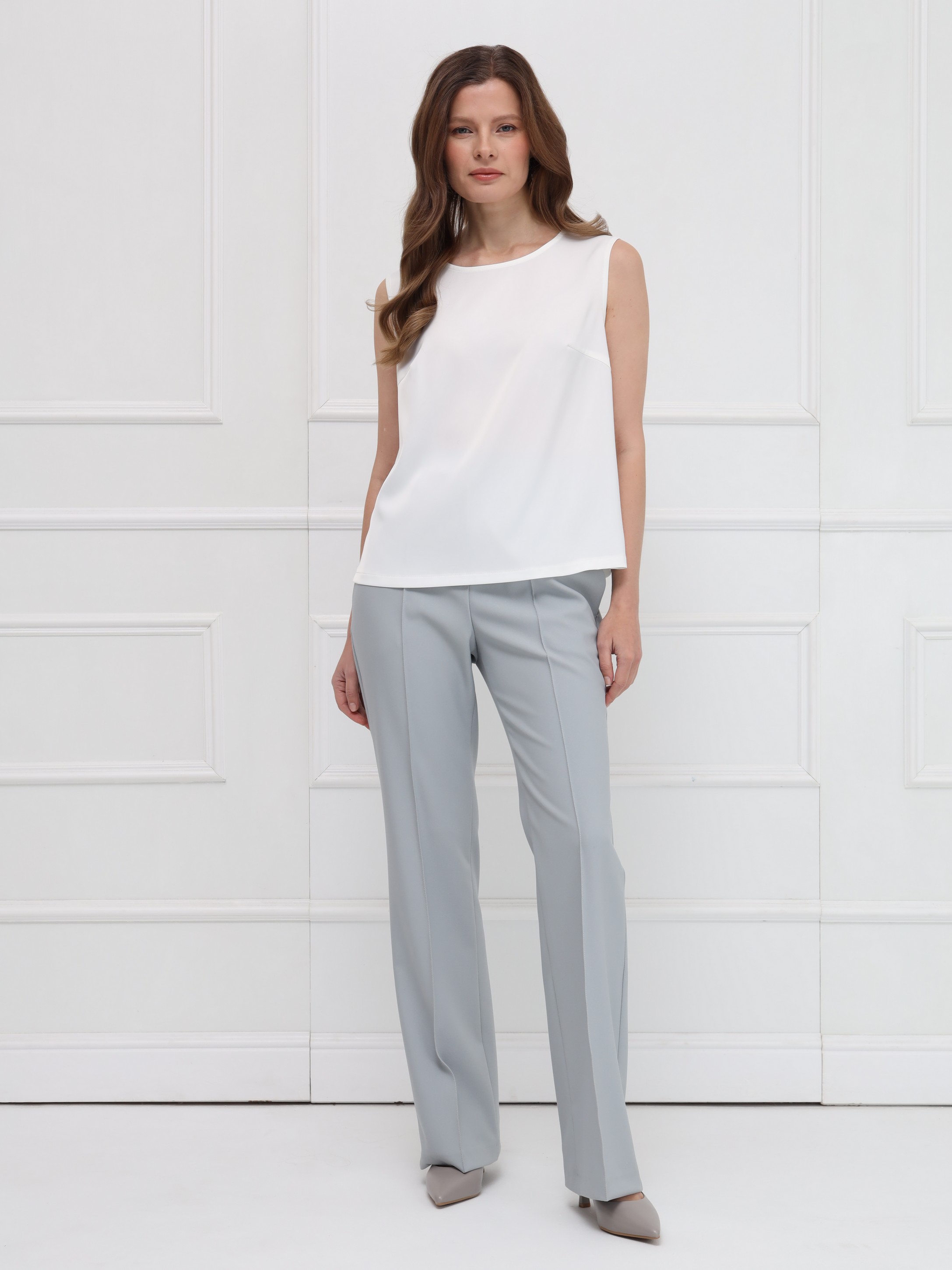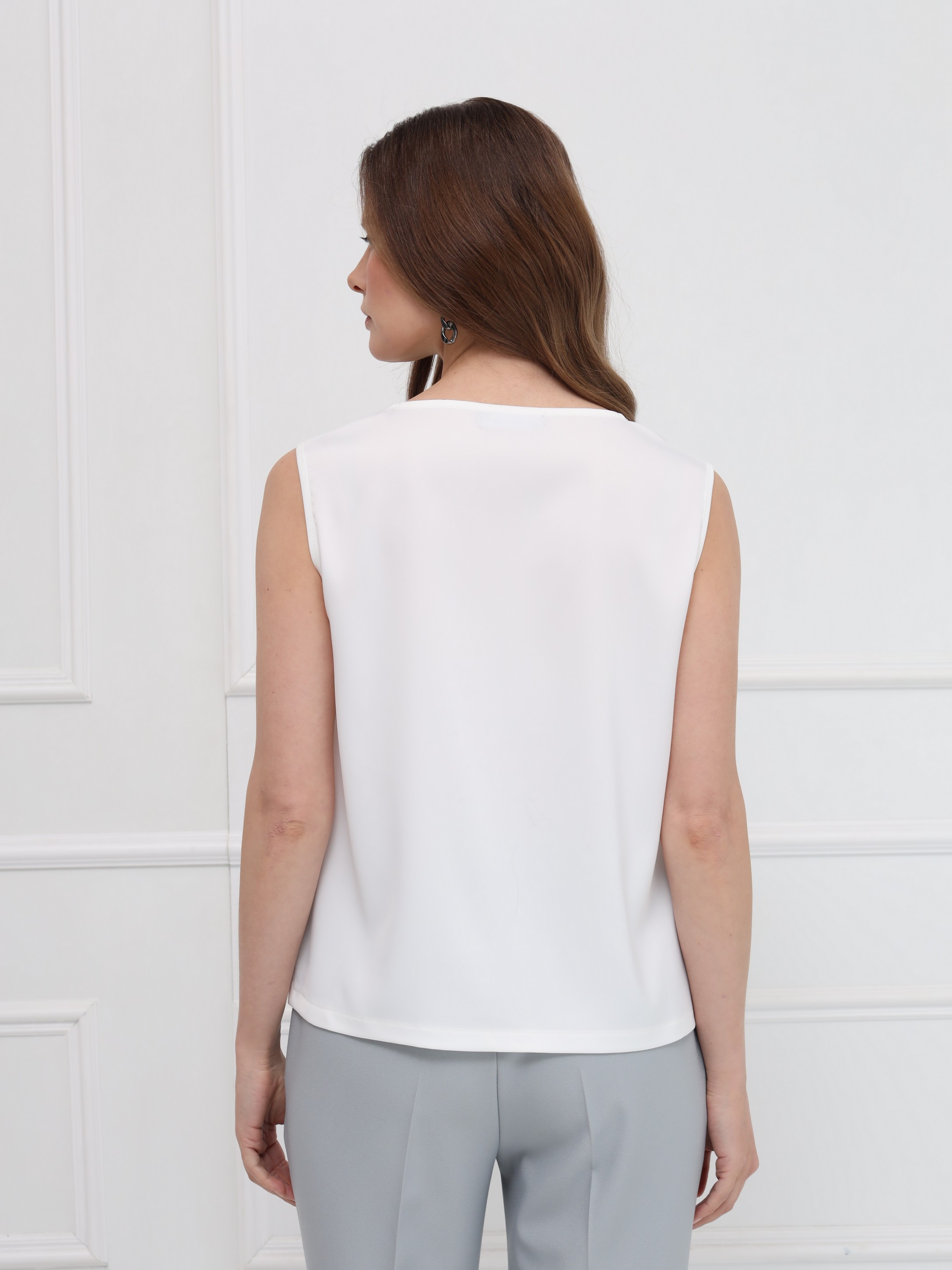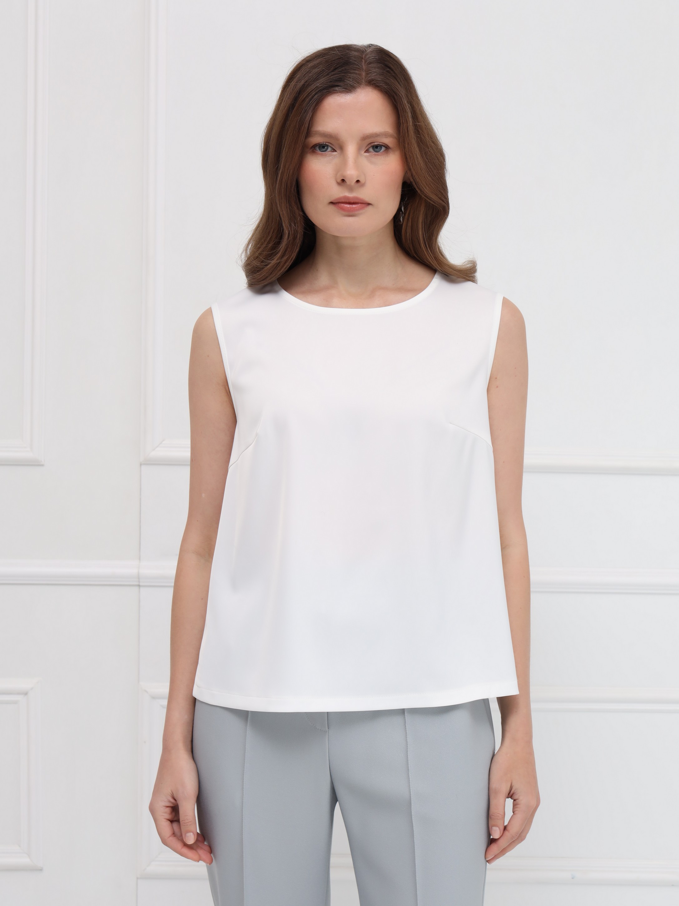 Топ из атласа без рукавов - лёгкая и элегантная база для продуманных образов. Прямой силуэт с круглой горловиной и небольшими боковыми разрезами обеспечивает комфорт и свободу движений. Модель идеально подходит для ношения под жакеты или как самостоятельный акцент в весенних ансамблях.