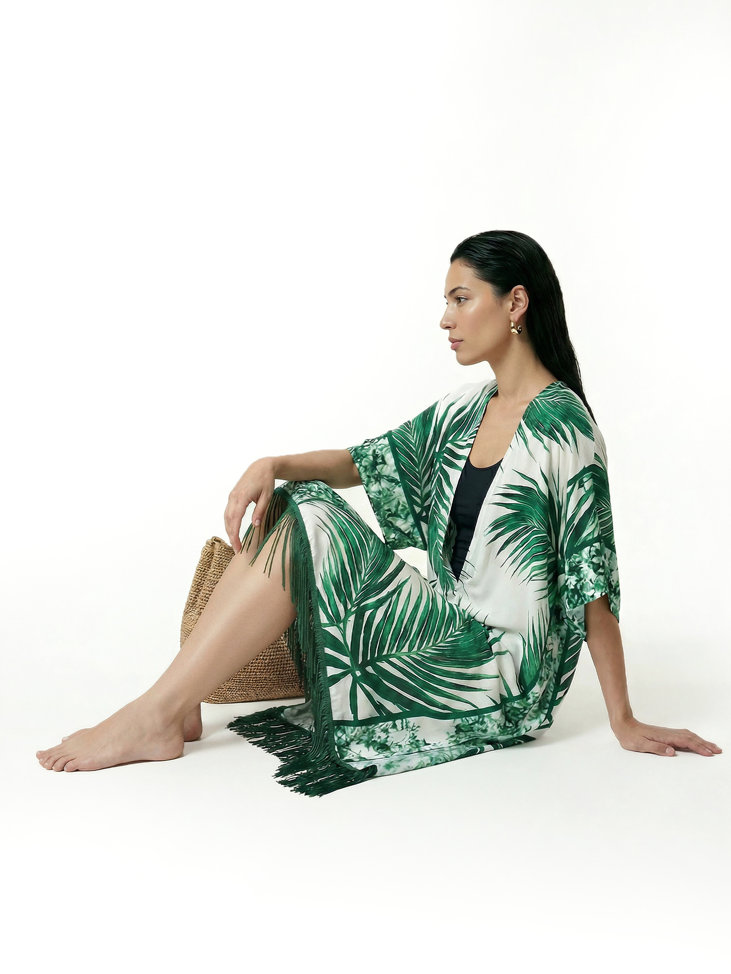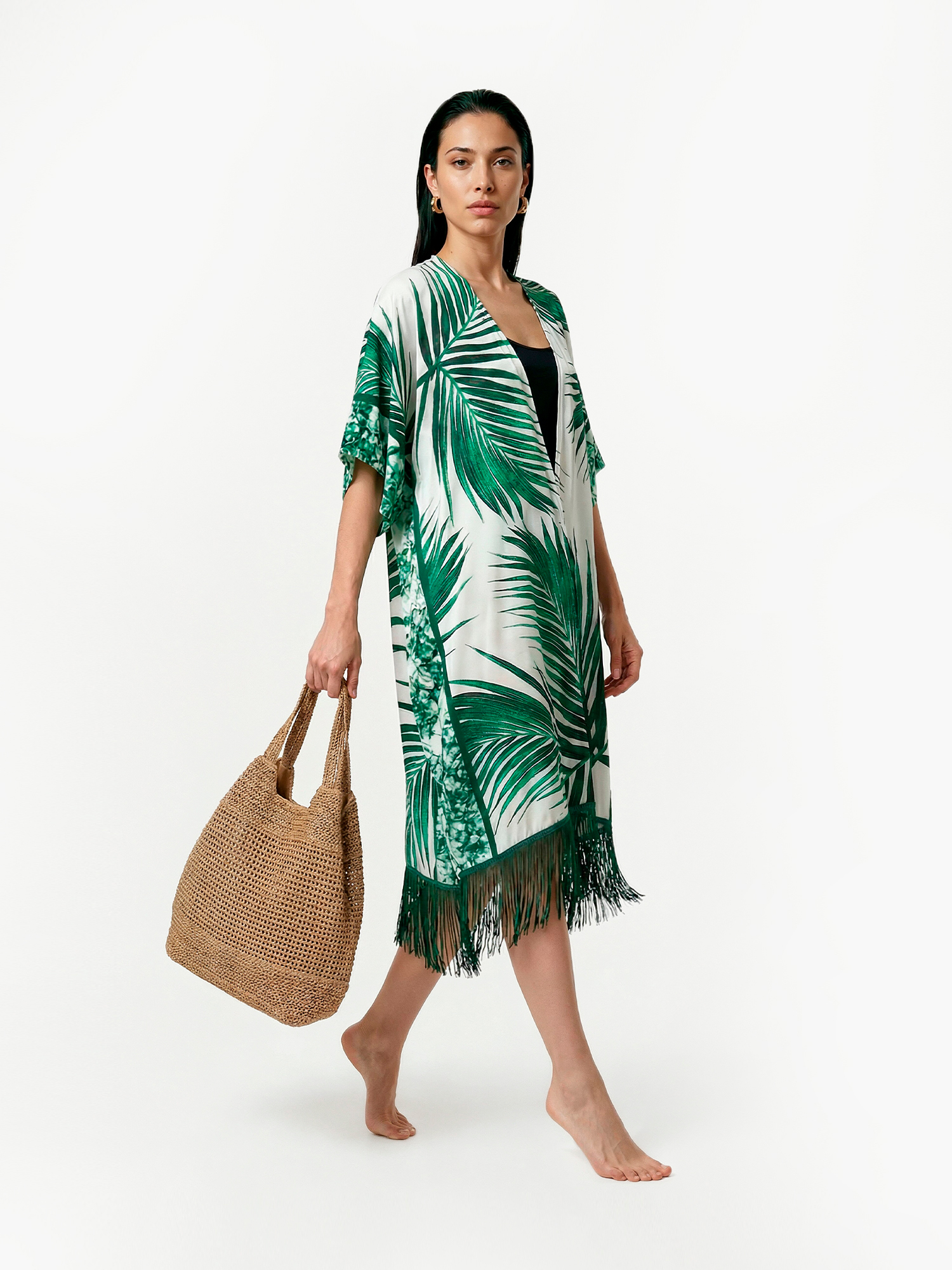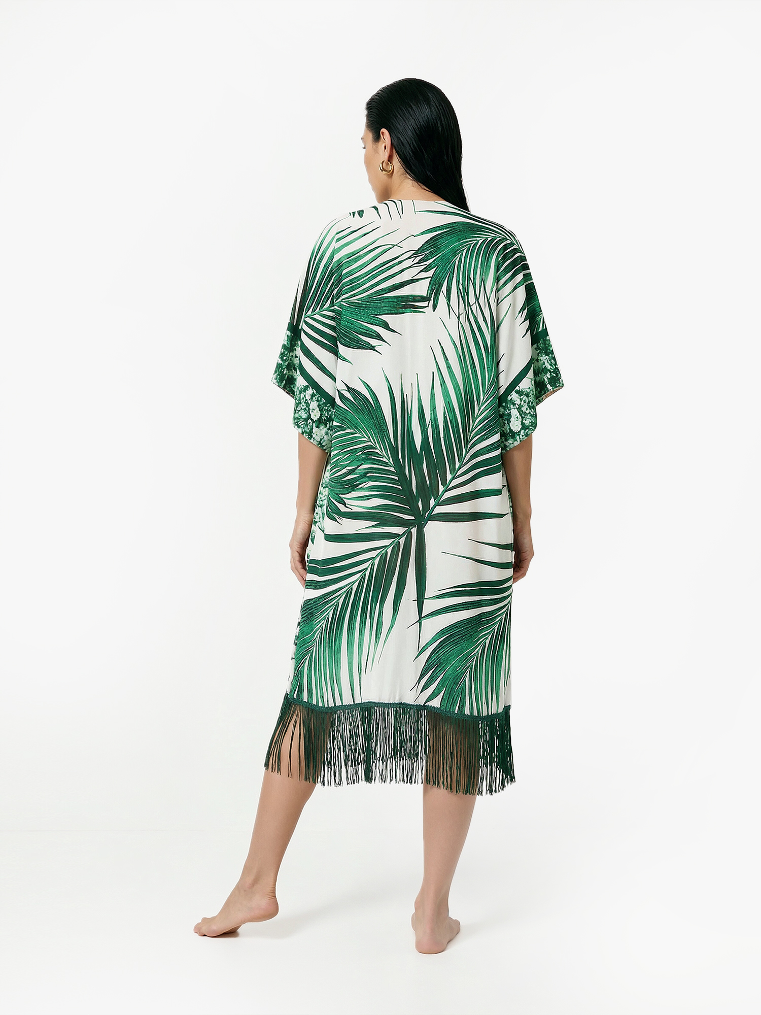 Свободная летняя туника-накидка из пляжной коллекции итальянского бренда FABRETTI с ярким принтом на тропическую тему и бахромой.Эта супер свободная модель-оверсайз идеально подходит для пляжного гардероба. У нее прямой крой, короткие рукава, по бокам сделаны высокие разрезы.Белая ткань туники украшена изумрудным рисунком в виде пальмовых листьев, поддерживает дизайн длинная темно-зеленая бахрома по низу. Этот дизайн идеально подходит для пляжного стиля и хорошо сочетается с однотонными купальниками и аксессуарами из соломки. Туника также может выступить центральным элементом для смелого бохо-образа – с шортами или юбкой, легким топом, аксессуарами и бижутерией из натуральных материалов.Ткань туники сочетает легкие дышащие материалы – район и вискозу, которые быстро сохнут и устойчивы к воздействию ультрафиолета, соленой или хлорированной воды. Идеальное решение для летнего отпуска у моря.