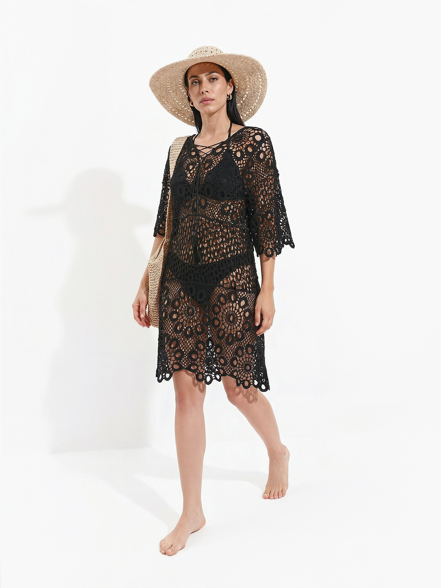 Ажурное платье-туника из пляжной коллекции итальянского бренда FABRETTI в черном цвете великолепно смотрится на загорелой коже! Эта модель идеально подчеркивает фигуру, создает эффектный образ и остается комфортной и в жаркую погоду, и после купания.У платья прямой крой, широкие короткие рукава, V-образный вырез горловины с декоративной шнуровкой. Модель выполнена в «вязаном» геометрическом узоре из нежной дышащей вискозы.