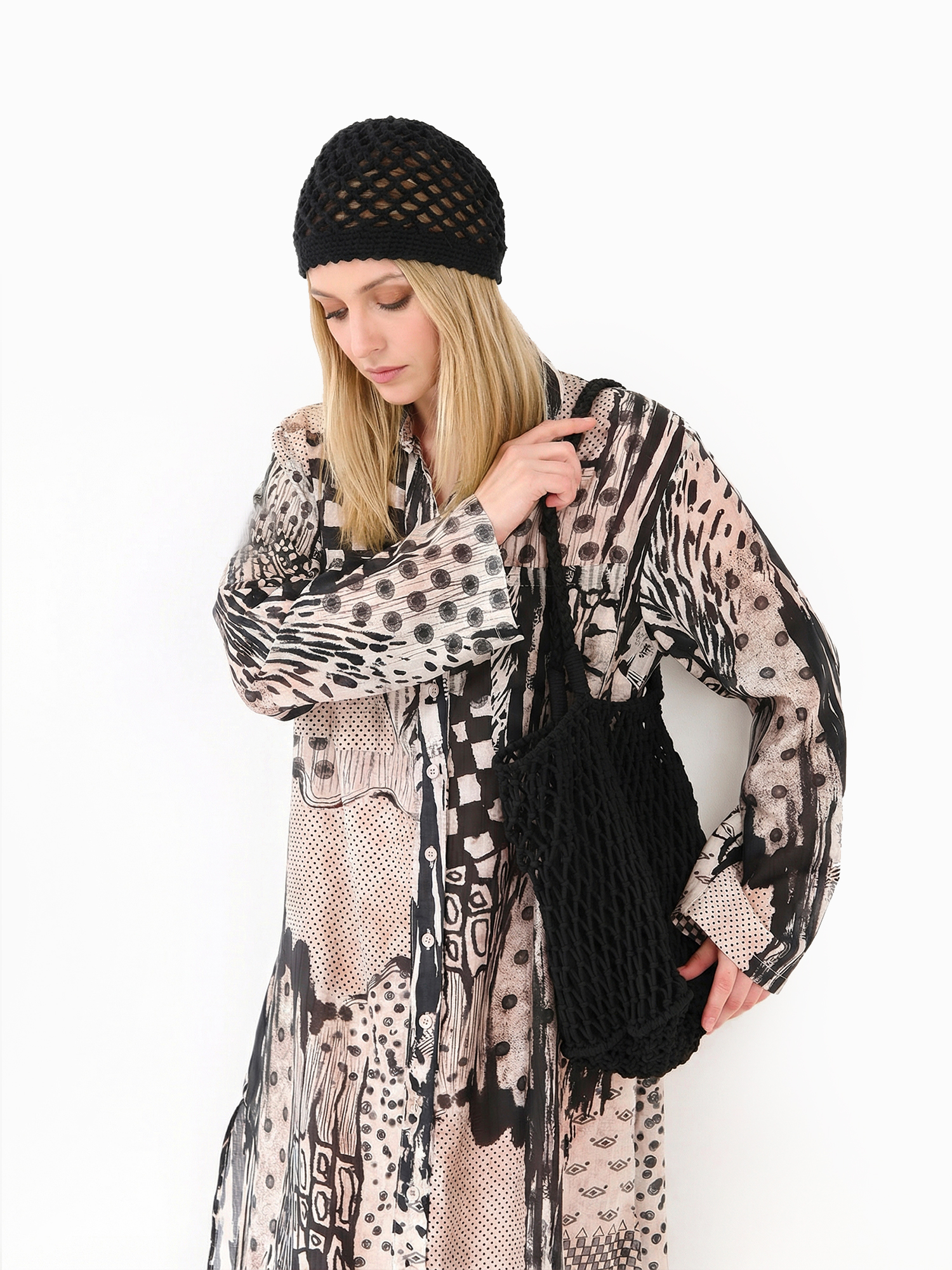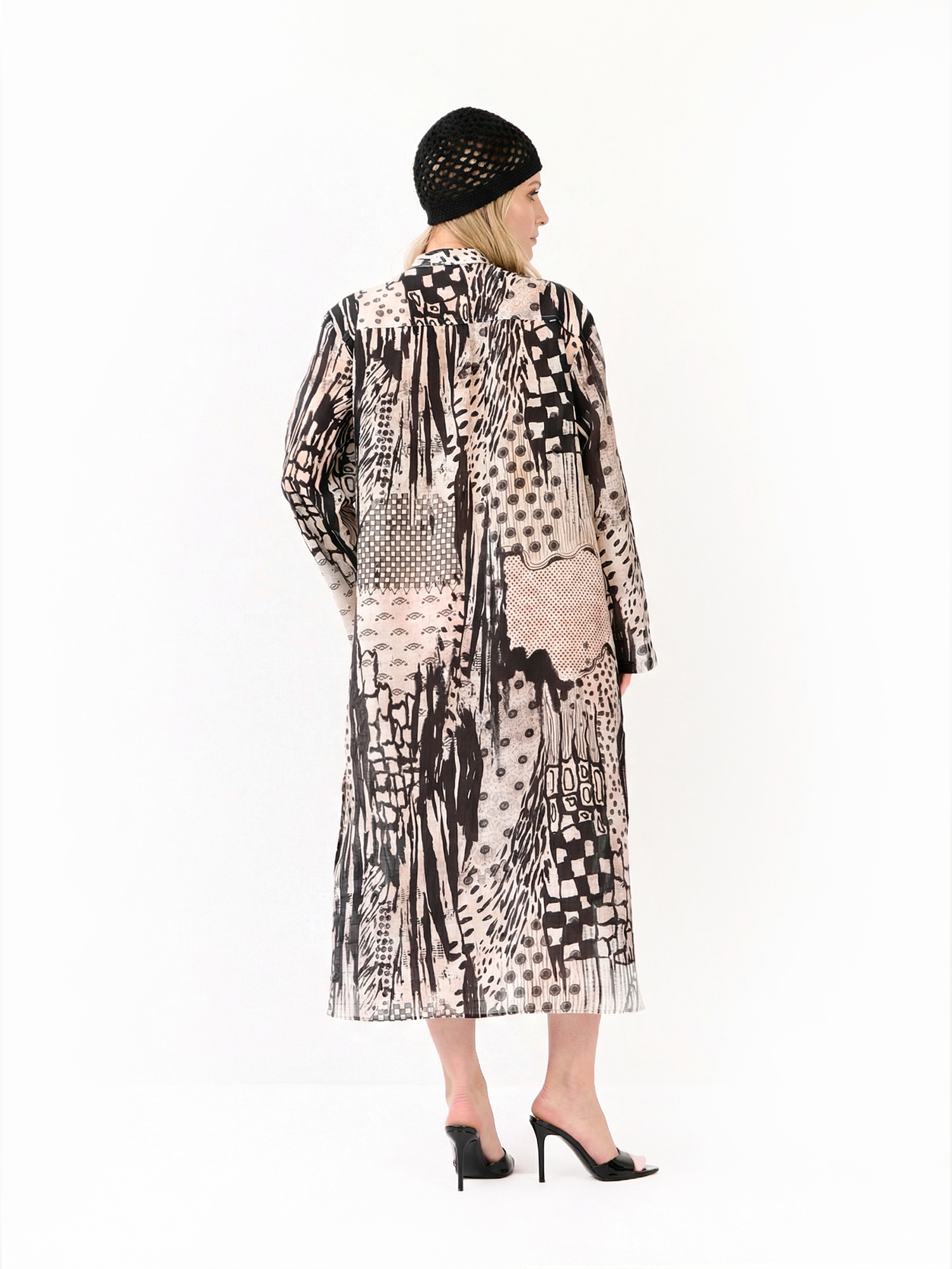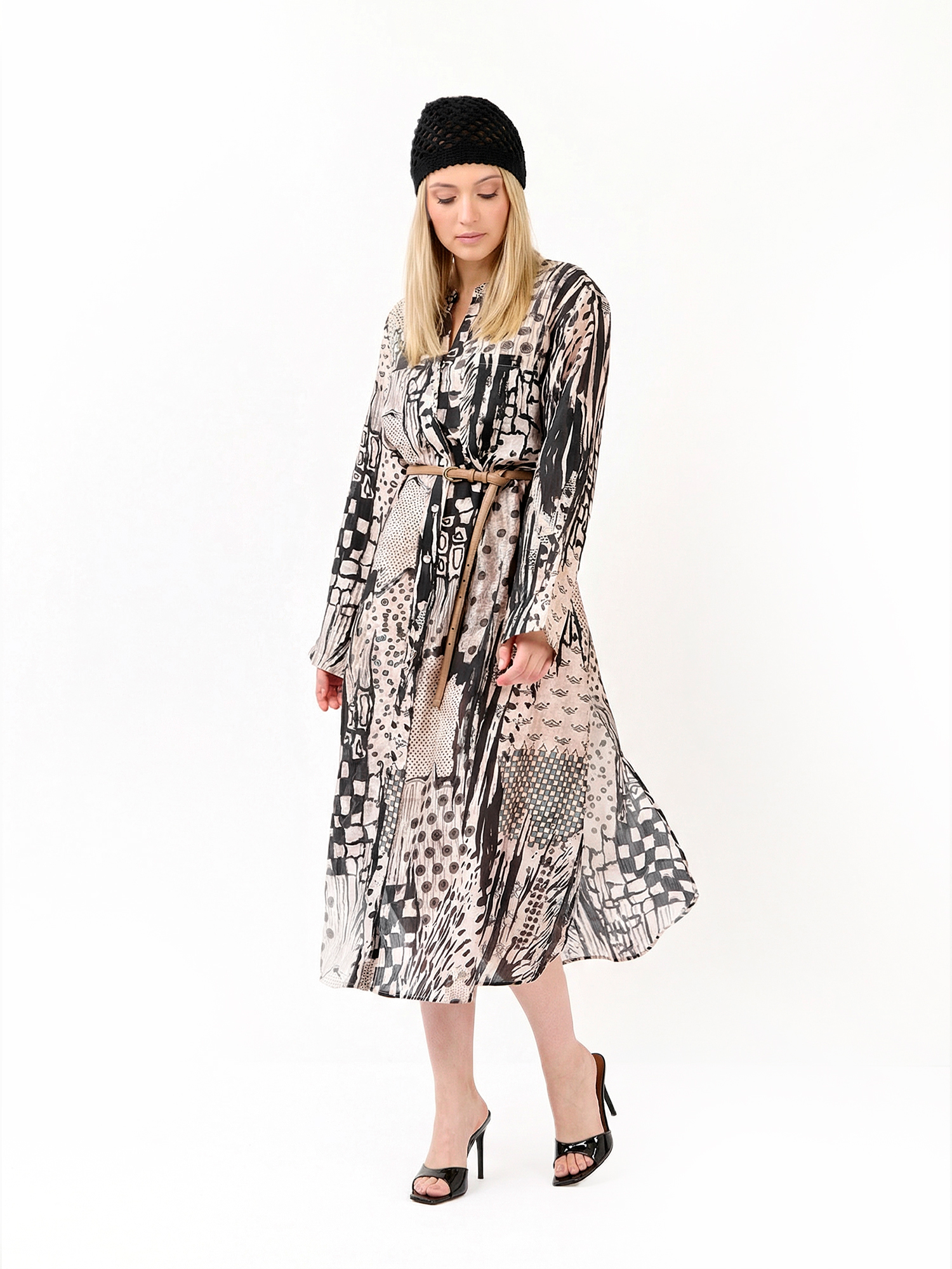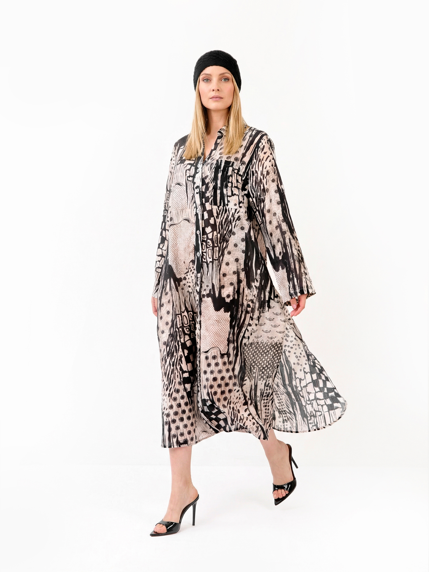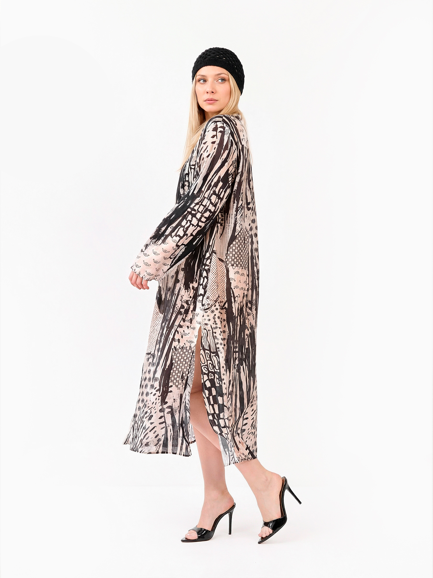 Легкое и элегантное длинное летнее платье итальянского бренда FABRETTI идеально подходит для пляжного отдыха и жаркого лета в городе. Оно выполнено из дышащего, полупрозрачного синтетического материала со сложным абстрактным узором в бежево-черном сочетании оттенков.У модели А-силуэт с вытачками под грудью и разрезами от колена по бокам. На груди накладные карманы. V-образный вырез горловины визуально удлиняет шею. Платье застегивается на планку с пуговицами, рукава также можно зафиксировать внутренним хлястиком с пуговицей.Эта легкая, летящая модель создает женственный и романтичный образ. Дополнить его можно аксессуарами из натуральных материалов – соломенной шляпкой или сумкой, плетеным текстильным поясом или бижутерией в стиле бохо.