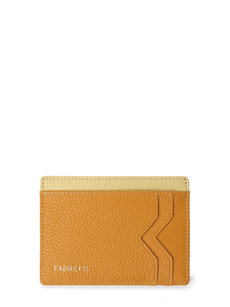 Небольшой лаконичный женский картхолдер итальянского бренда FABRETTI – практичный и компактный аксессуар в оригинальном ярком дизайне. Он выполнен из натуральной кожи с крупнозернистой фактурой, верх теплого оранжево-желтого «горчичного» оттенка, отделка внутреннего отделения из светло-лимонной кожи. Внутри картхолдер дополнен подкладкой с узором в стиле «логомании».У визитницы по два слота для карт и одному открытому карману с каждой стороны и центральное отделение для карт или сложенных купюр. В качестве лаконичного декора использован золотой печатный логотип в нижнем углу.