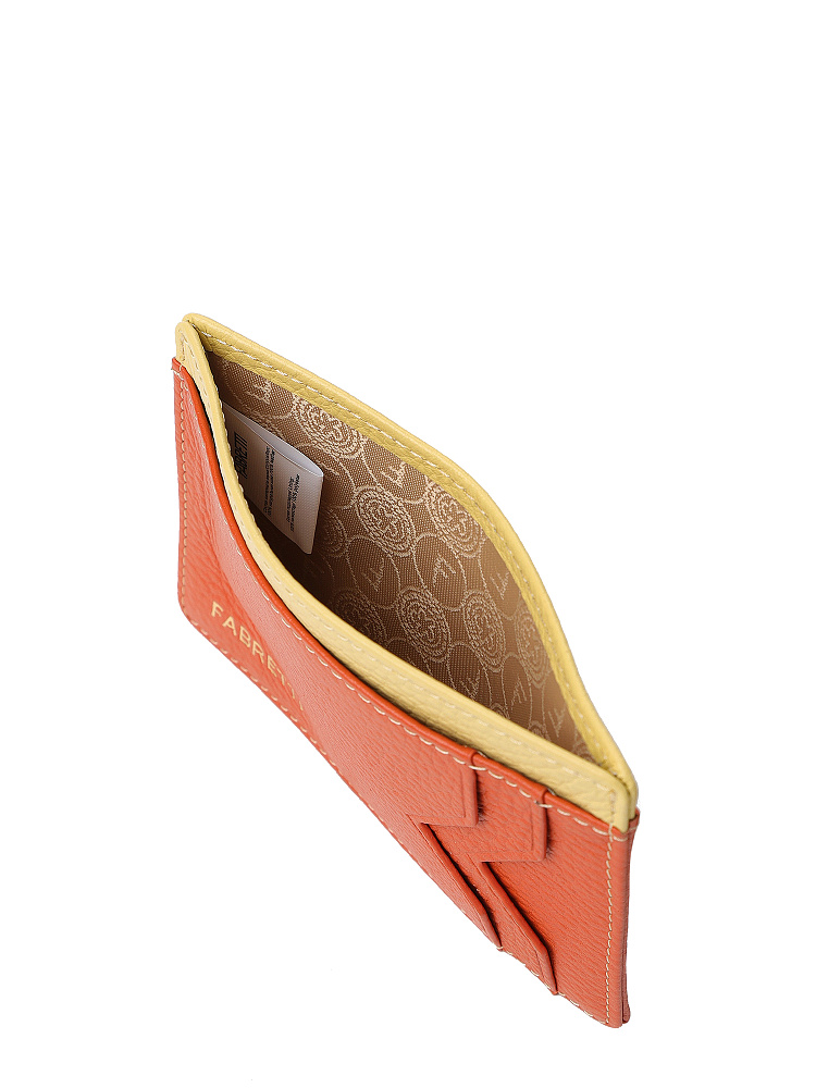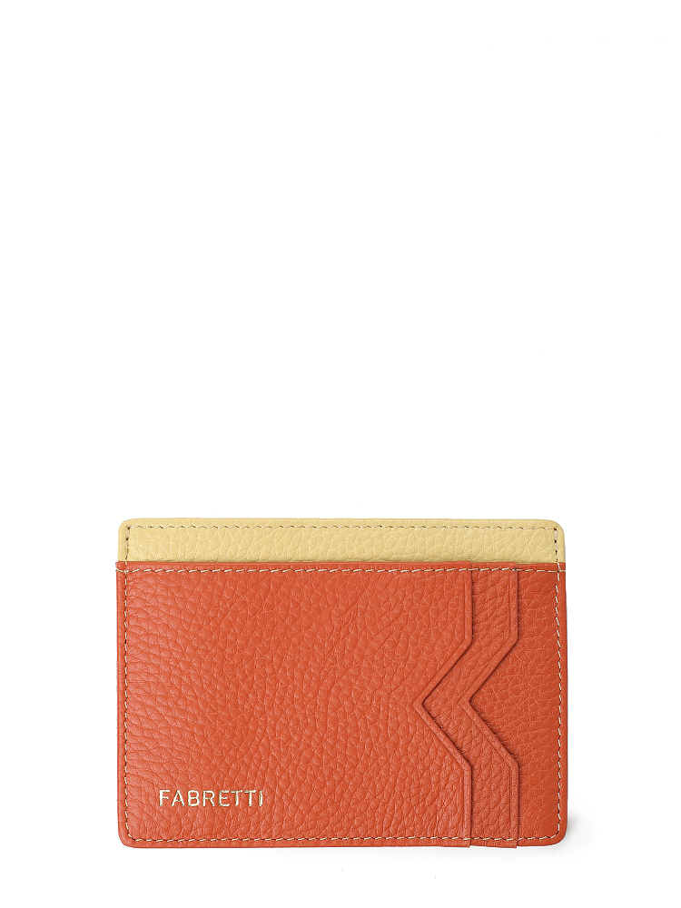 Небольшой лаконичный женский картхолдер итальянского бренда FABRETTI – практичный и компактный аксессуар в оригинальном ярком дизайне. Он выполнен из натуральной кожи с крупнозернистой фактурой, верх теплого тыквенно-оранжевого оттенка, отделка внутреннего отделения из светло-лимонной кожи. Внутри картхолдер дополнен подкладкой с узором в стиле «логомании».У визитницы по два слота для карт и одному открытому карману с каждой стороны и центральное отделение для карт или сложенных купюр. В качестве лаконичного декора использован золотой печатный логотип в нижнем углу.