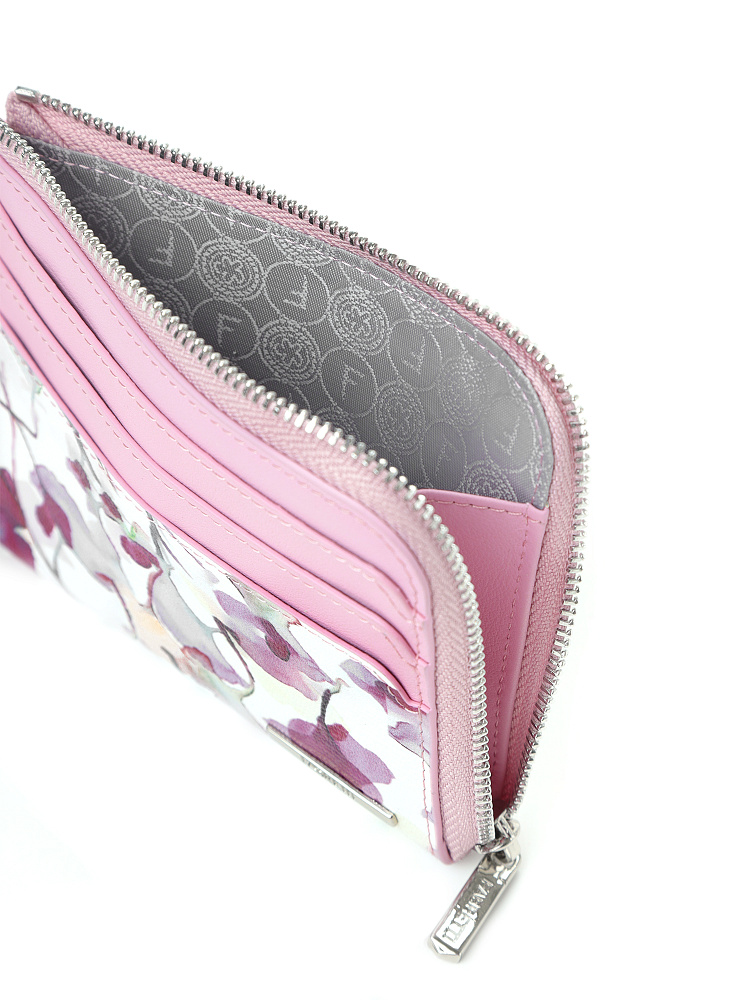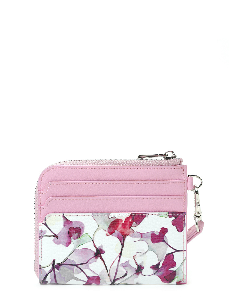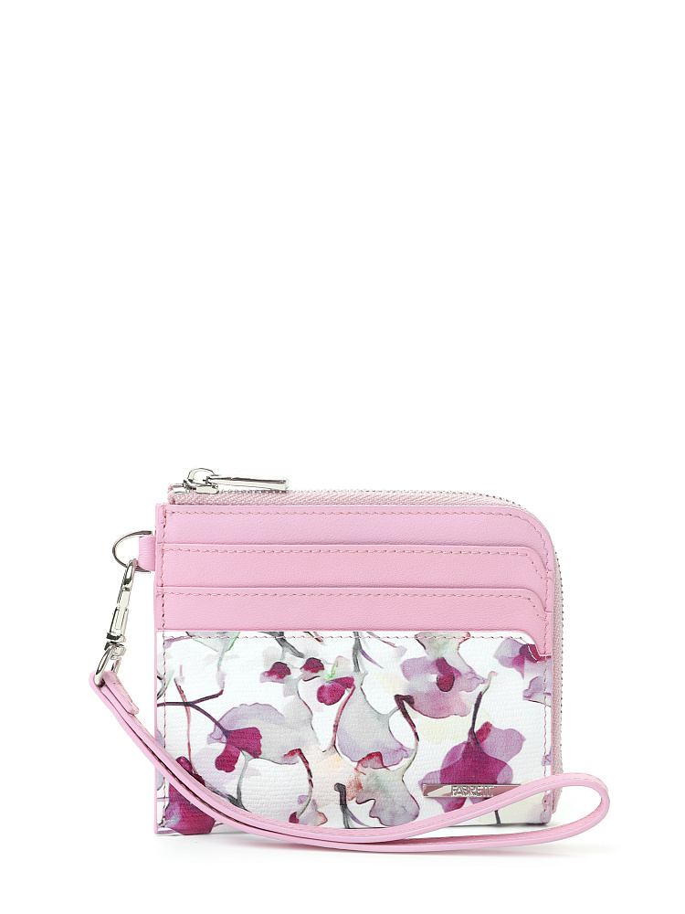Милая женская визитница итальянского бренда FABRETTI из натуральной кожи с цифровой печатью. Дизайн модели сочетает узор из лилово-розовых акварельных цветов на белом фоне и вставки нежного розового цвета.У картхолдера одно основное отделение для купюр на молнии и шесть слотов для карт. Аксессуар удобно носить в руке или на запястье благодаря съемному ремешку-петле на карабине.