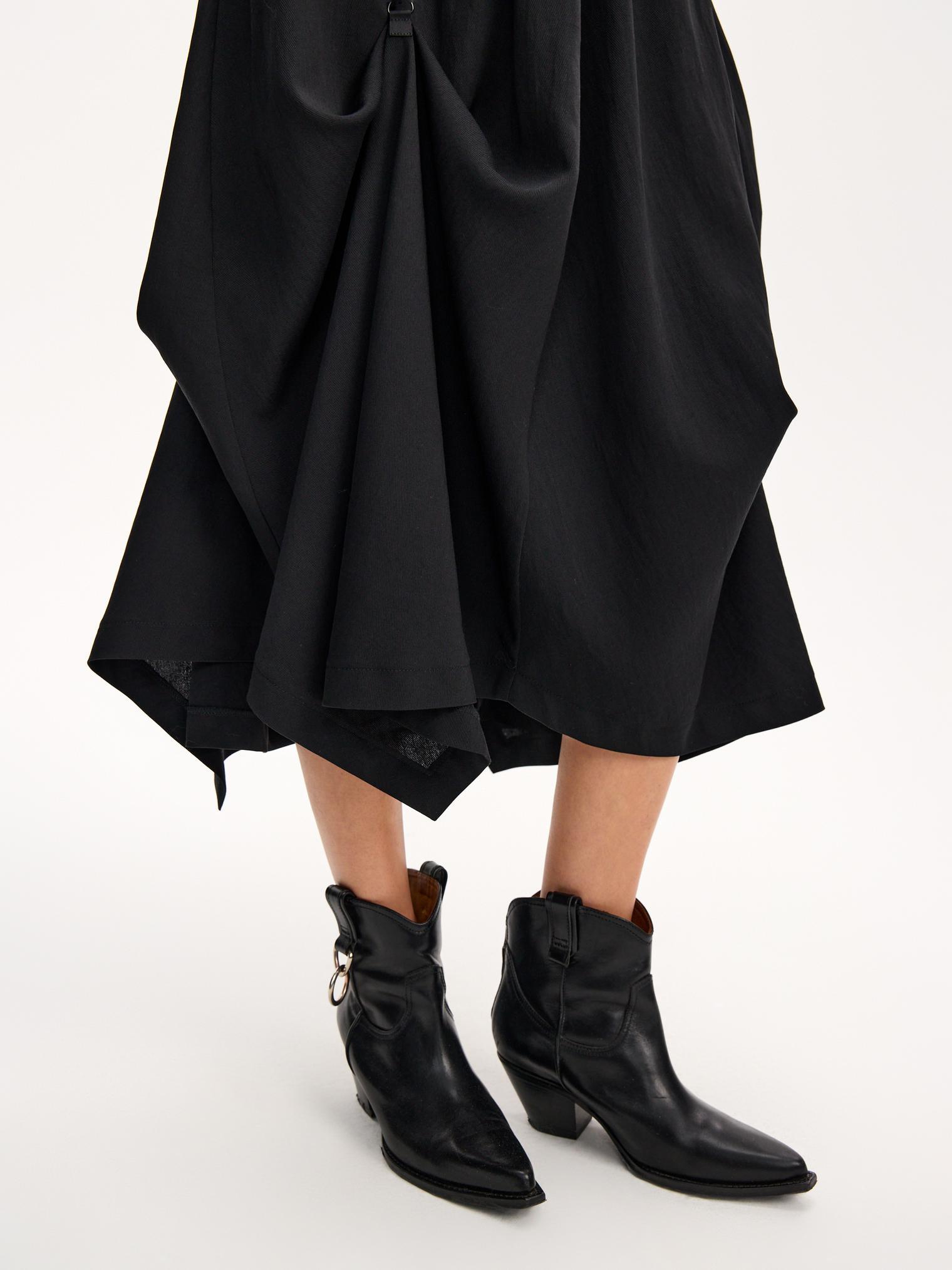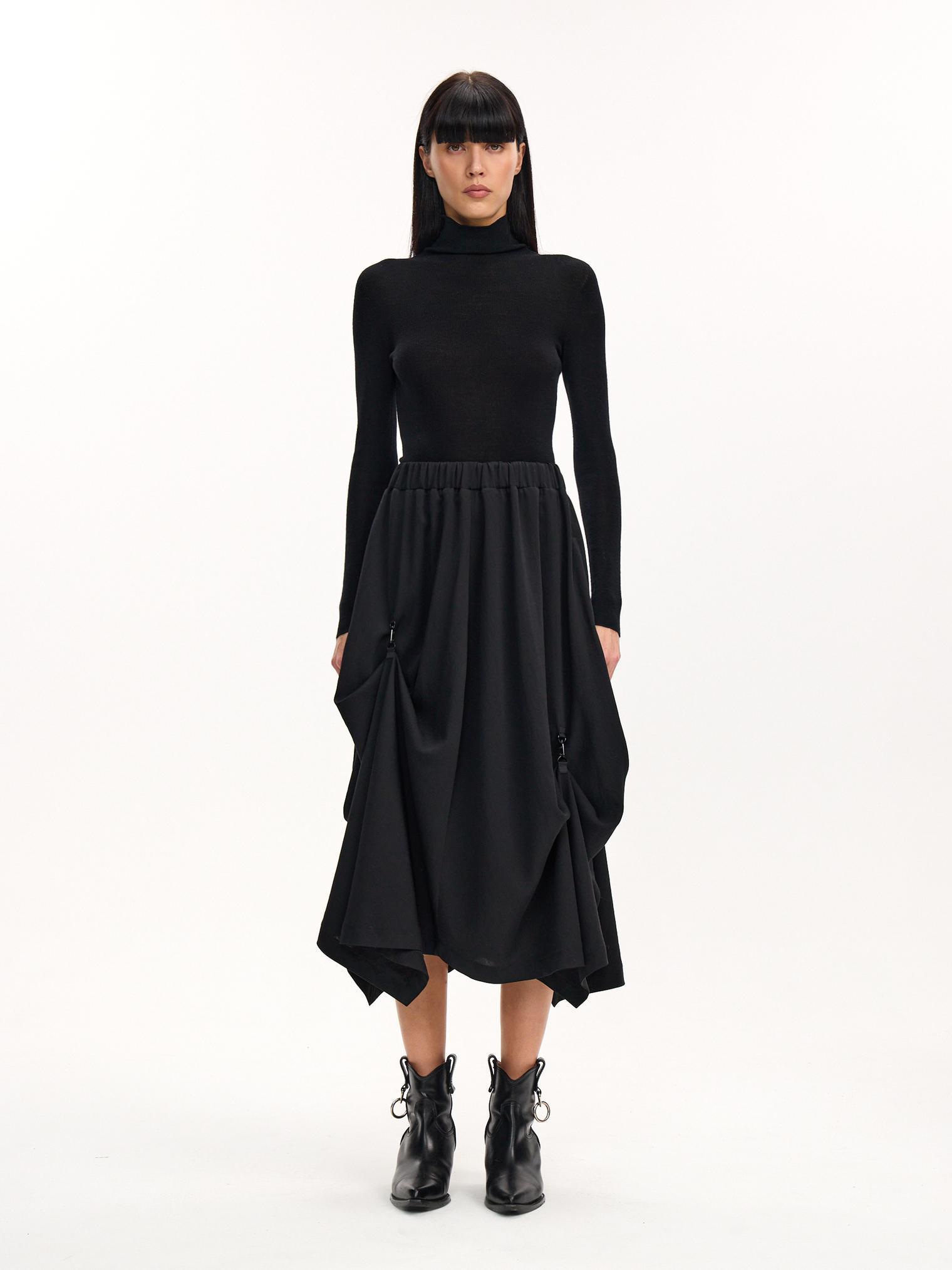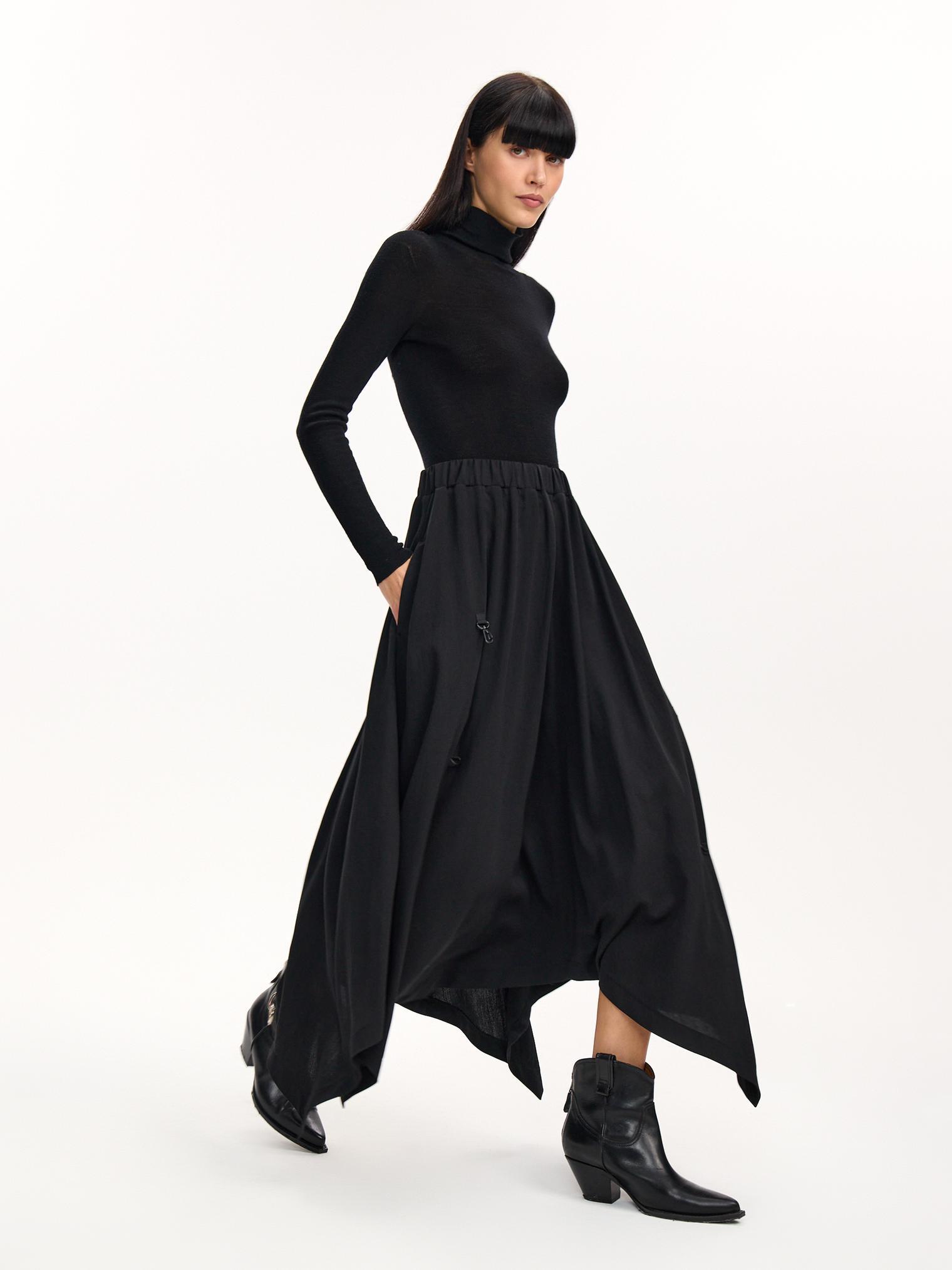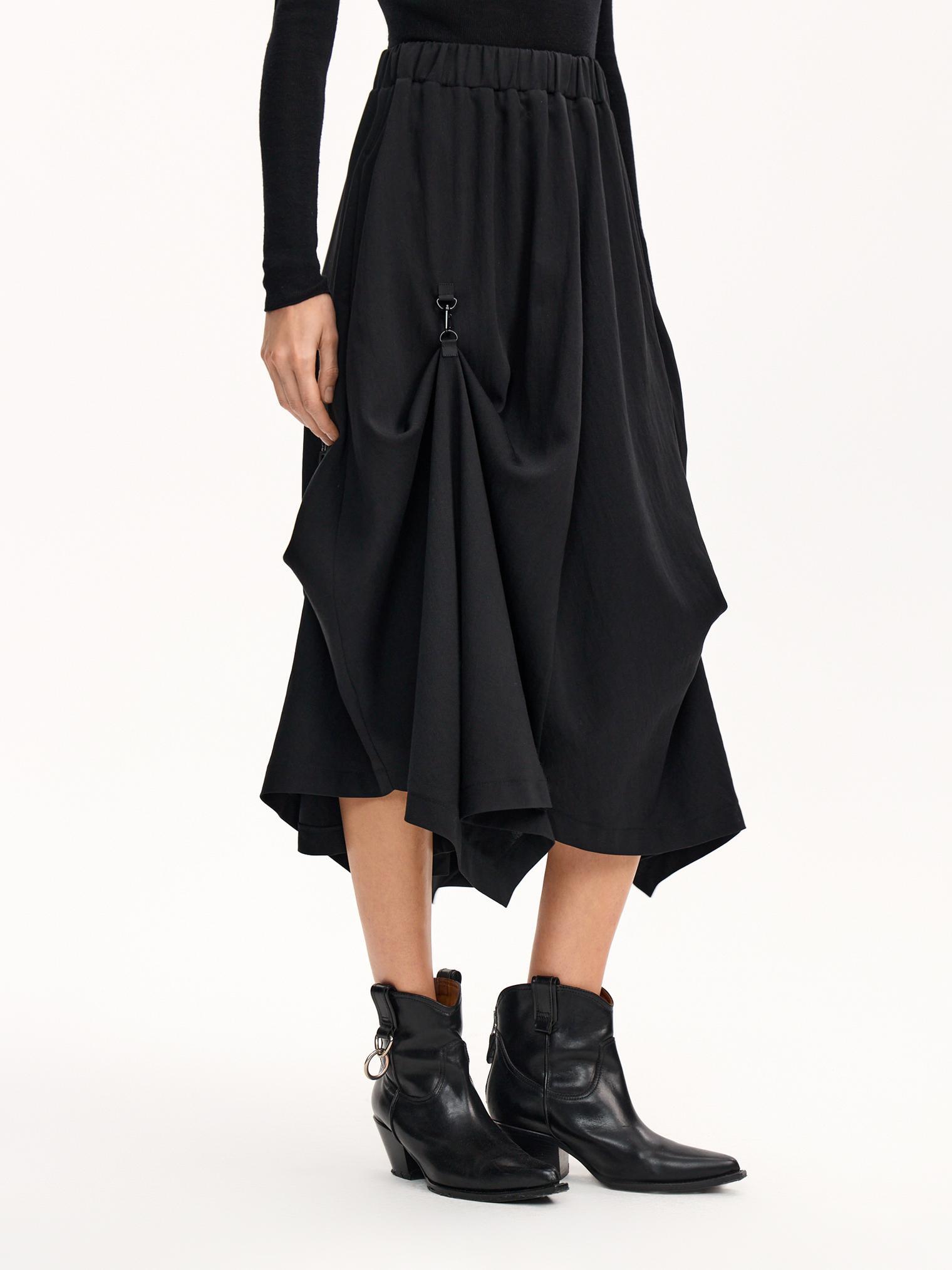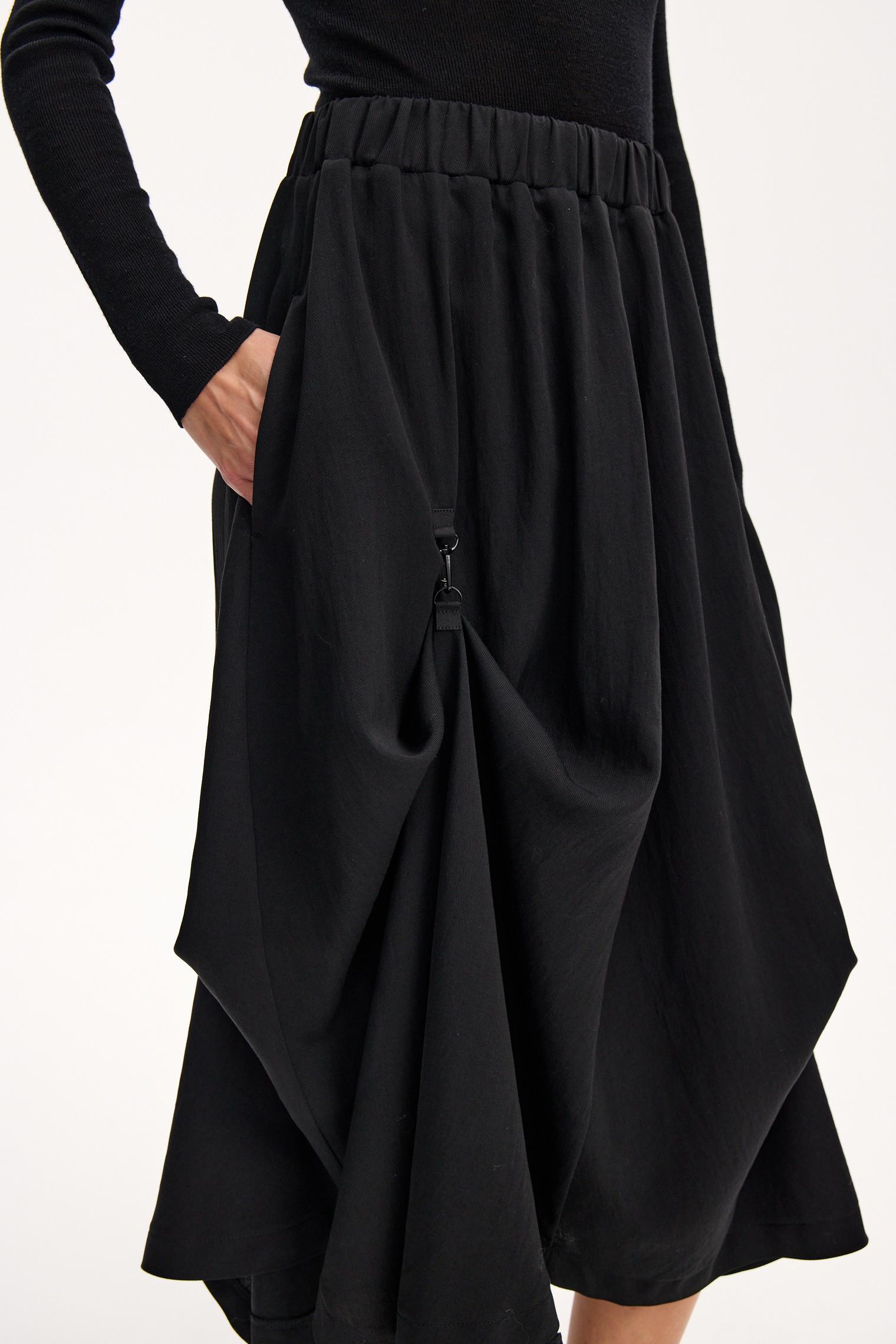 Юбка-трансформер на эластичной талии понравится тем, кто любит оригинальный крой и комфортную посадку. Модель из мягкого тенселя с подолом асимметричной длины. Меняйте длину и степень сборки, перемещая застежки карабинов. Она станет акцентным элементом образа.