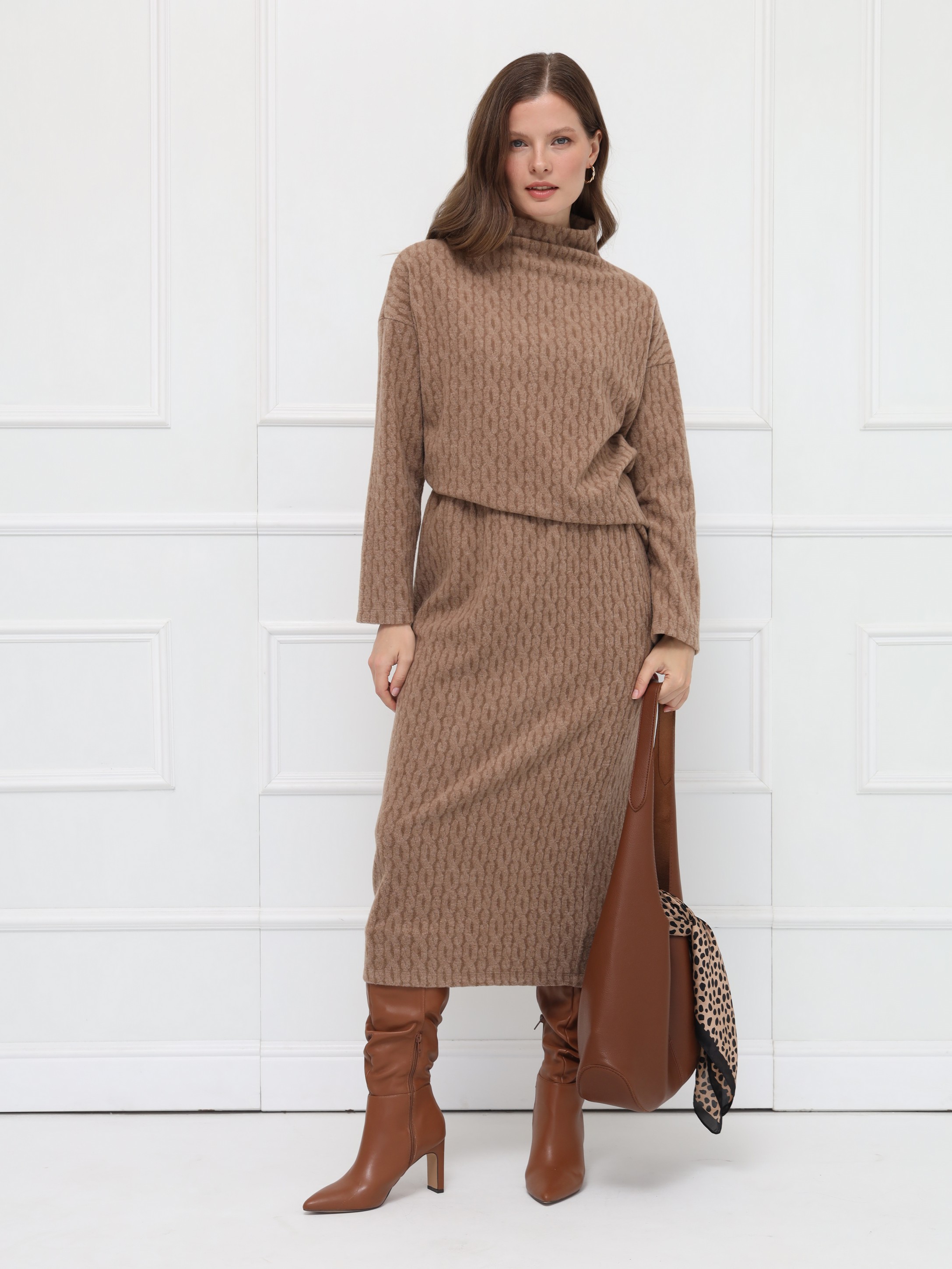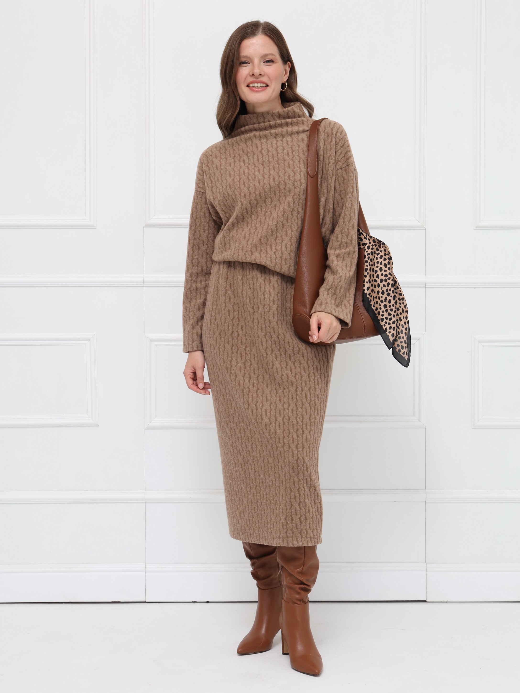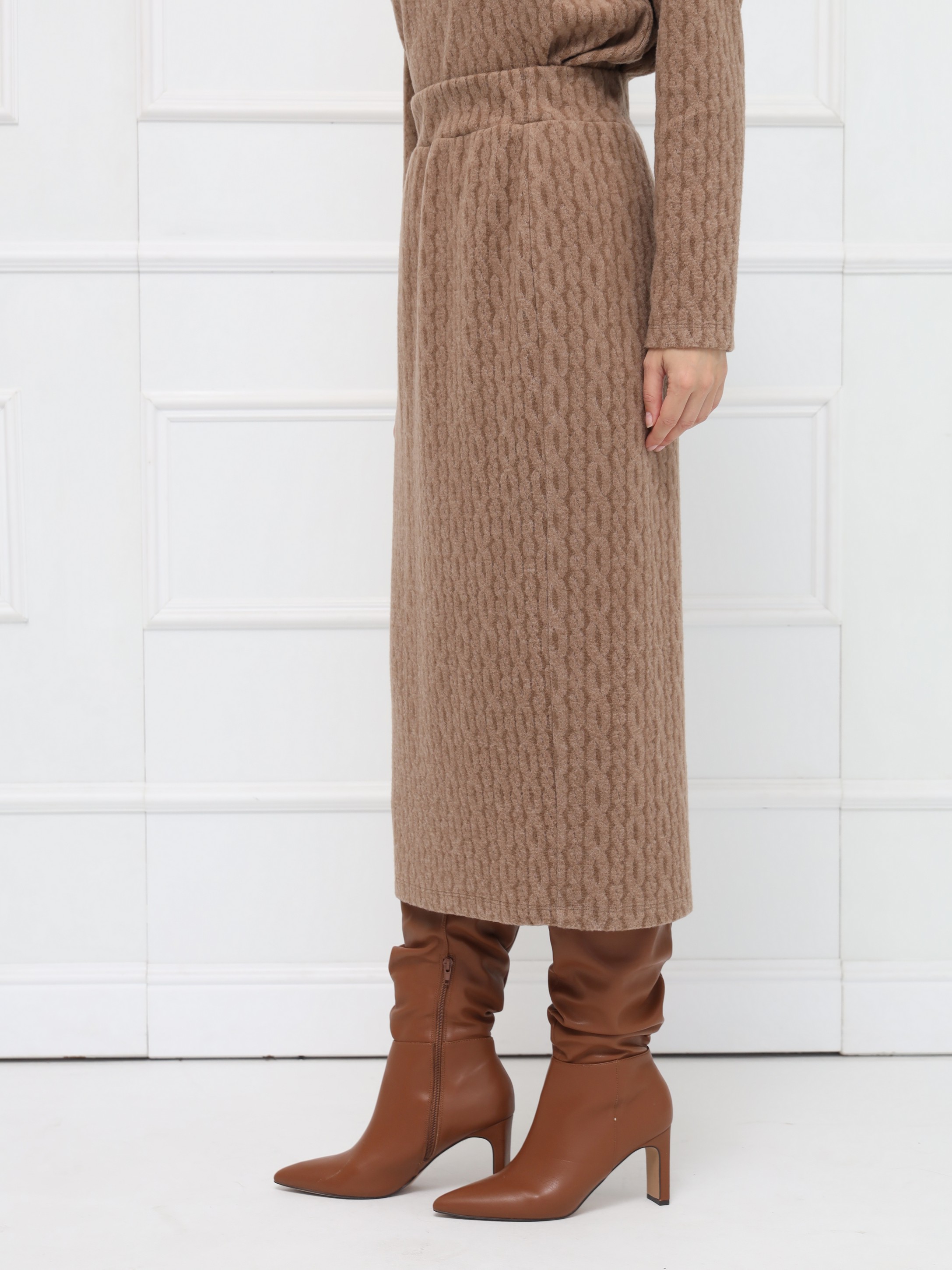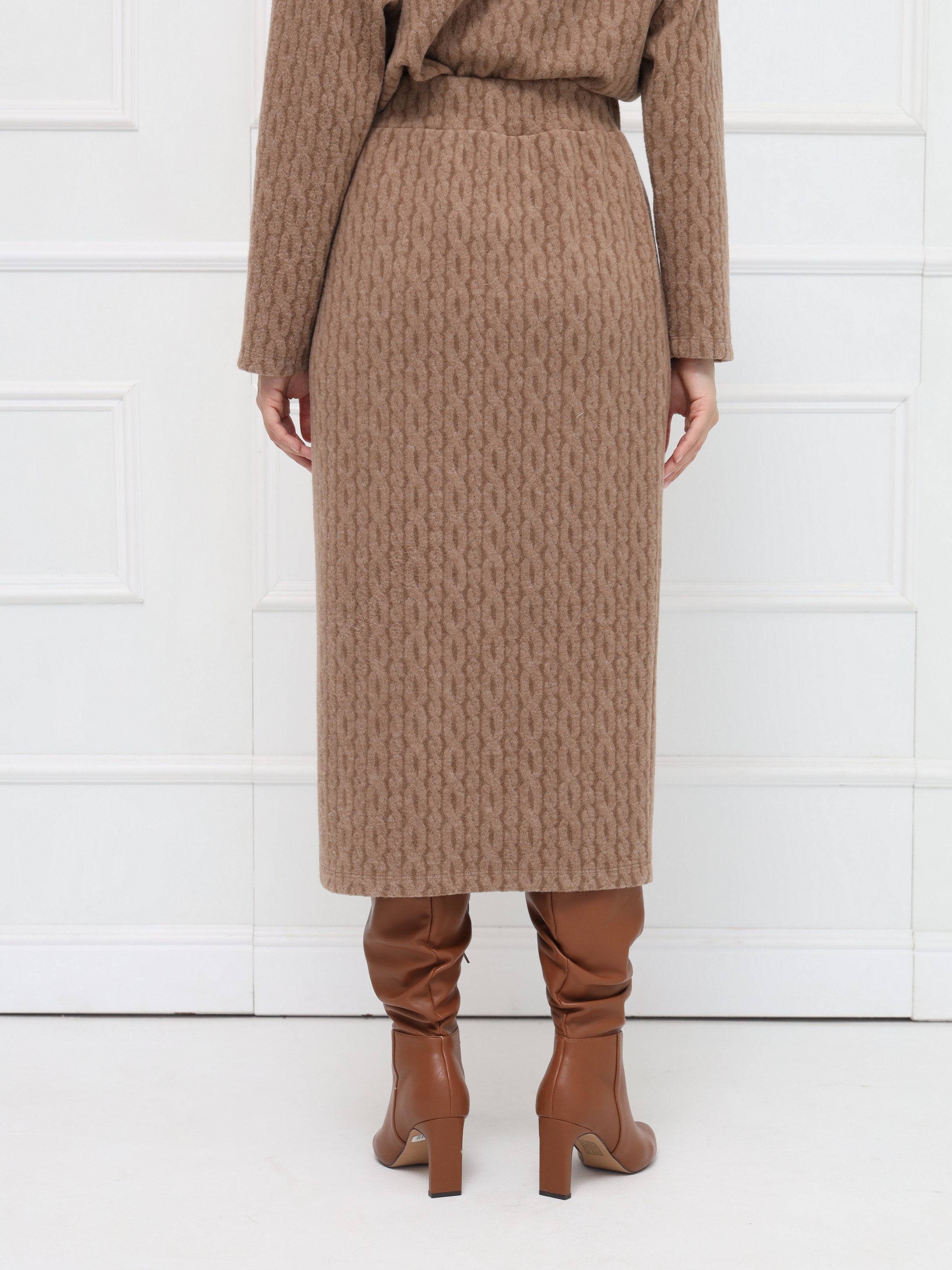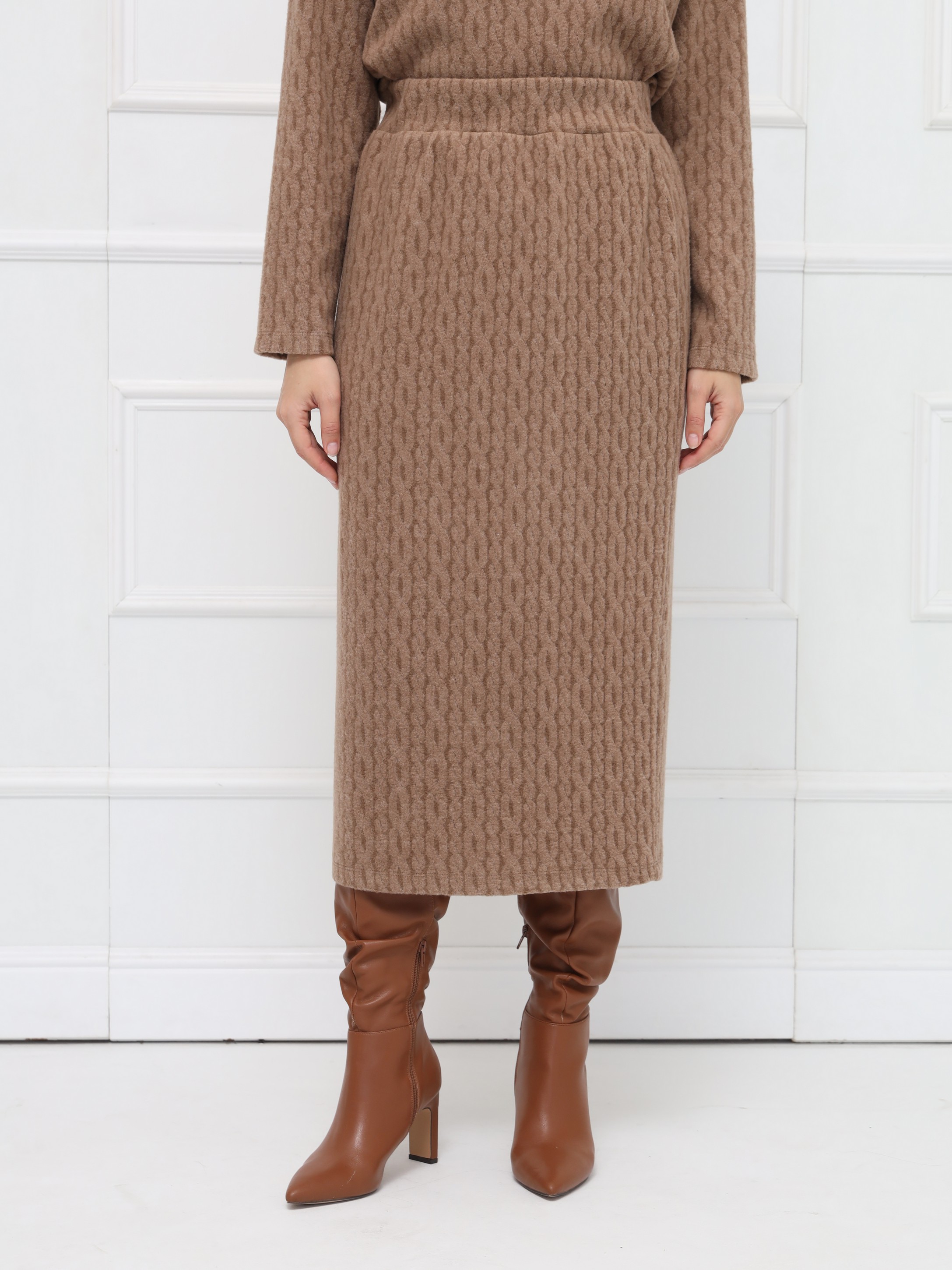Элегантная юбка миди прямого кроя из мягкого тёплого трикотажа с плетением «коса» в оттенке кемел. Легко драпируется, не сковывает движения и дарит комфорт в прохладную погоду. Широкий эластичный пояс мягко фиксирует посадку по талии. Без подкладки.