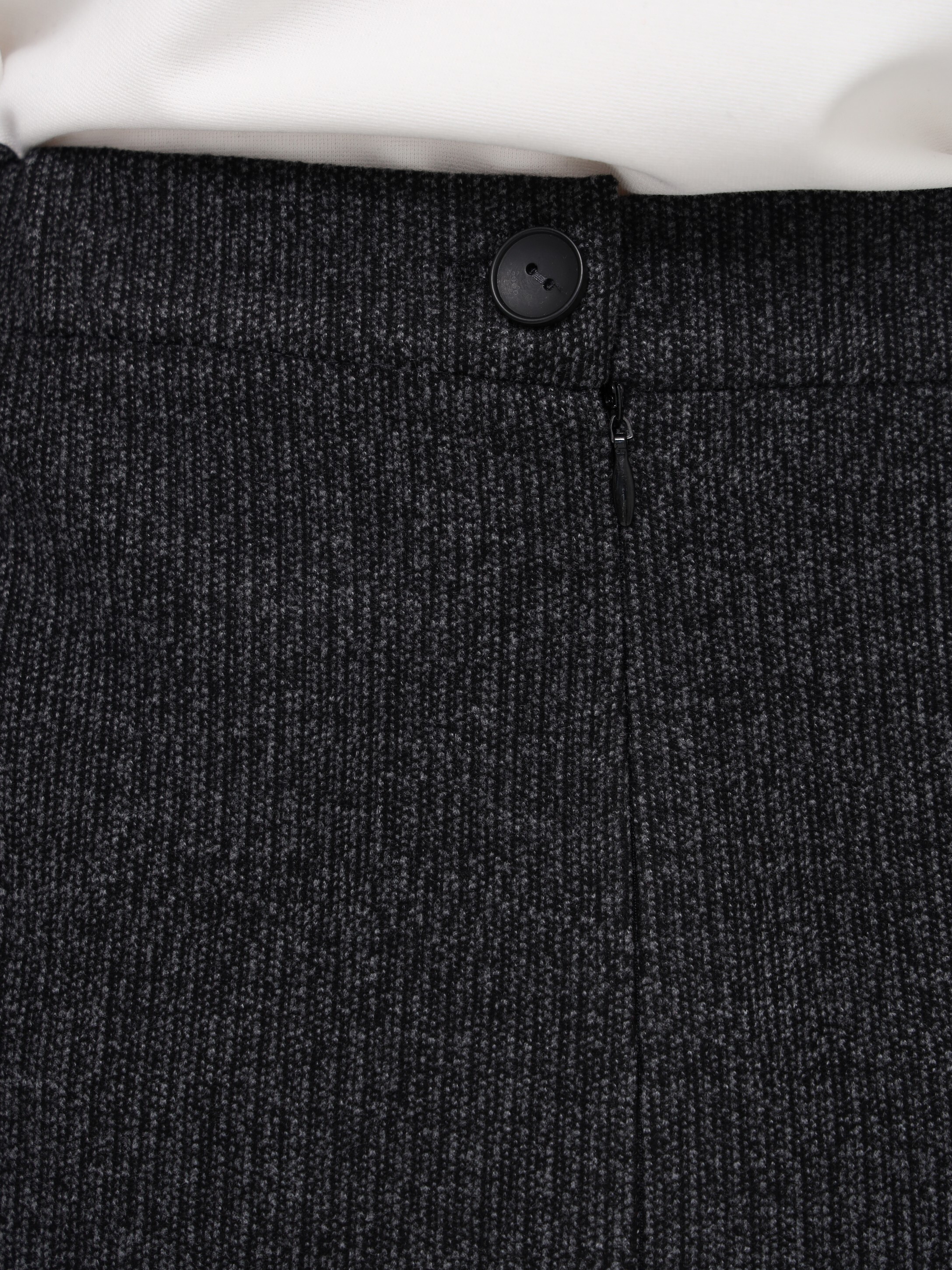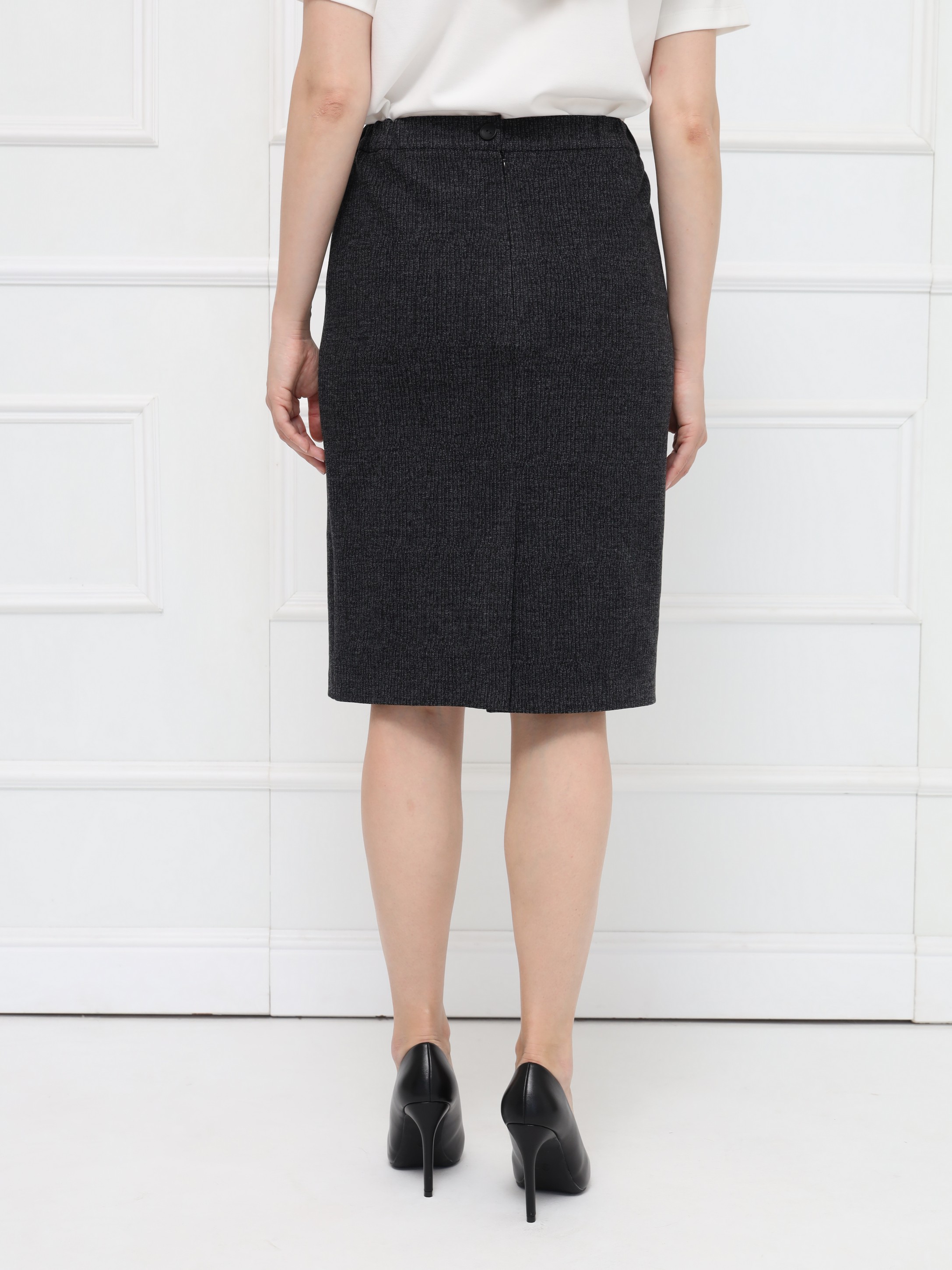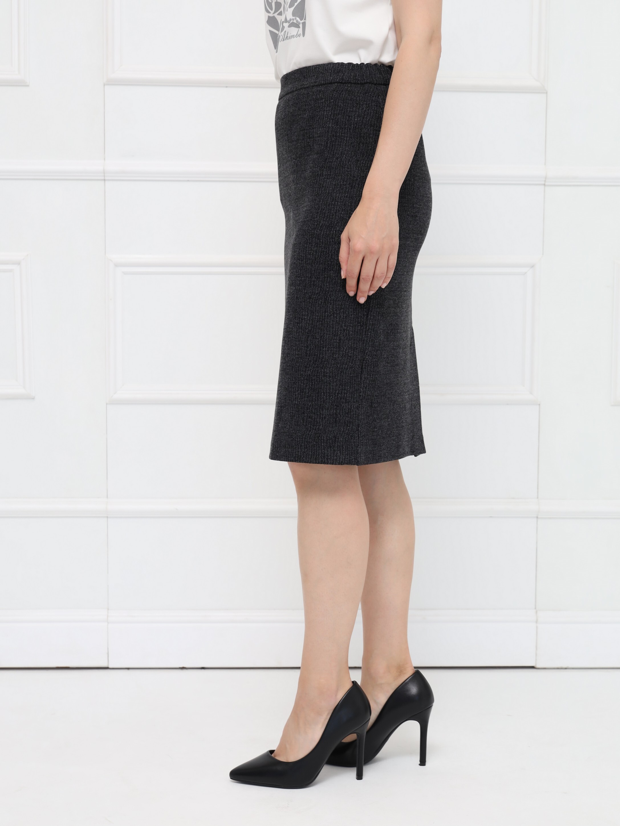 Серая юбка из теплого уютного трикотажа в рубчик. Зауженный книзу крой, длина до середины колена. Застежка на молнию и шлица сзади для удобства. В поясе по бокам — резинка для комфортной посадки.