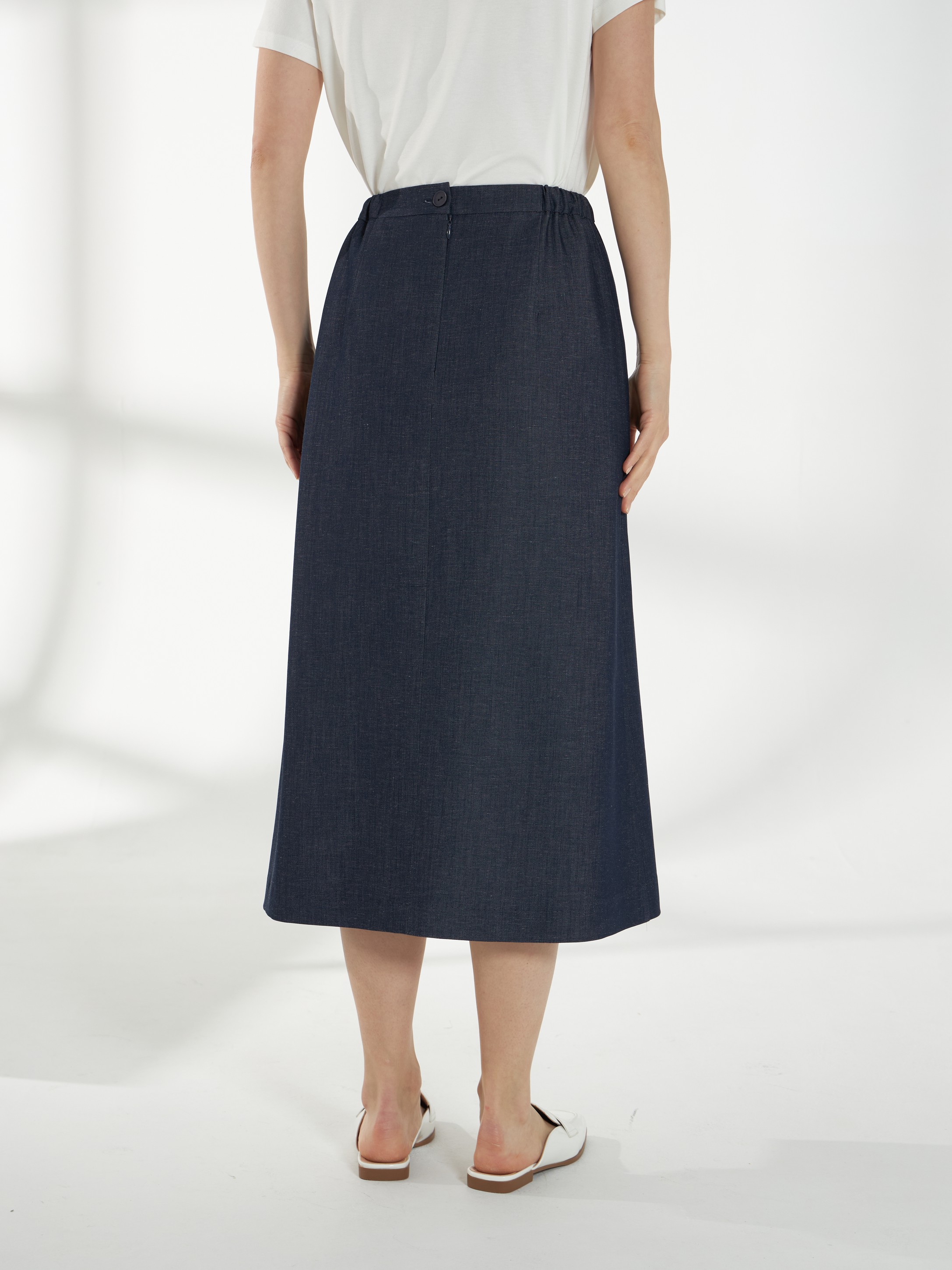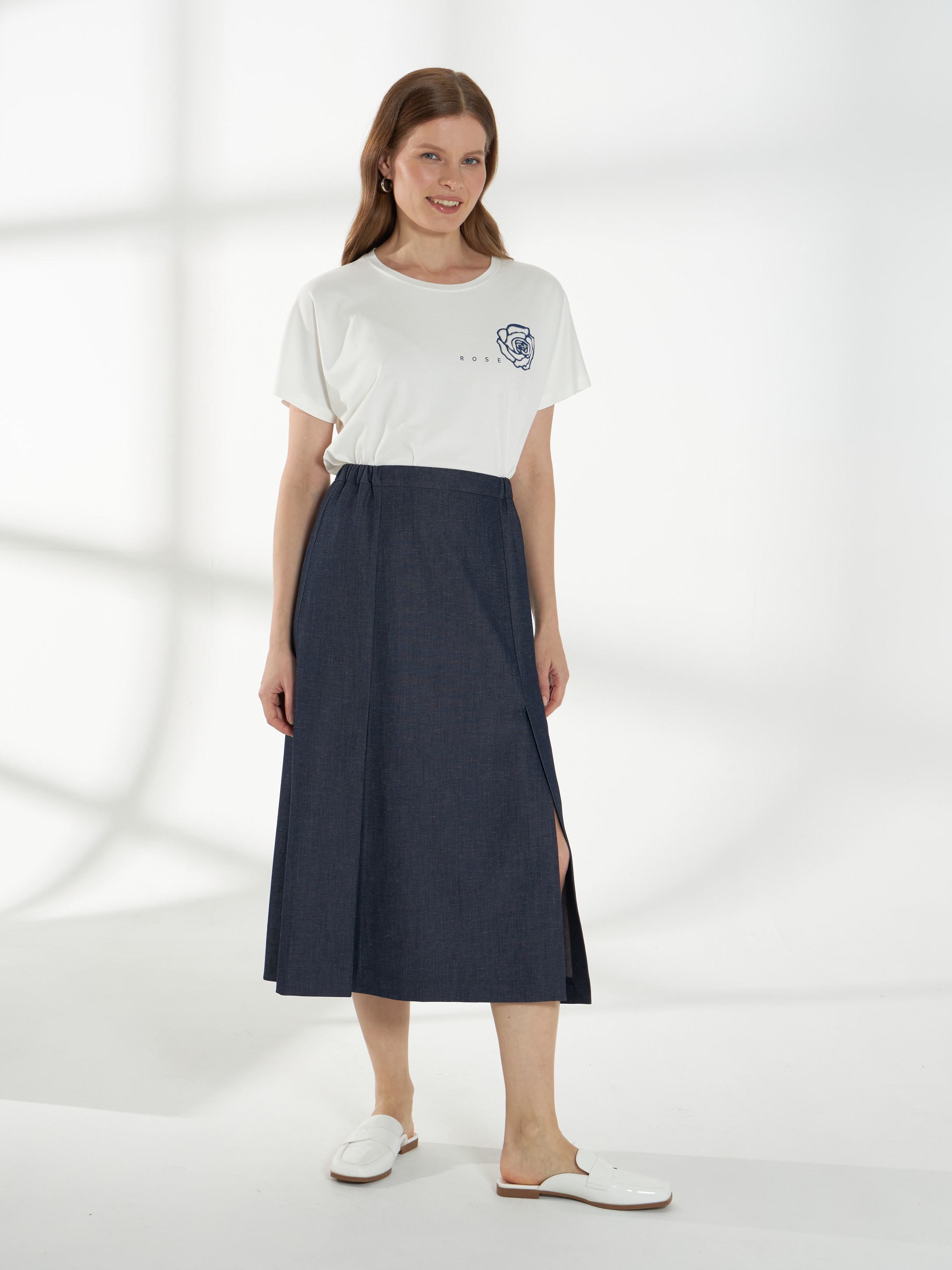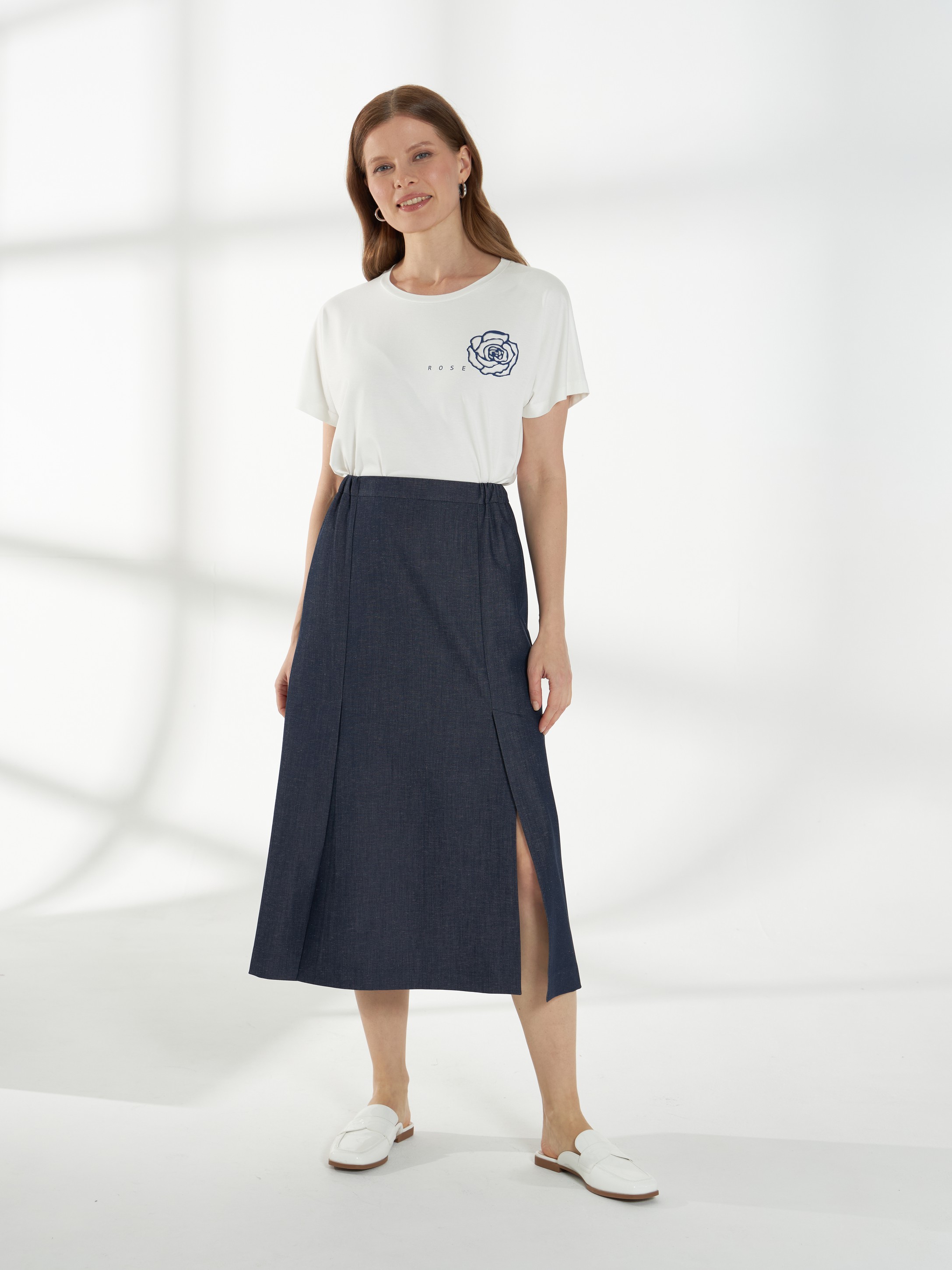 Юбка миди прямого силуэта из ткани с эффектом денима. Спереди-две шлицы, которые открываются при ходьбе и добавляют легкость движению. Пояс с эластичными вставками по бокам обеспечивает комфортную посадку, застежка-потайная молния на спинке. Модель без подкладки, материал дышащий и хорошо держит форму.