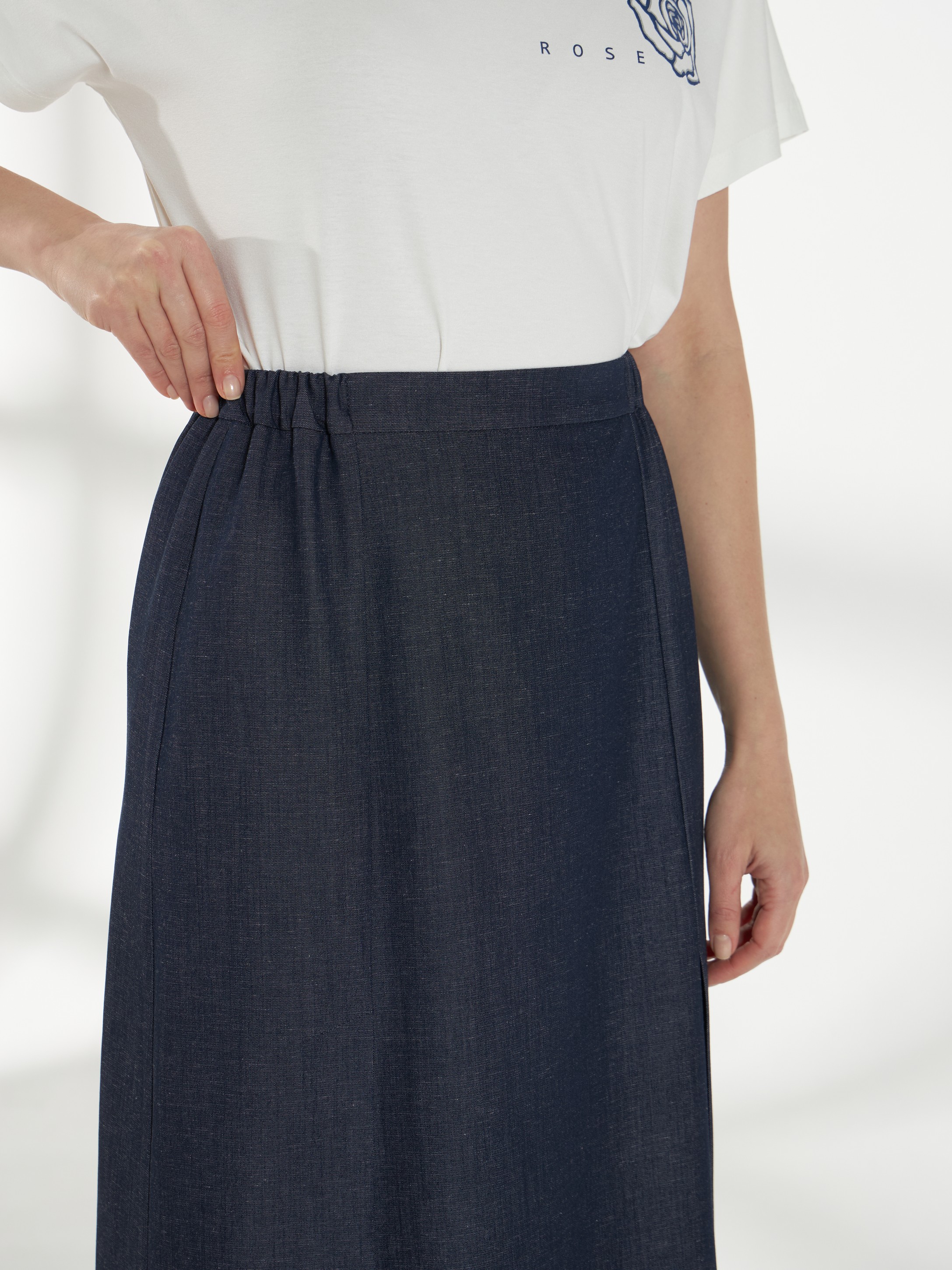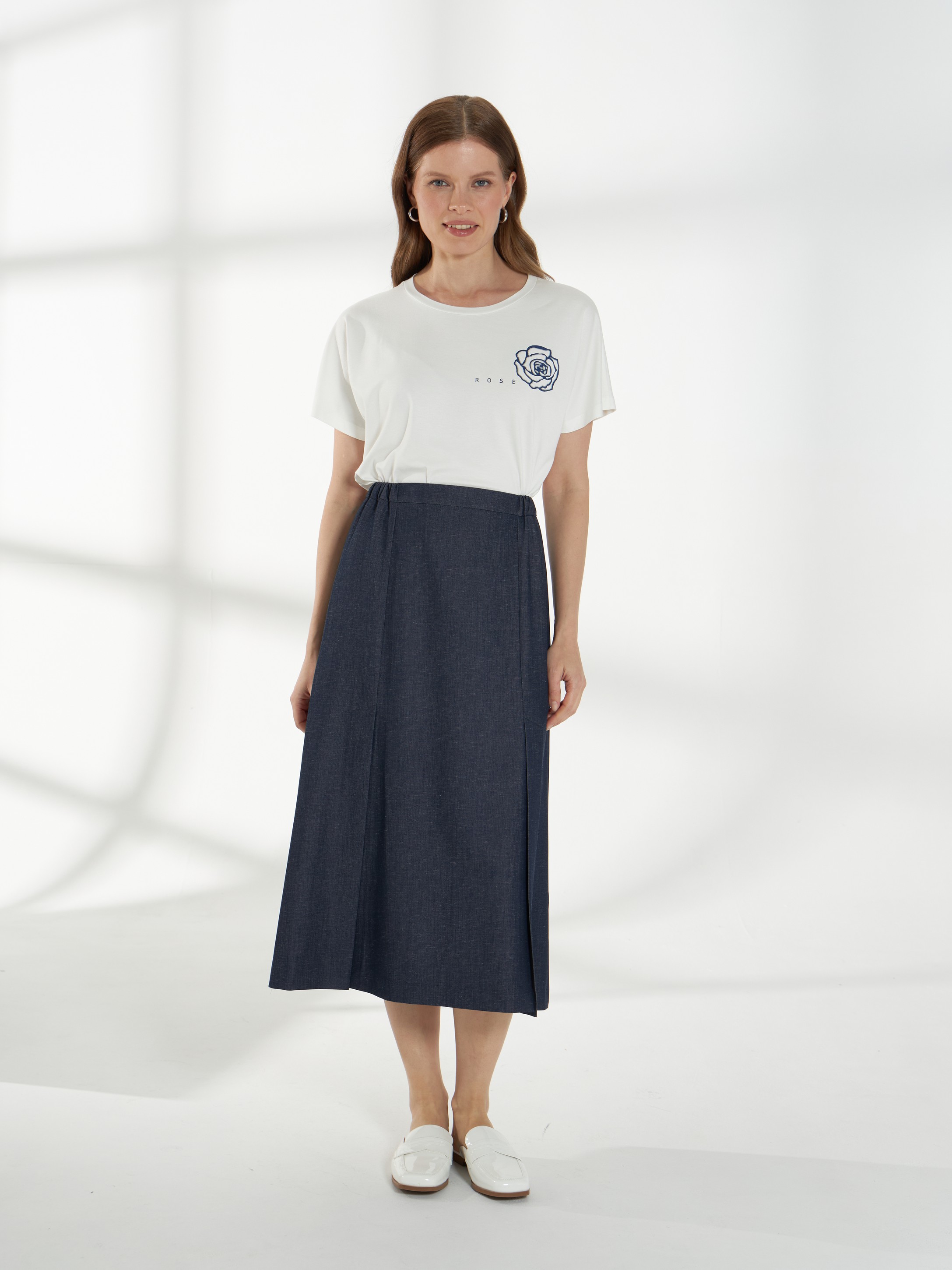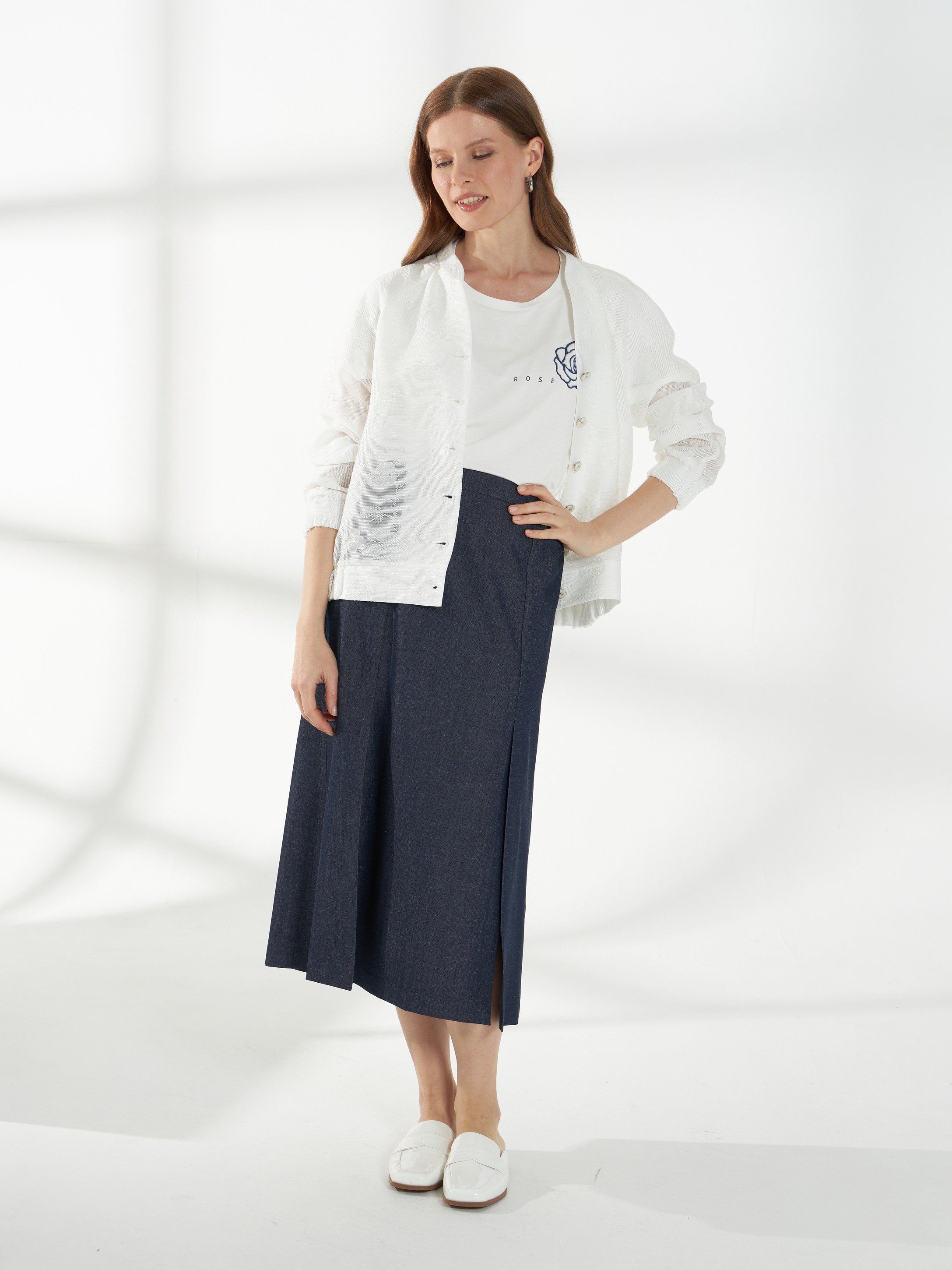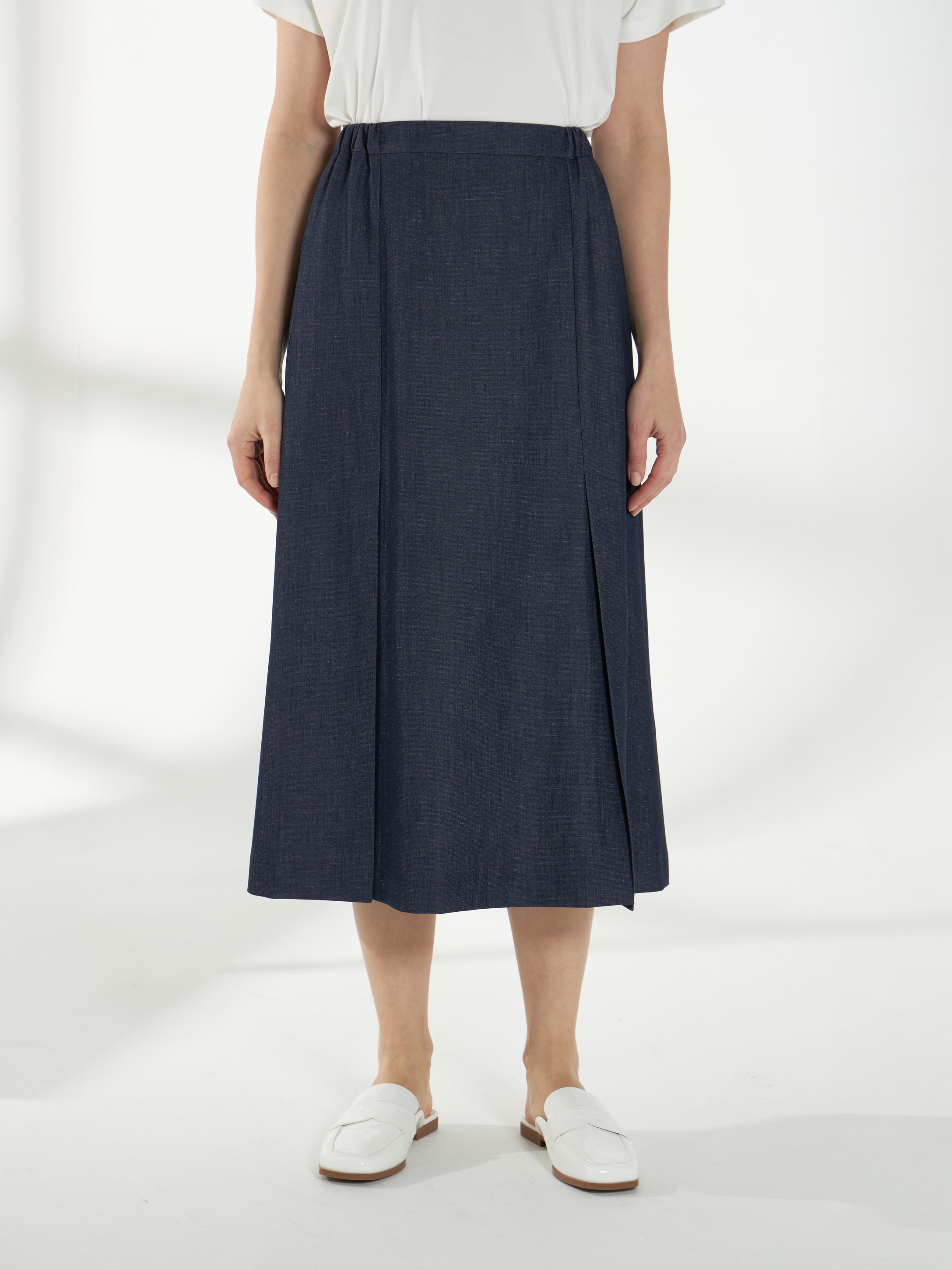 Юбка миди прямого силуэта из ткани с эффектом денима. Спереди-две шлицы, которые открываются при ходьбе и добавляют легкость движению. Пояс с эластичными вставками по бокам обеспечивает комфортную посадку, застежка-потайная молния на спинке. Модель без подкладки, материал дышащий и хорошо держит форму.
