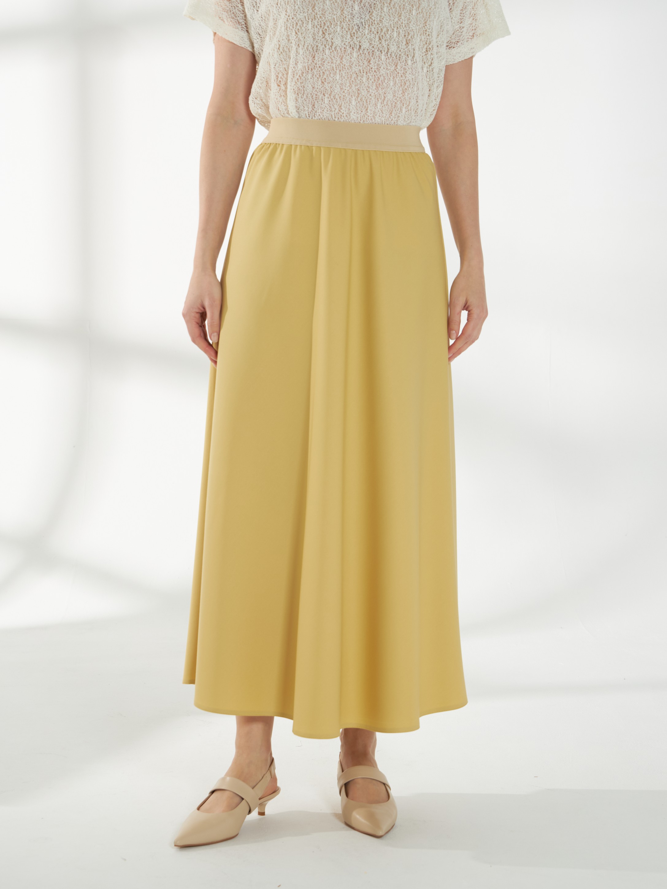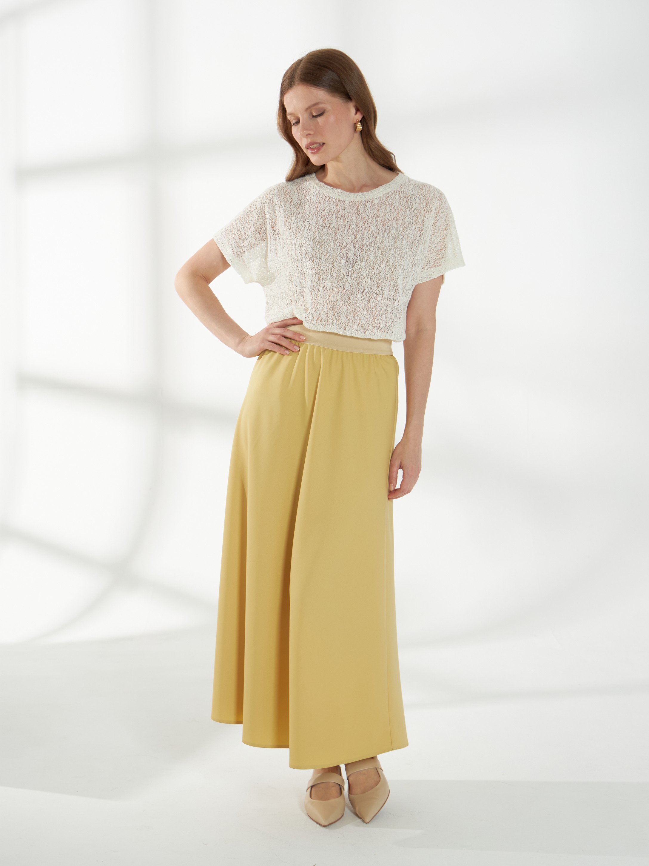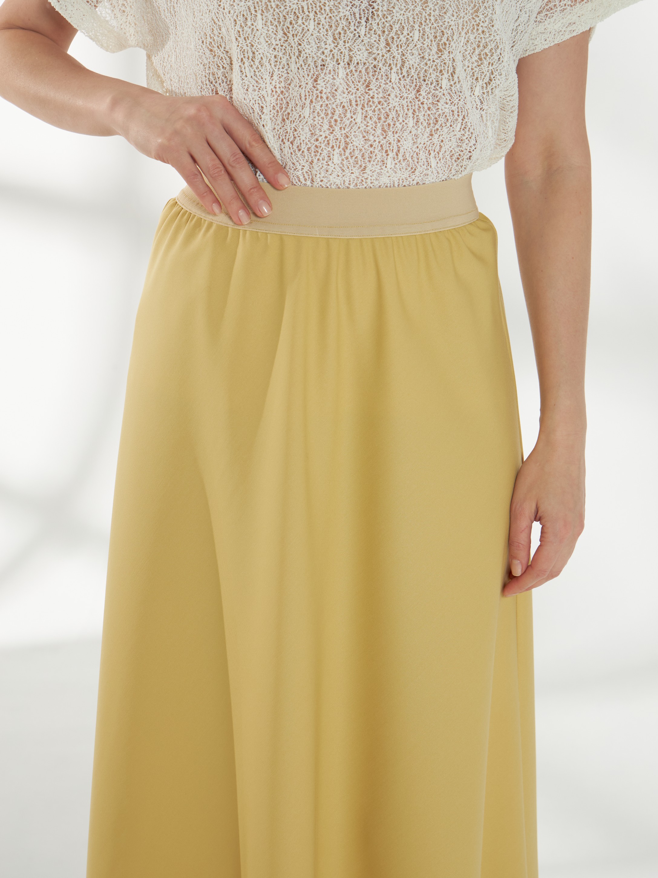 Юбка миди трапециевидного кроя, в светлом горчичном оттенке, слегка расширяющаяся к низу. Пояс-резинка обеспечивает комфортную посадку, а свободный силуэт создаёт лёгкий и непринуждённый образ.