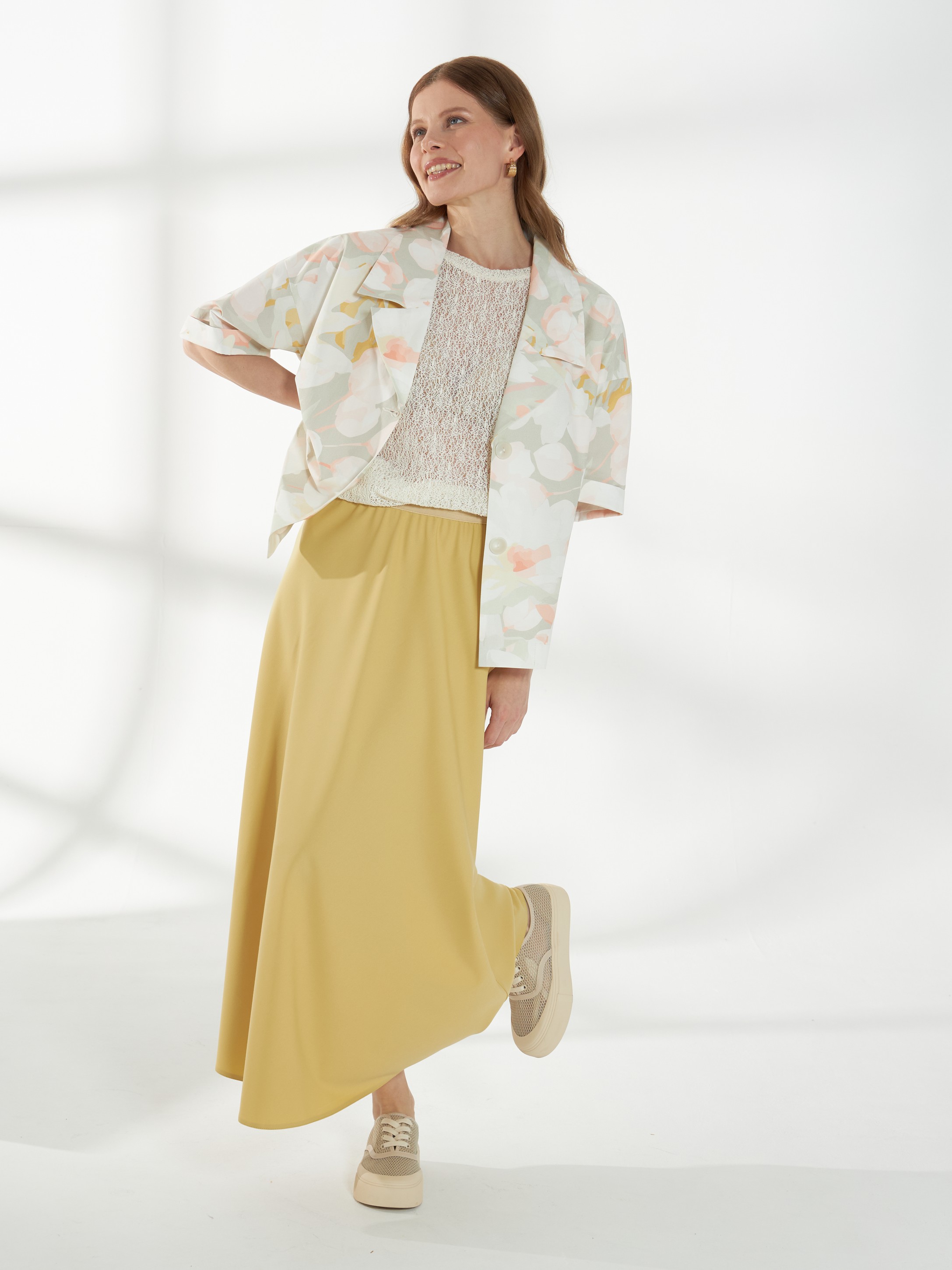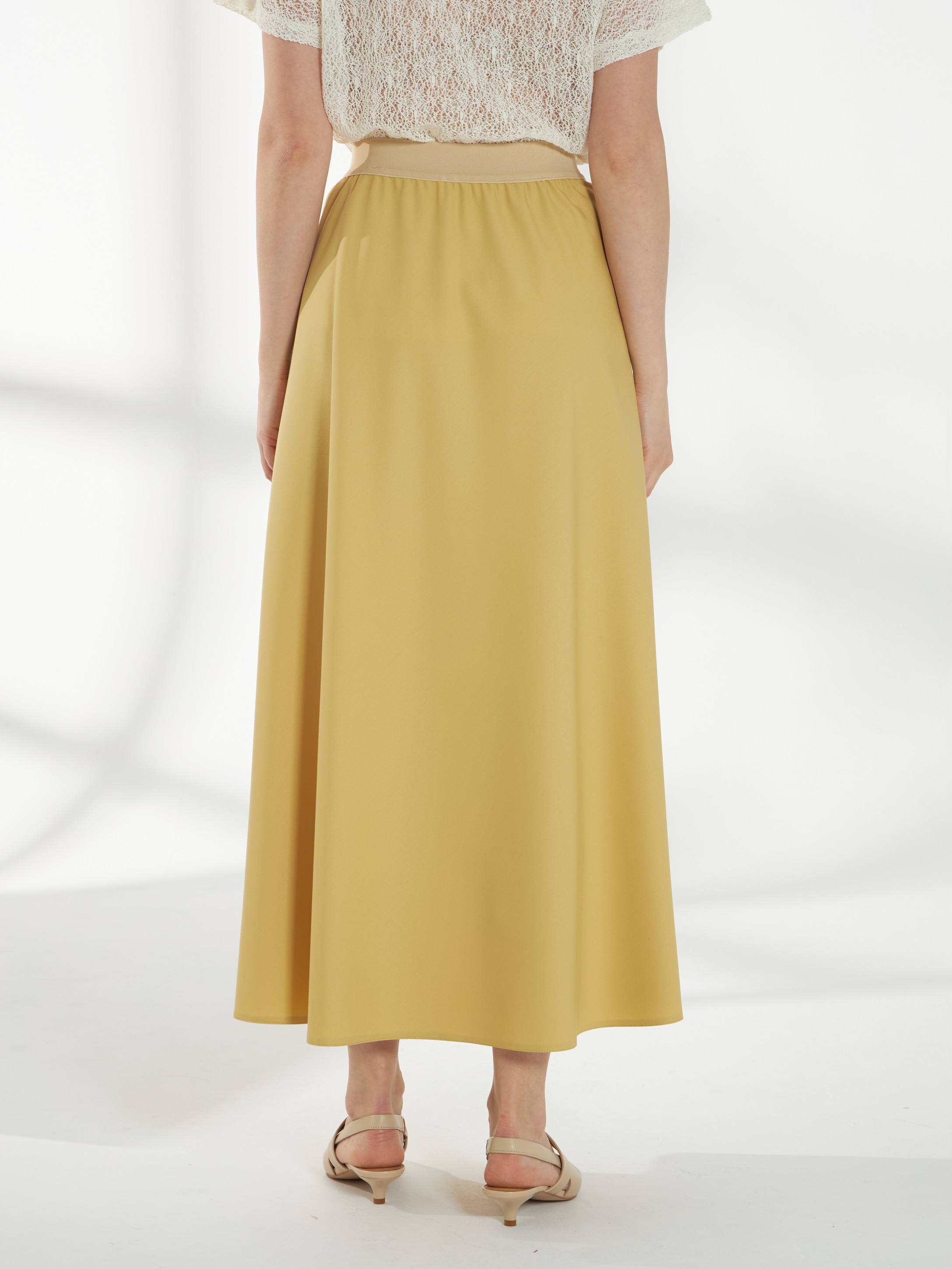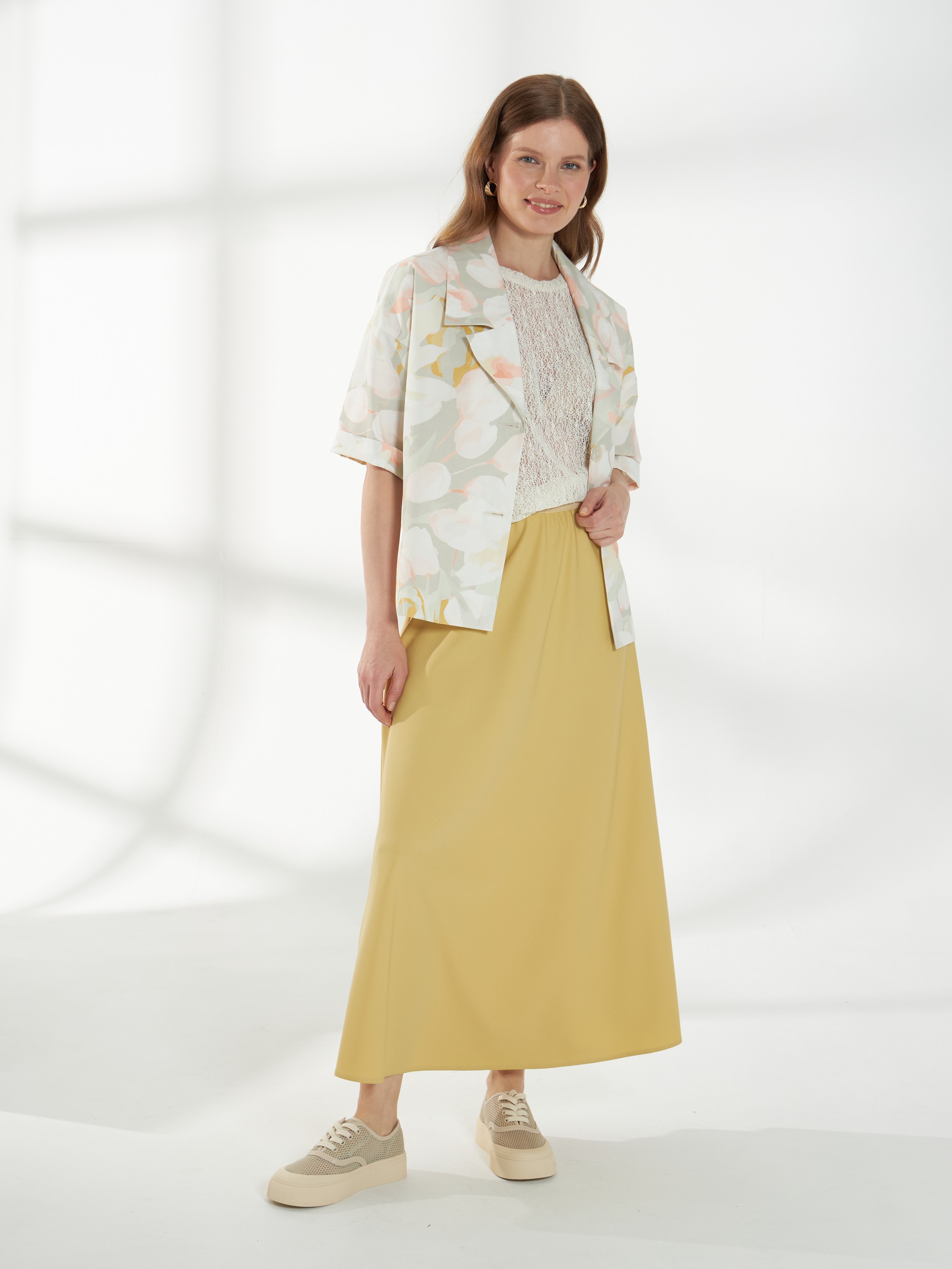 Юбка миди трапециевидного кроя, в светлом горчичном оттенке, слегка расширяющаяся к низу. Пояс-резинка обеспечивает комфортную посадку, а свободный силуэт создаёт лёгкий и непринуждённый образ.